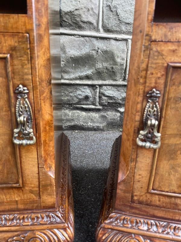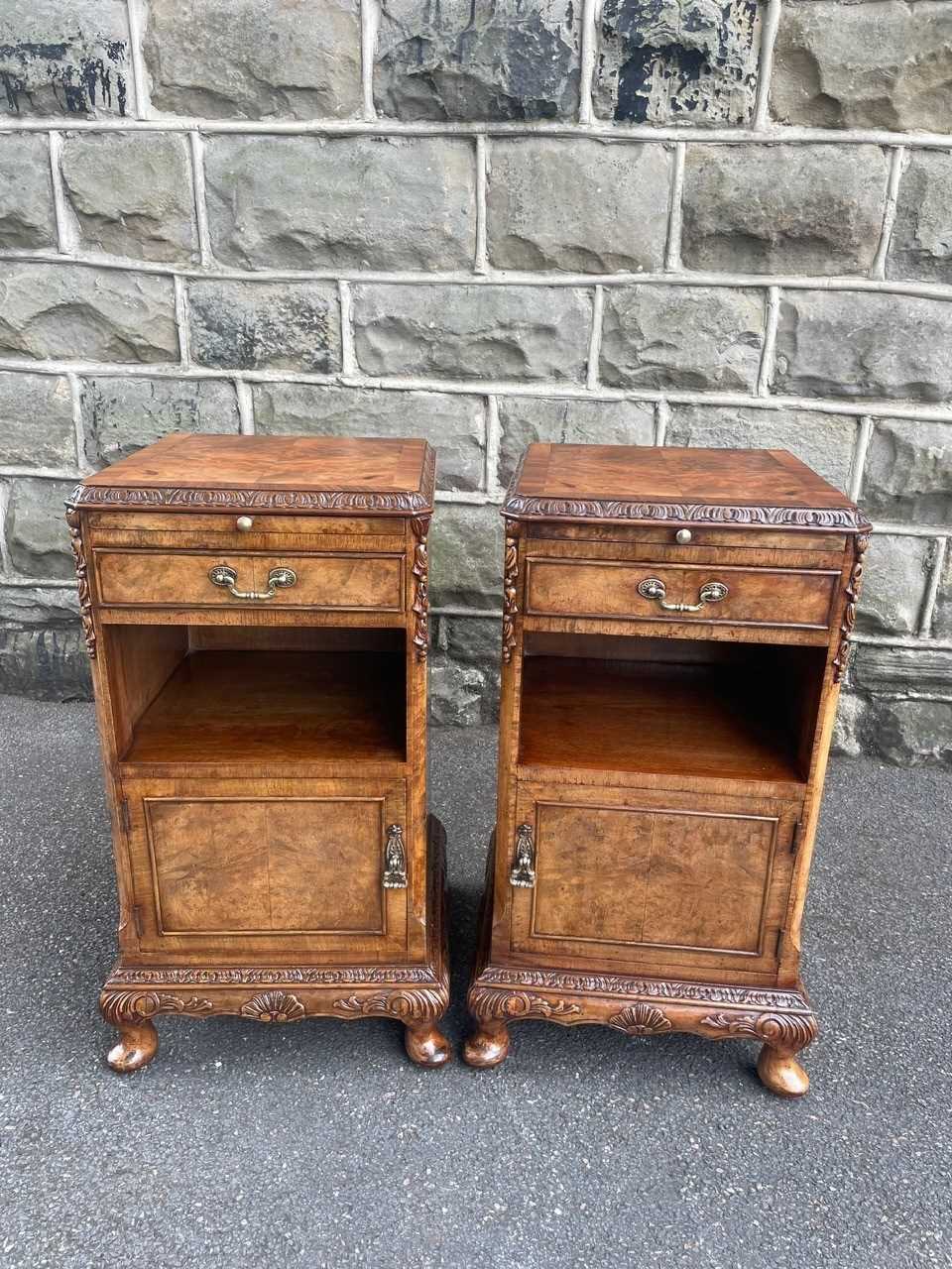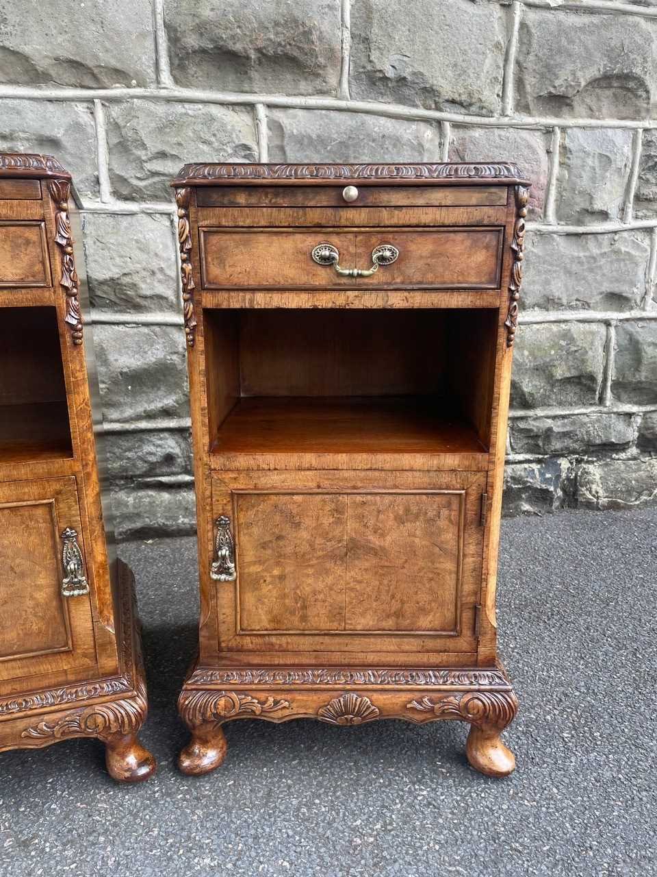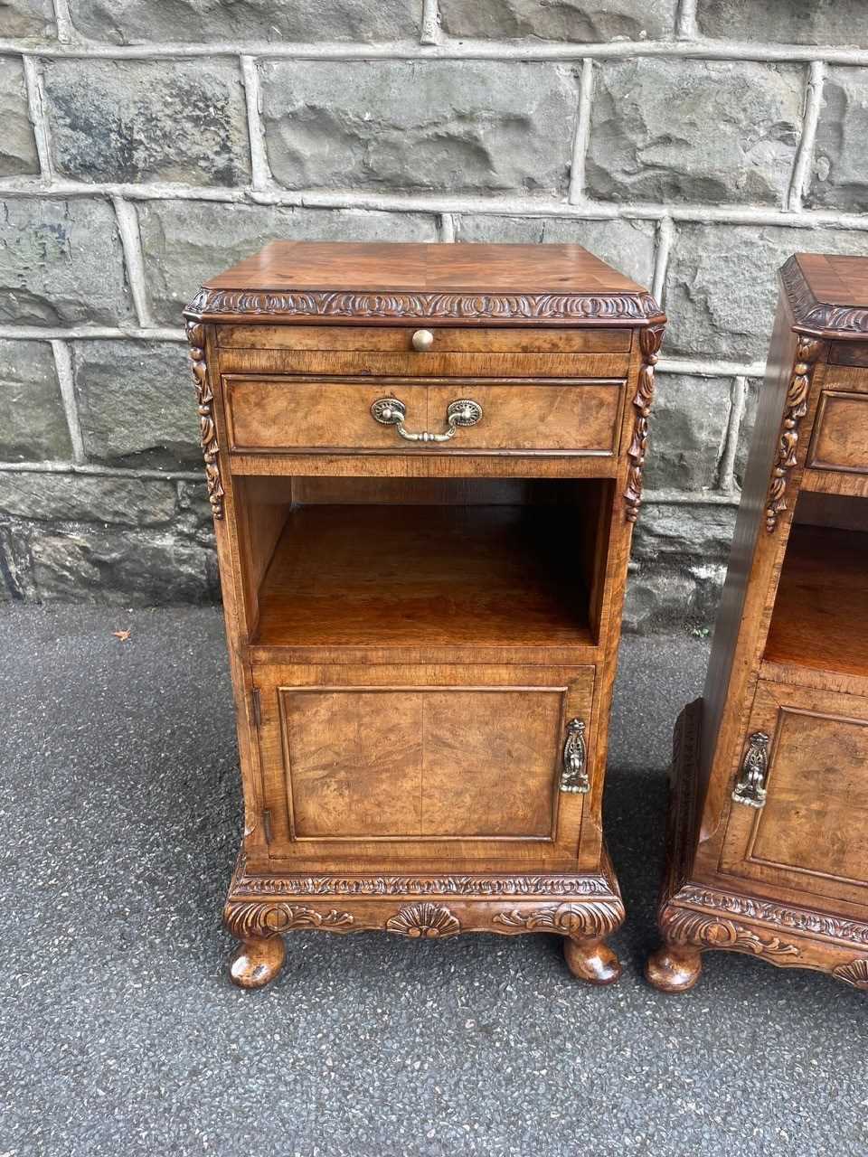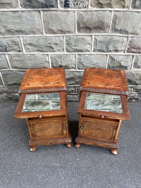 Each has book matched burr walnut tops with cross banded border, pull out inset mirror top slides, single draw with brass handle, open storage area beneath, burr walnut cupboard doors with brass knob handles standing on small carved cabriole feet with carved decoration around the frieze. Polished walnut sides with solid back.