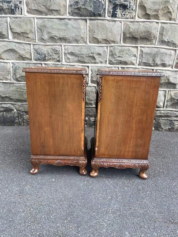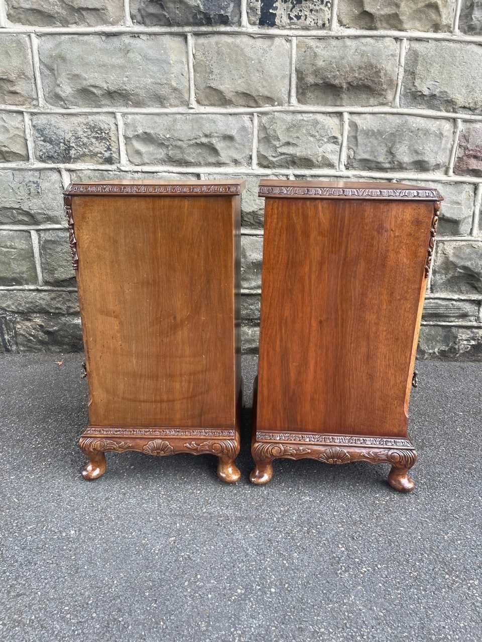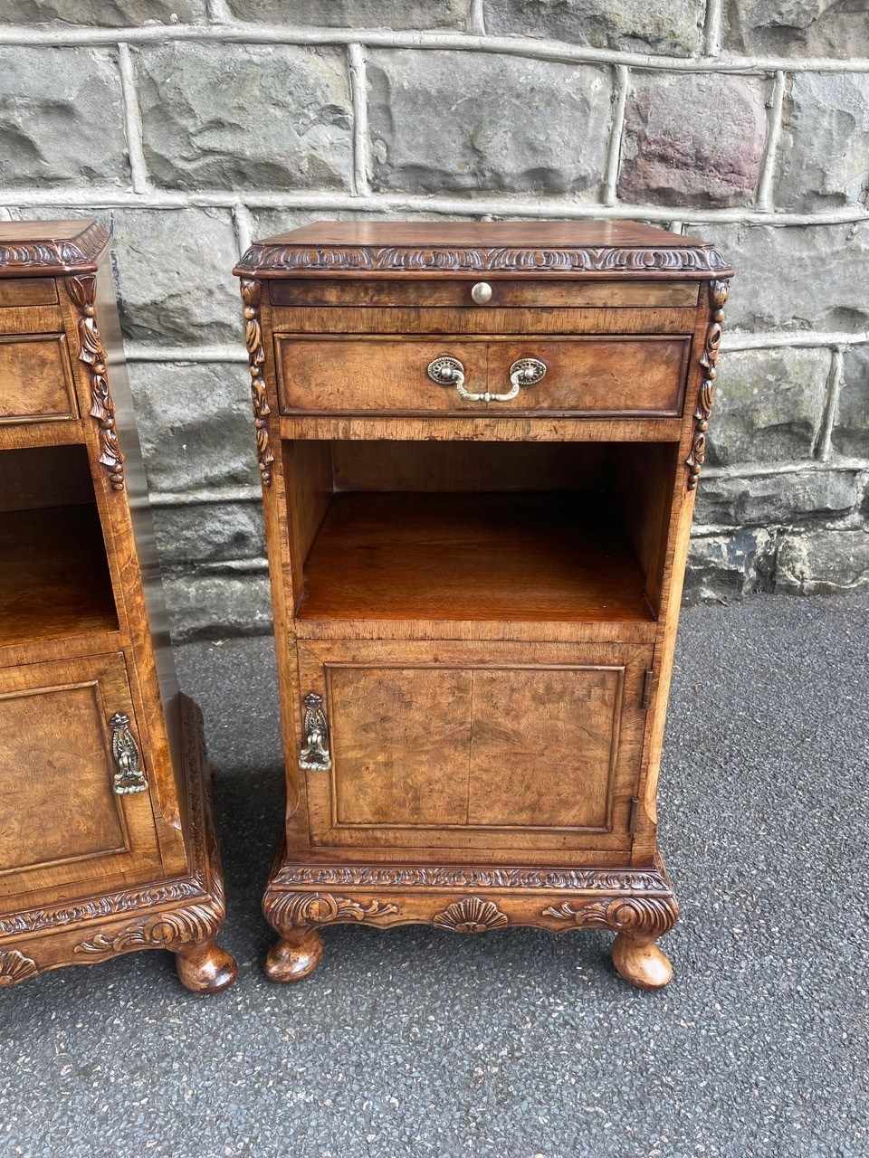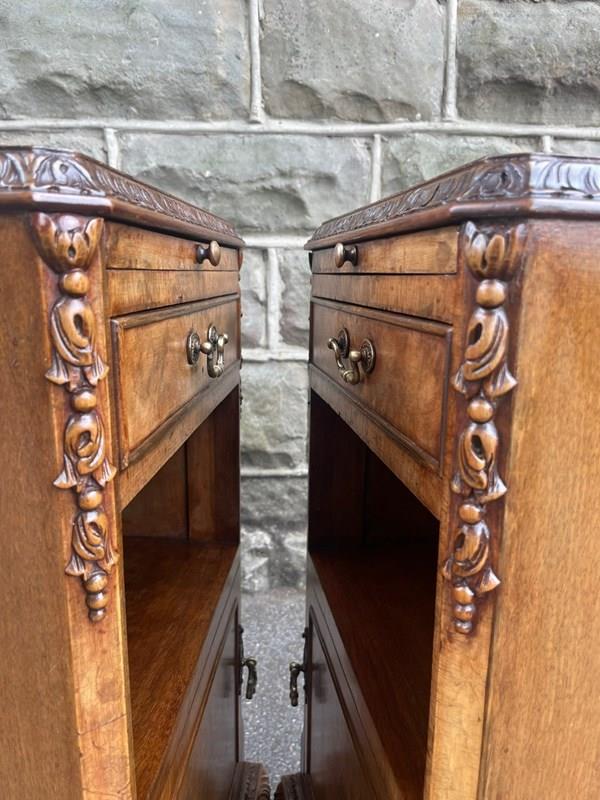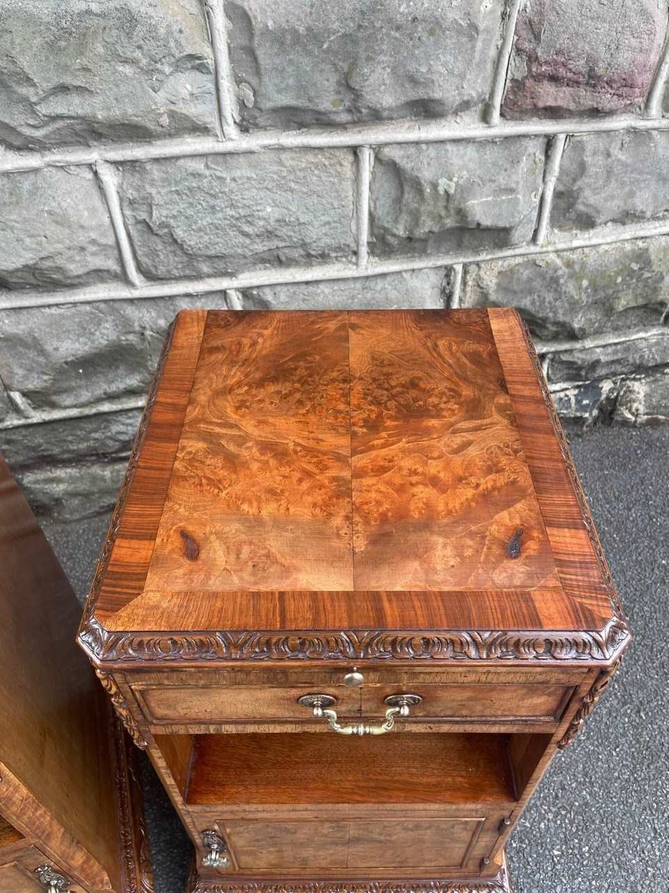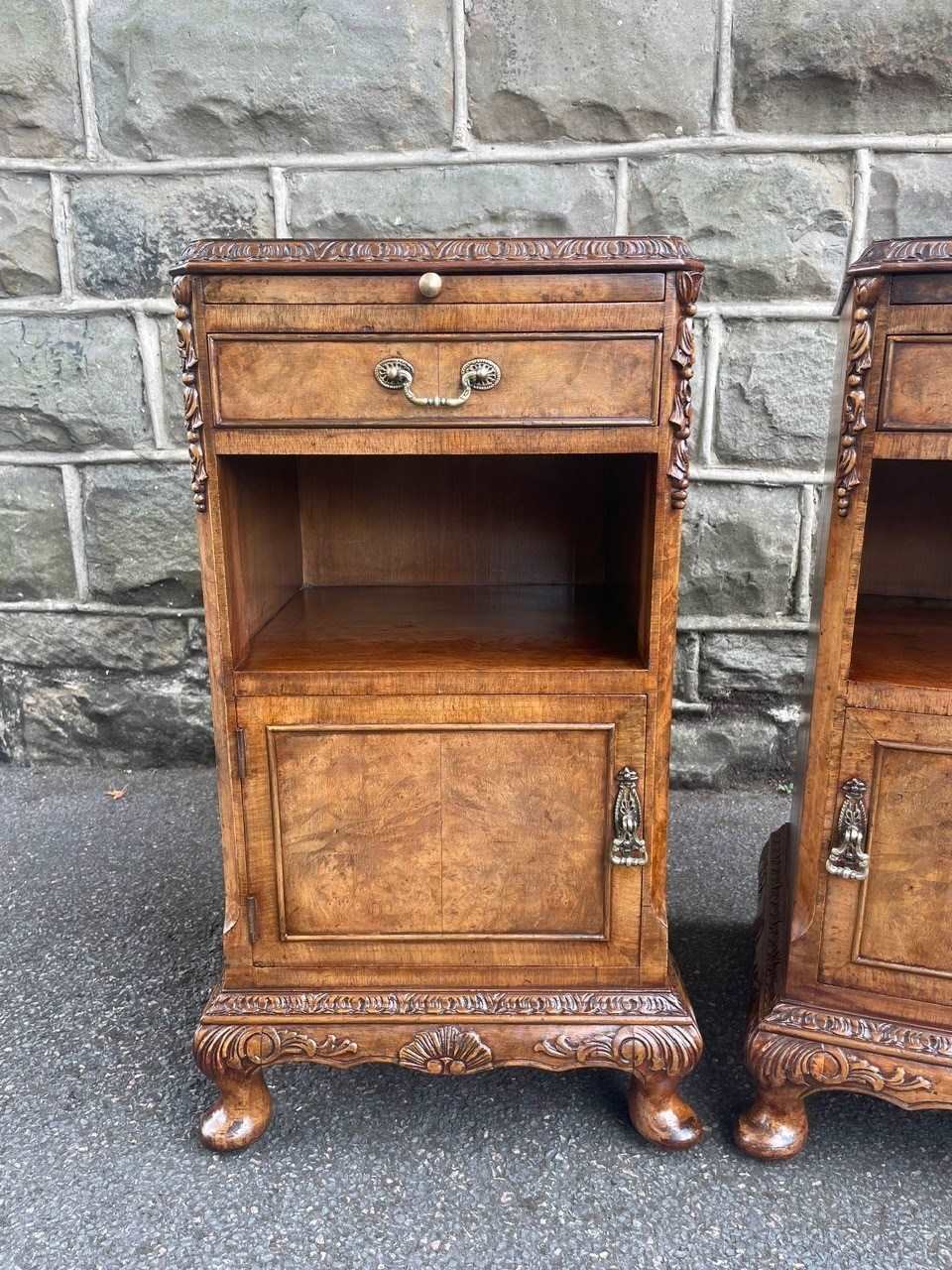Each has book matched burr walnut tops with cross banded border, pull out inset mirror top slides, single draw with brass handle, open storage area beneath, burr walnut cupboard doors with brass knob handles standing on small carved cabriole feet with carved decoration around the frieze. Polished walnut sides with solid back.