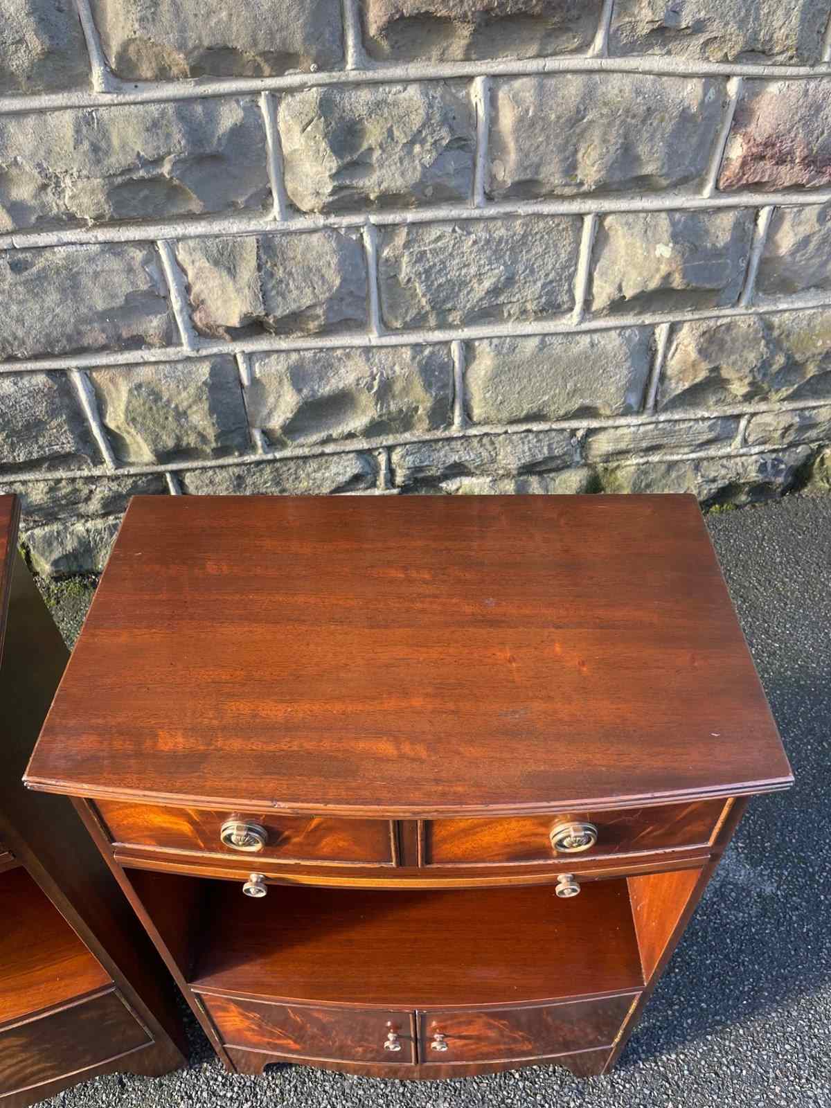 In mahogany, bow fronted having 2 small draws with brass ring handles, pull out slides, open storage area with a pair of cupboard doors below. Polished mahogany sides standing on splayed bracket feet with a shaped apron.