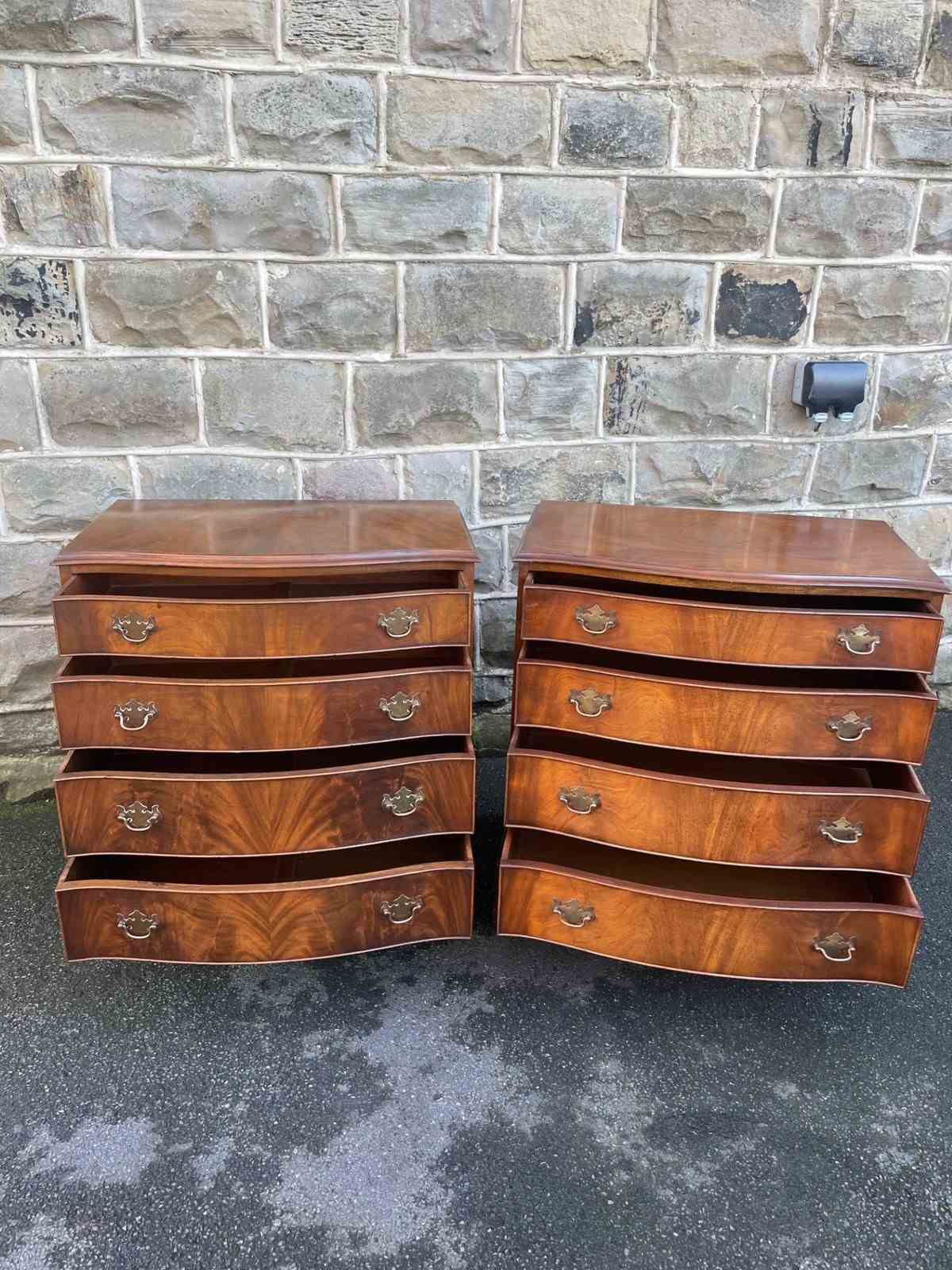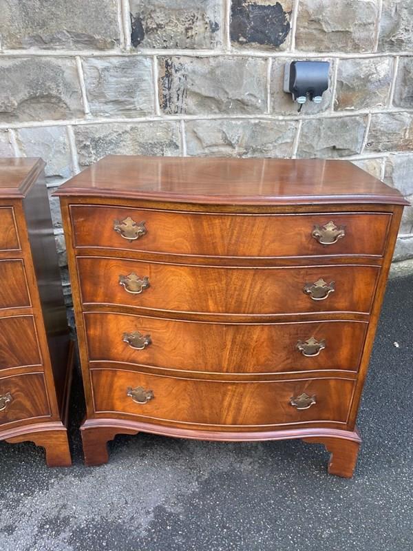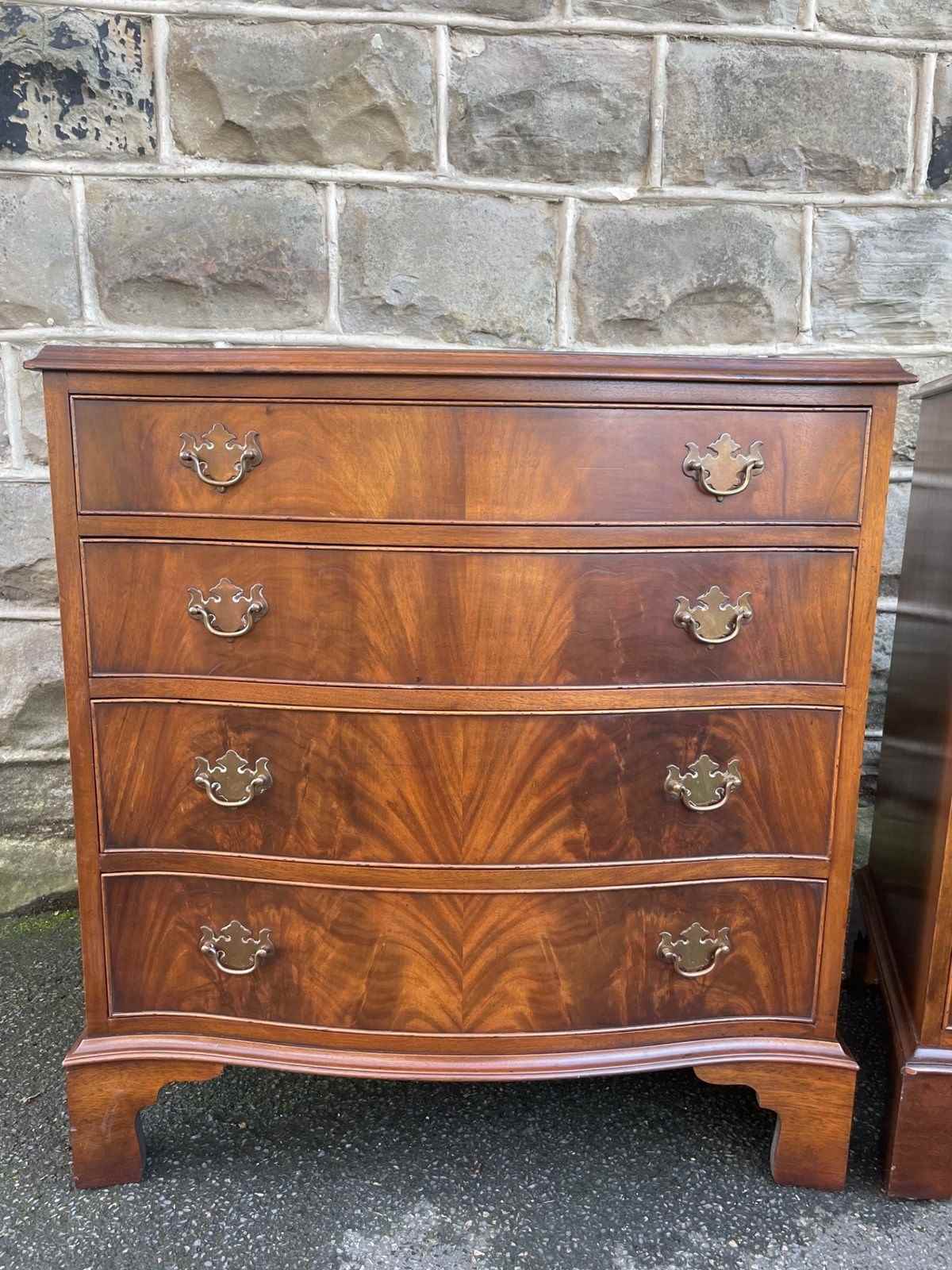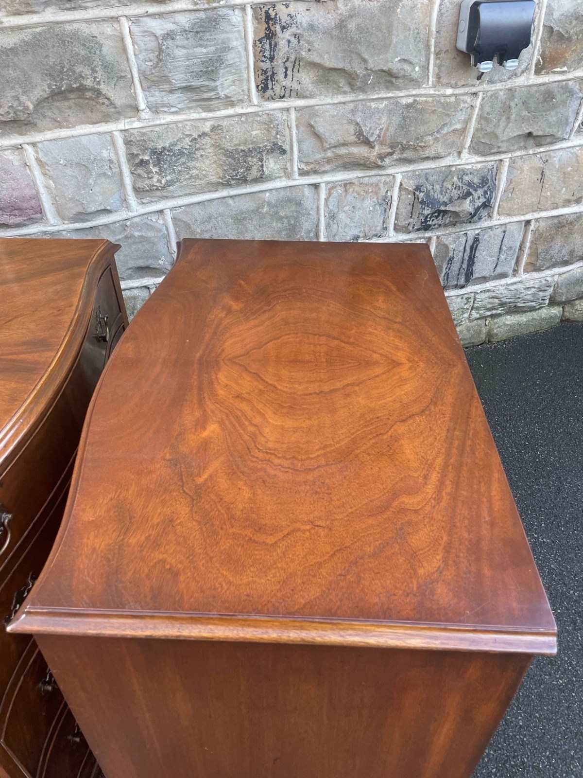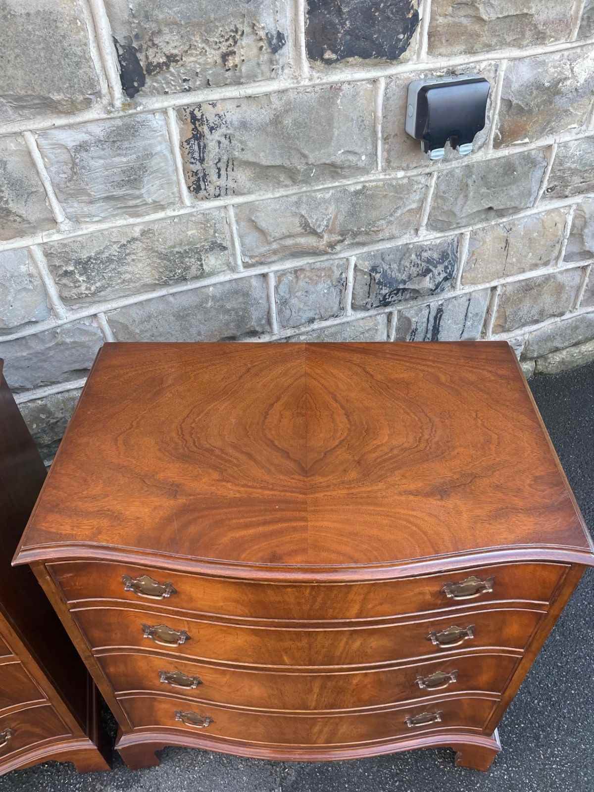 In walnut, serpentine front, 4 draws with ornate brass drop handles, polished walnut sides standing on bracket feet