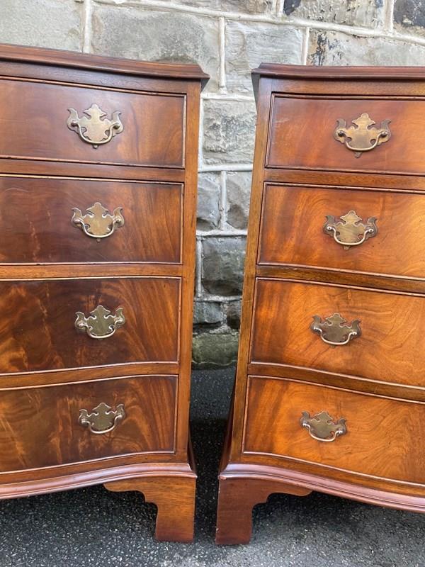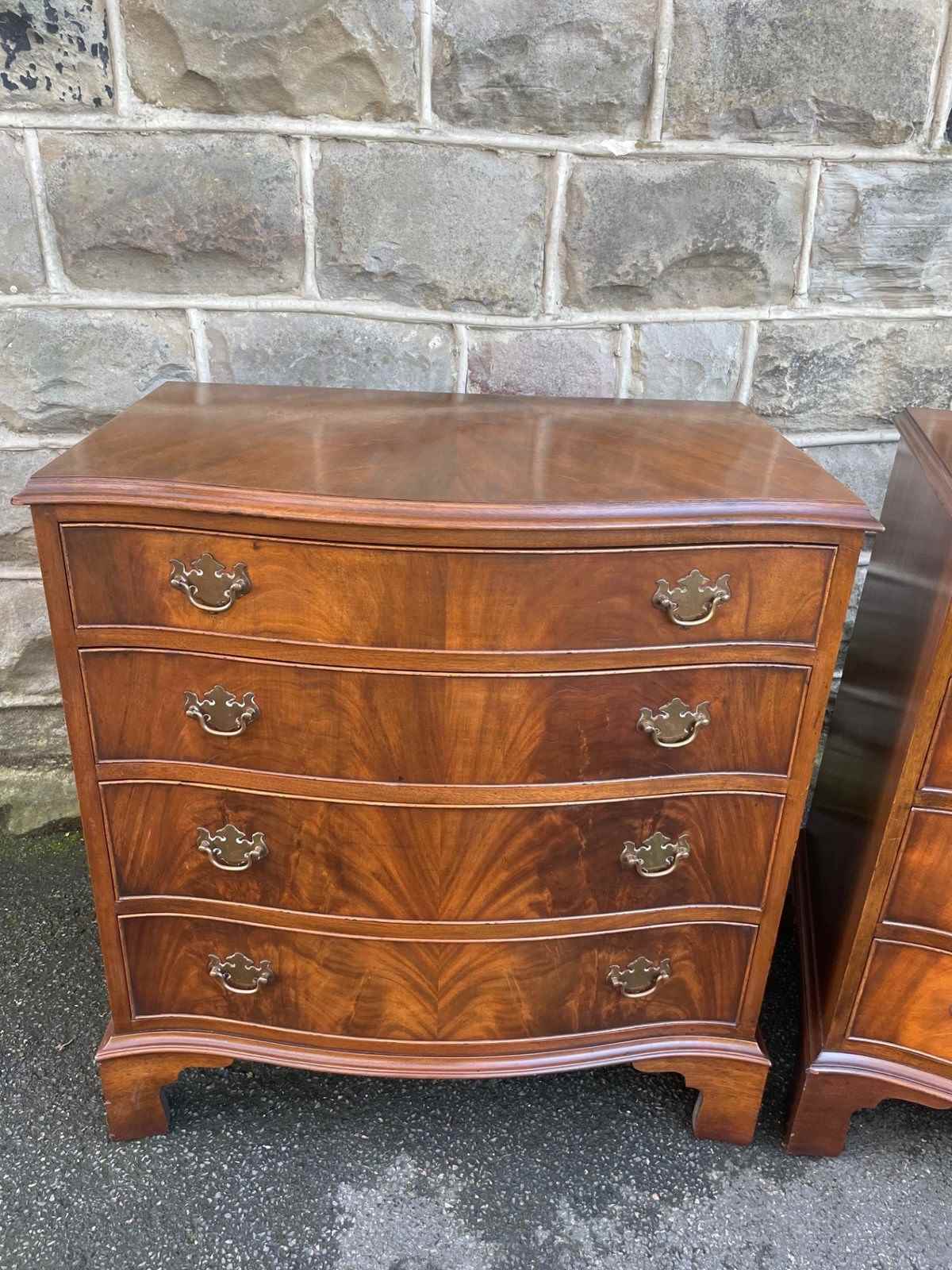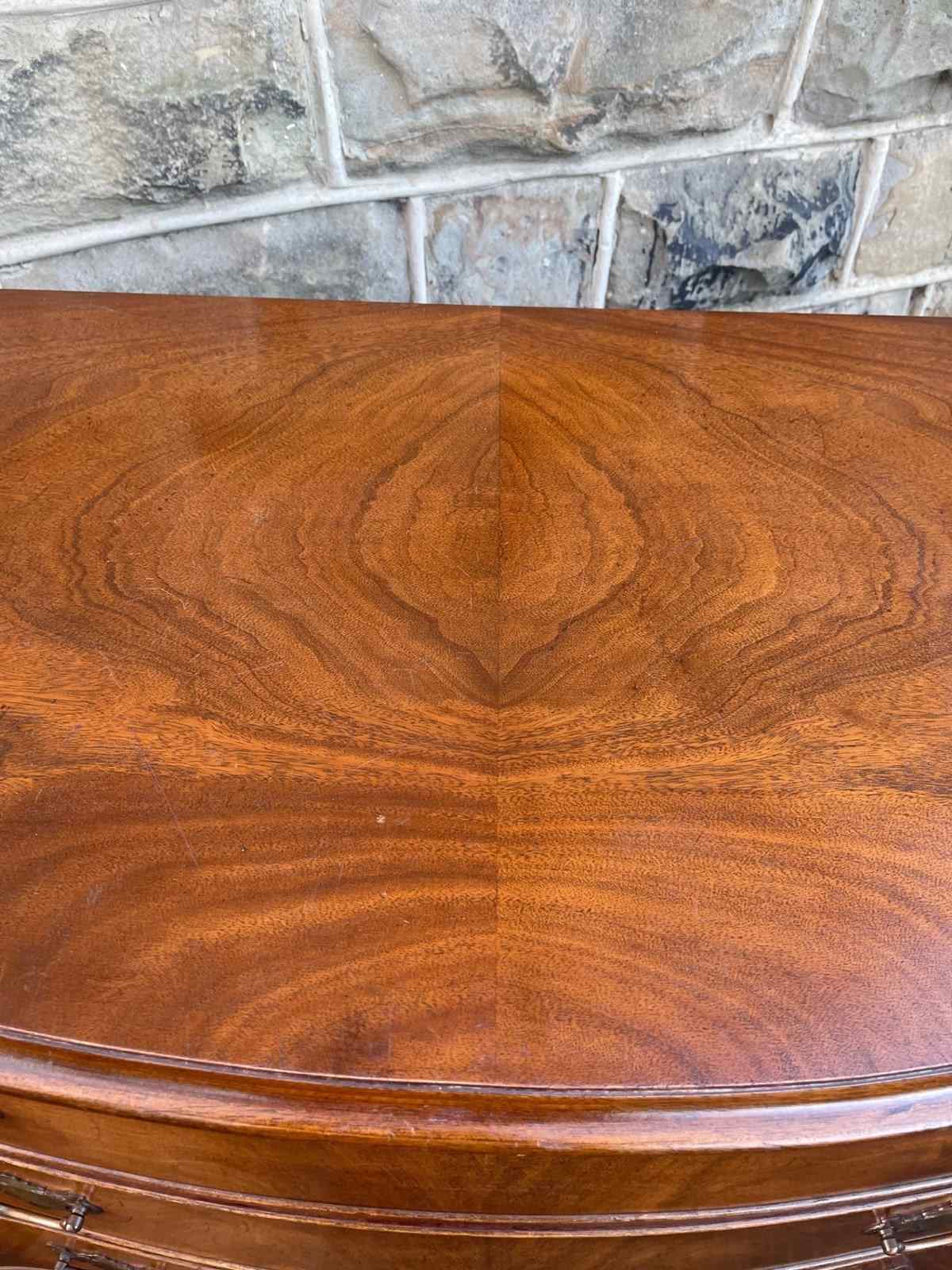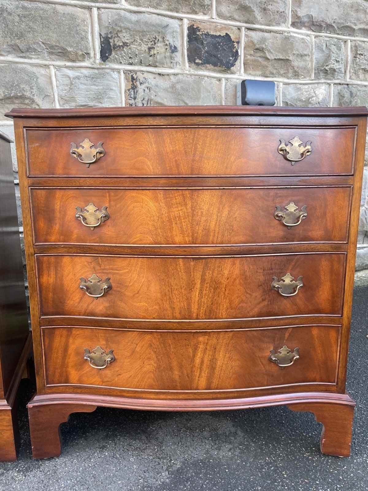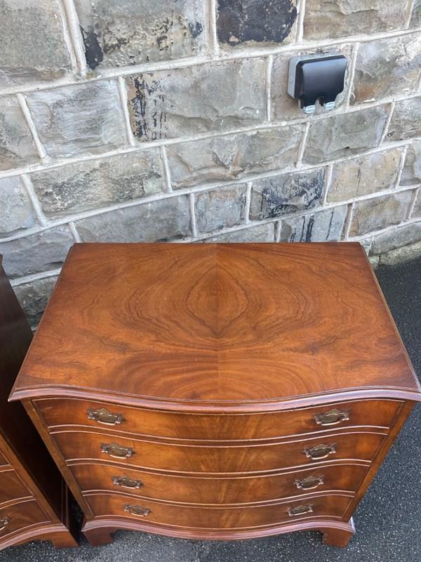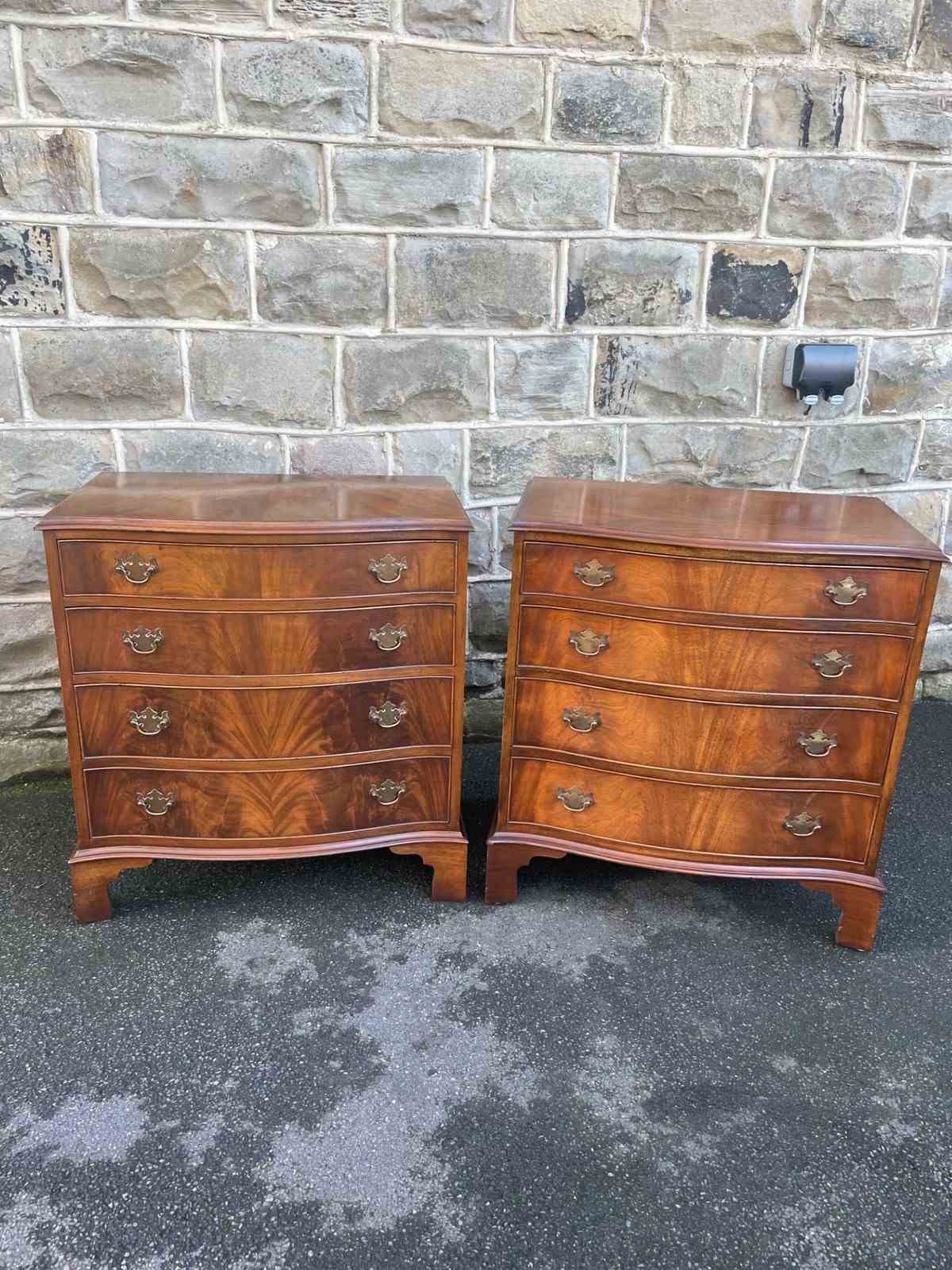 In walnut, serpentine front, 4 draws with ornate brass drop handles, polished walnut sides standing on bracket feet