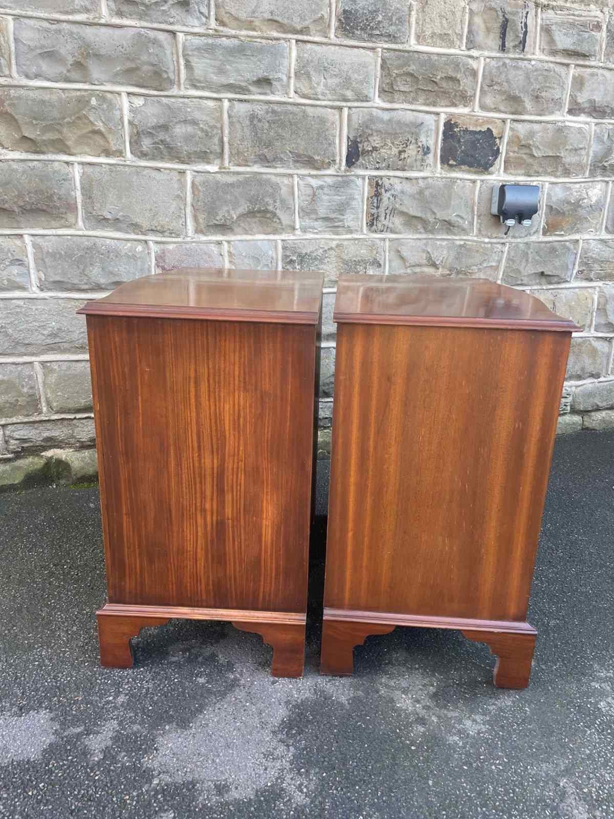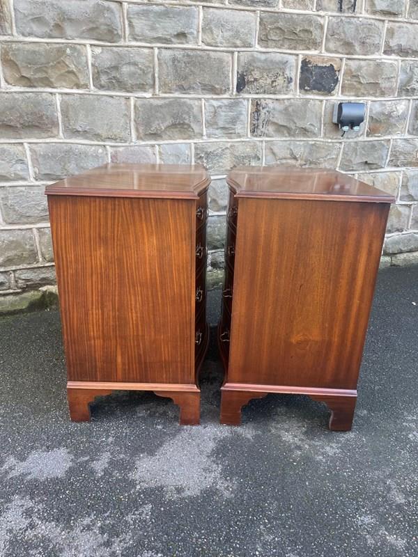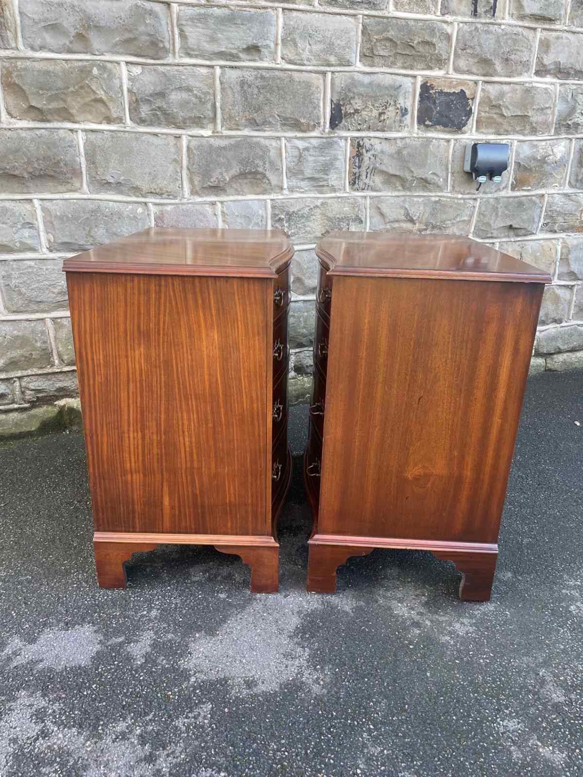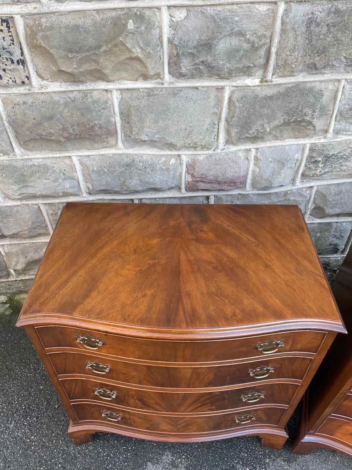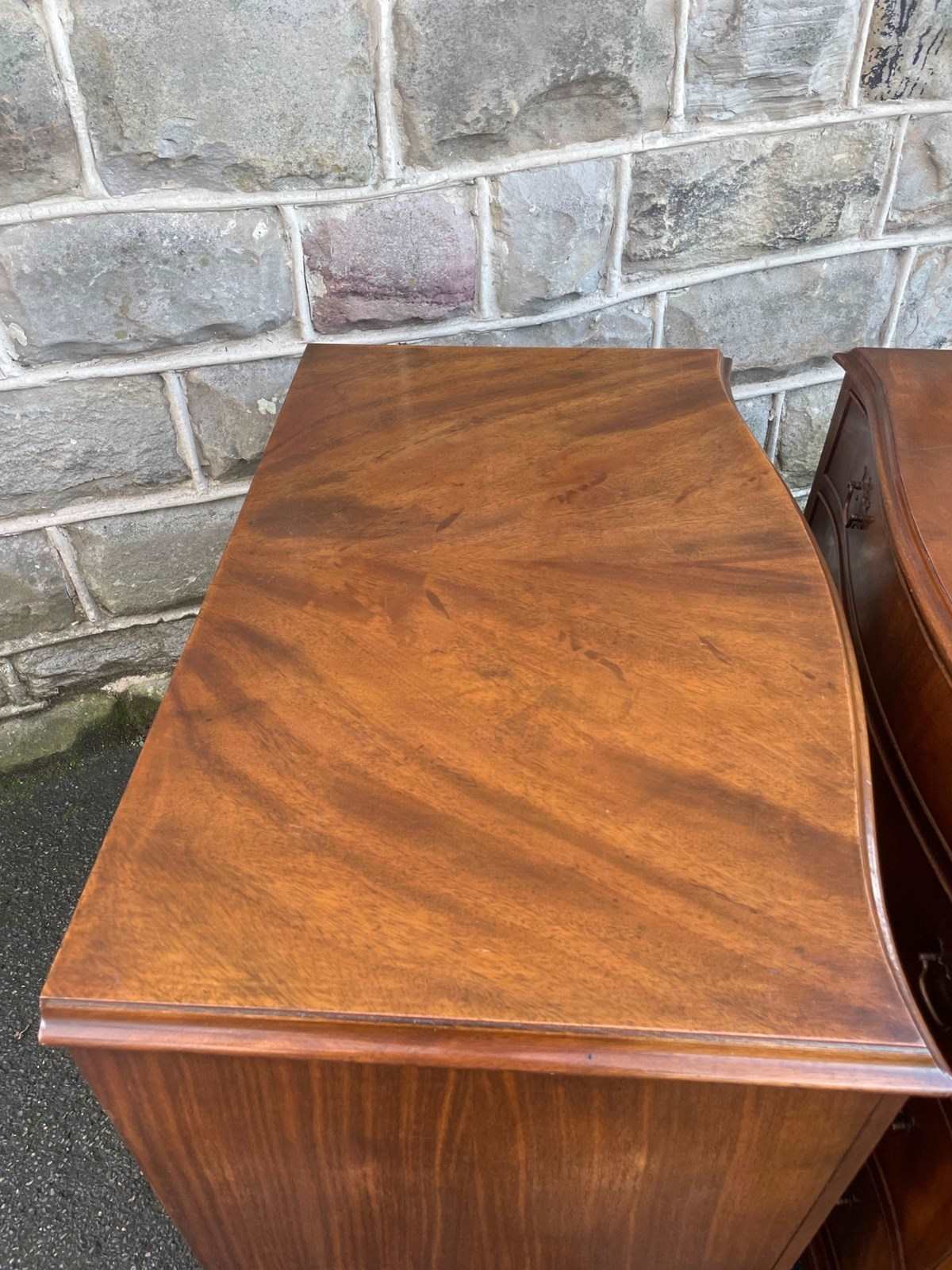 In walnut, serpentine front, 4 draws with ornate brass drop handles, polished walnut sides standing on bracket feet