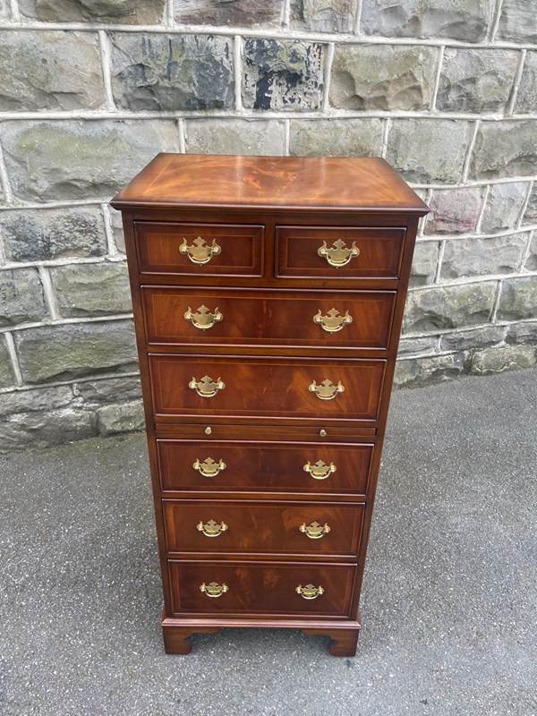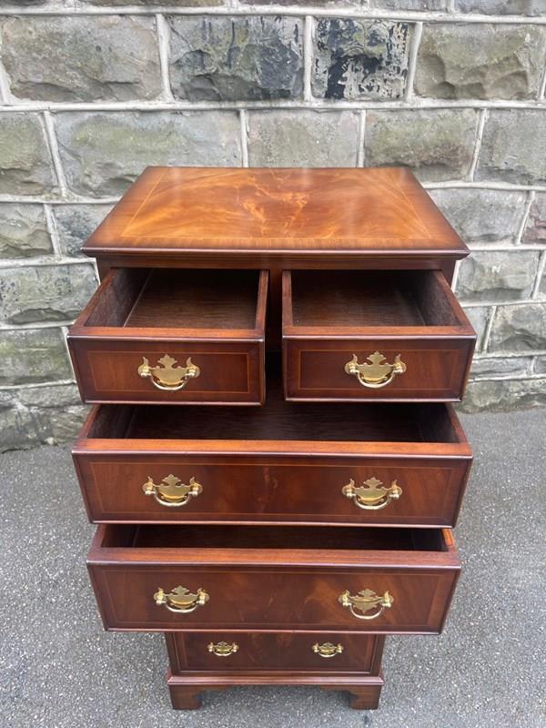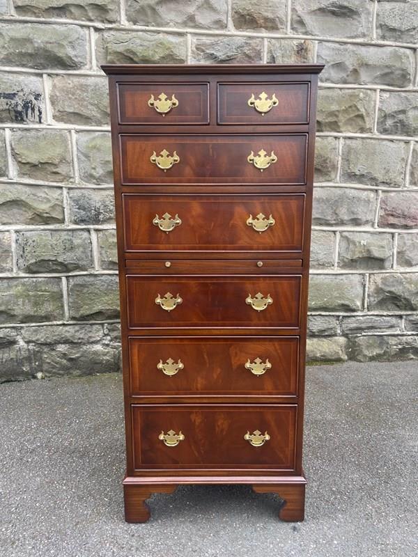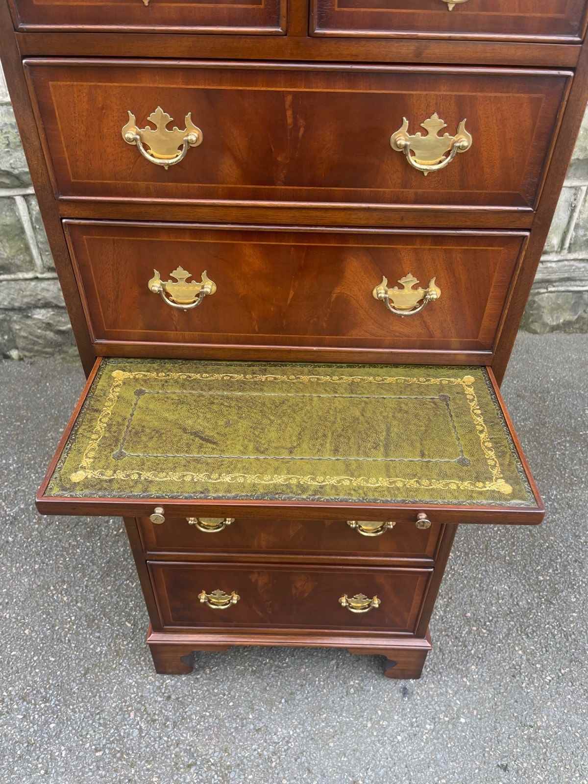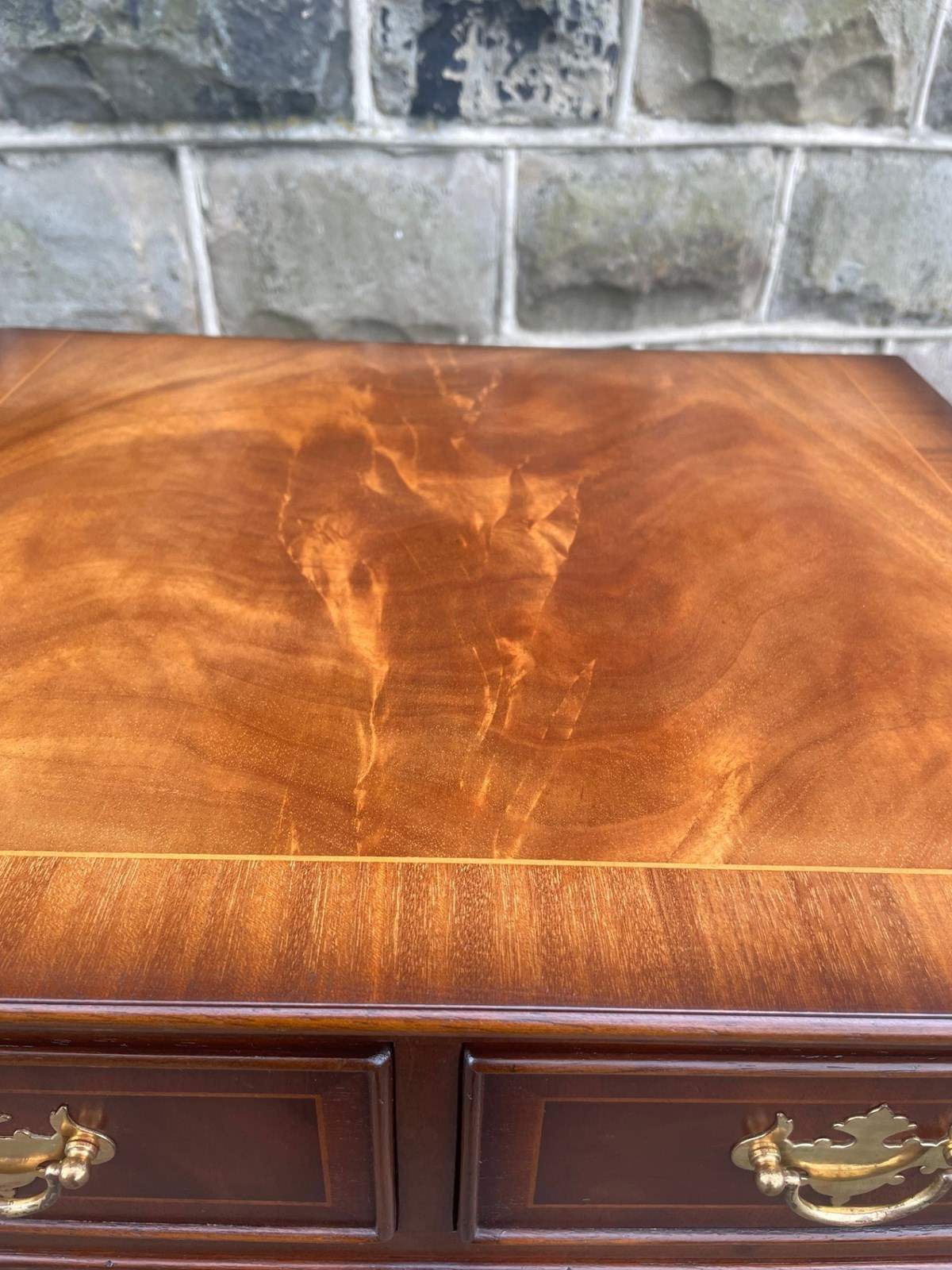 Lovely size & proportions. Flamed mahogany top with a cross banded border with boxwood line inlay. It has a series of 2 smaller over 5 graduated draws with a central green leather tooled pull out slide. All the draws have brass drop handles. Polished mahogany sides standing on bracket feet.