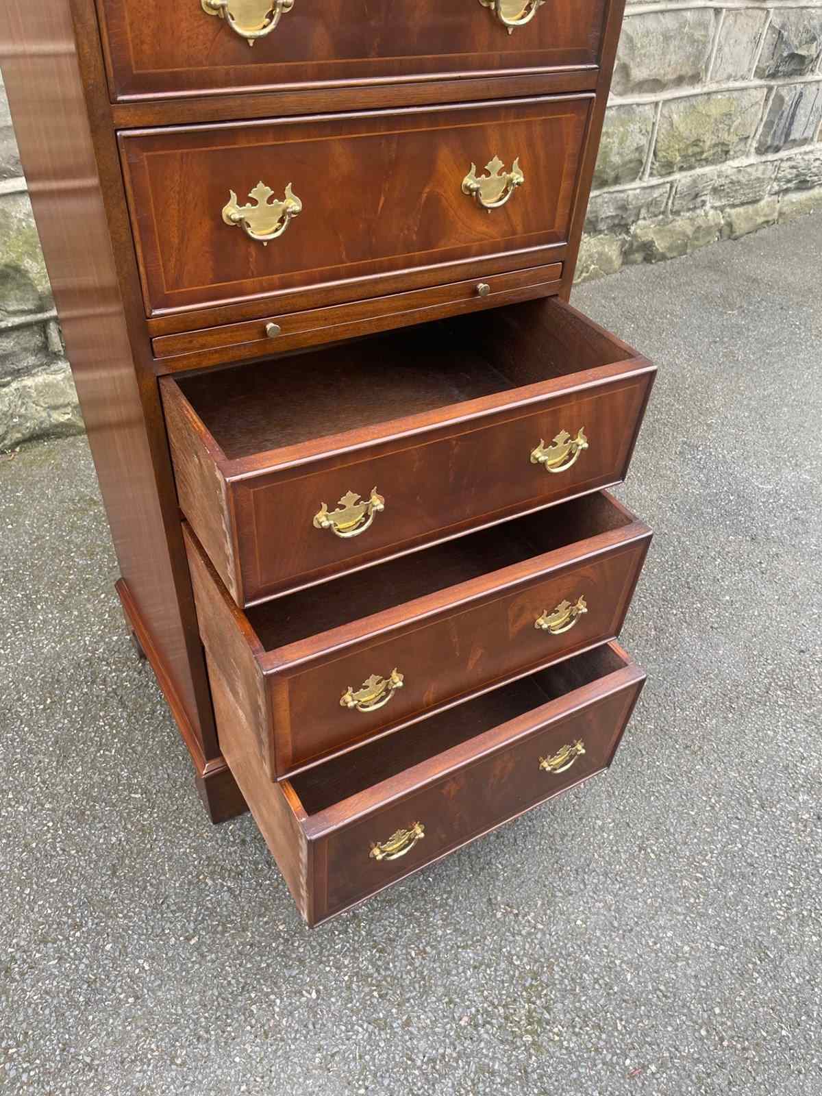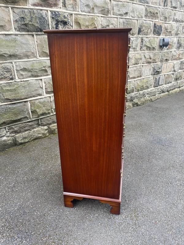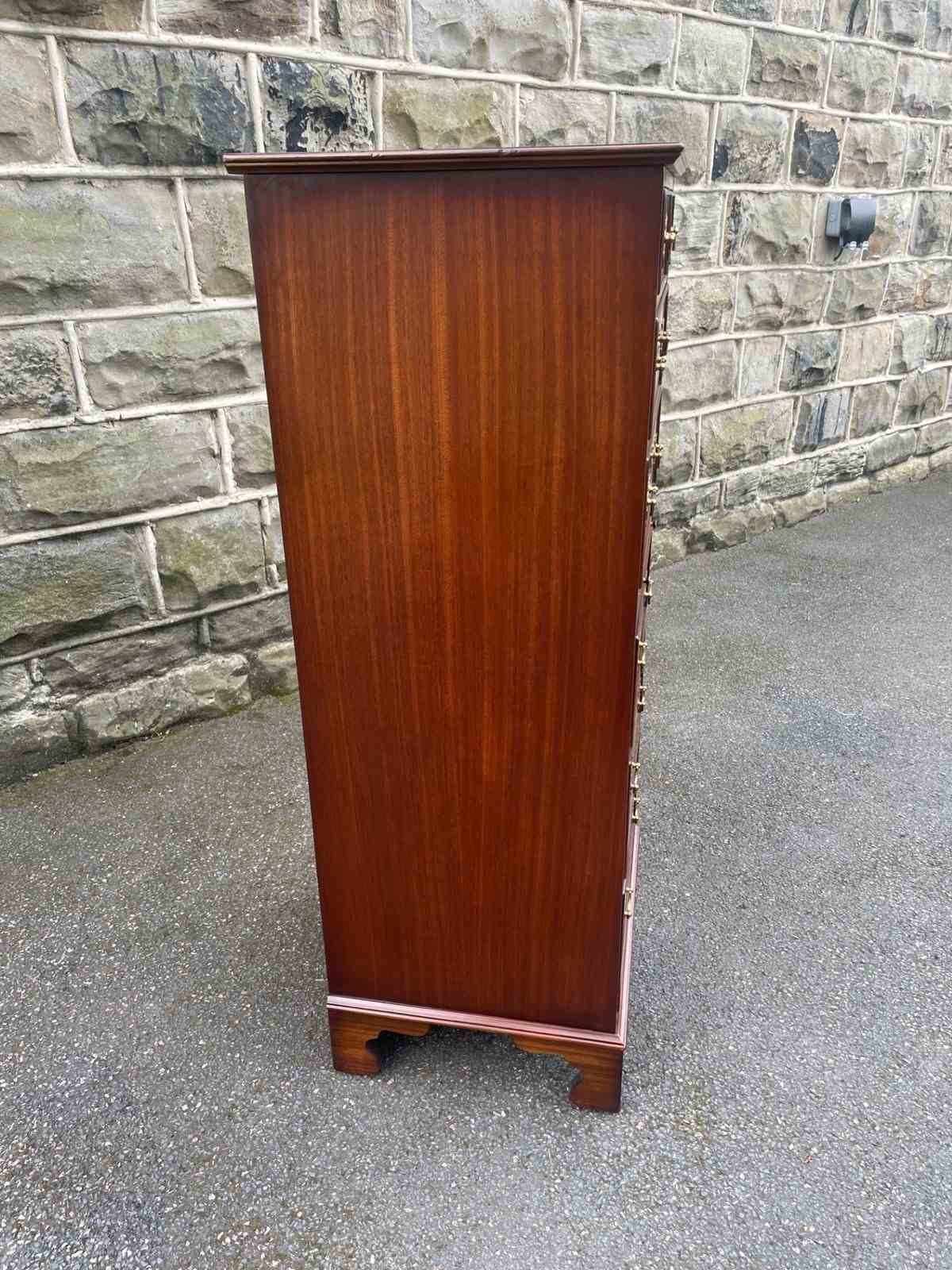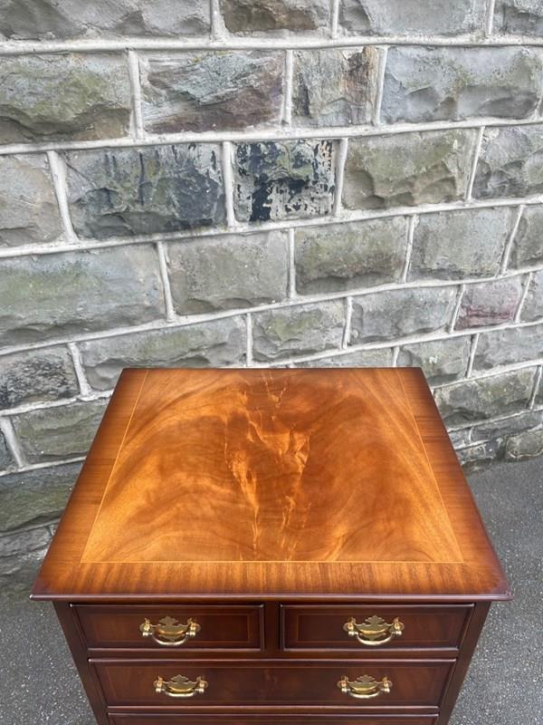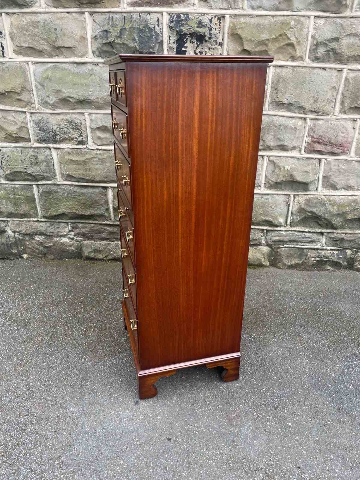 Lovely size & proportions. Flamed mahogany top with a cross banded border with boxwood line inlay. It has a series of 2 smaller over 5 graduated draws with a central green leather tooled pull out slide. All the draws have brass drop handles. Polished mahogany sides standing on bracket feet.