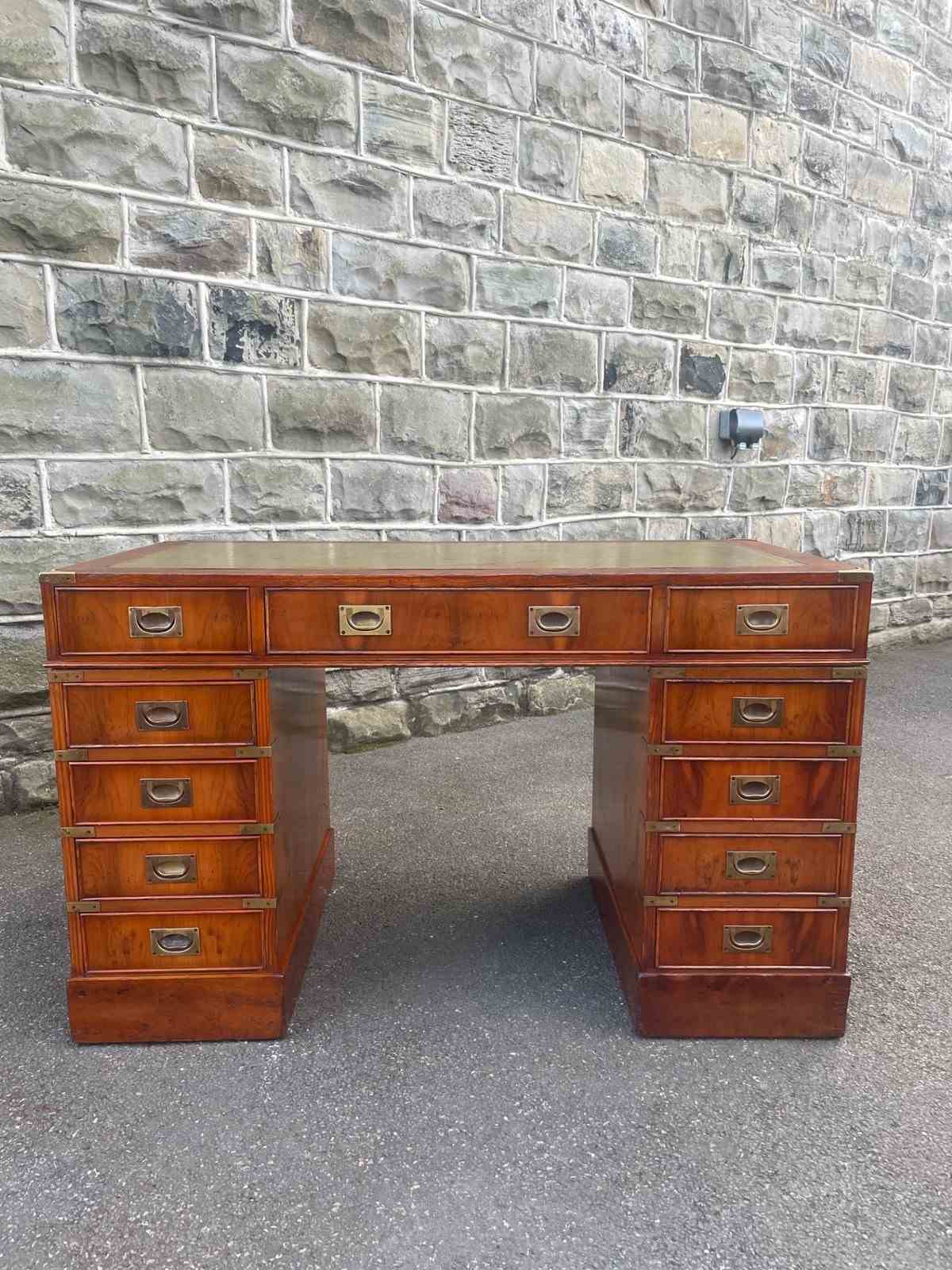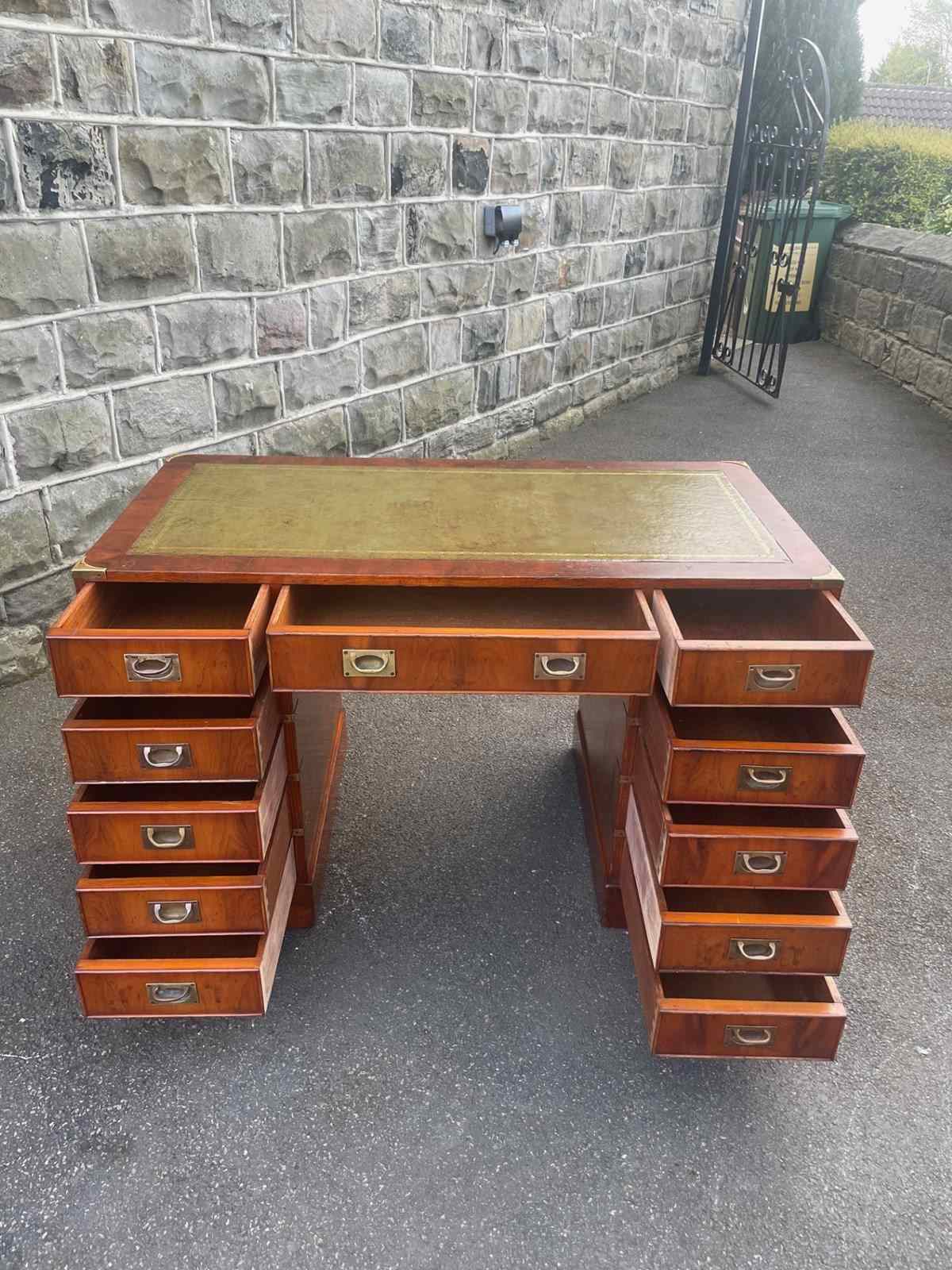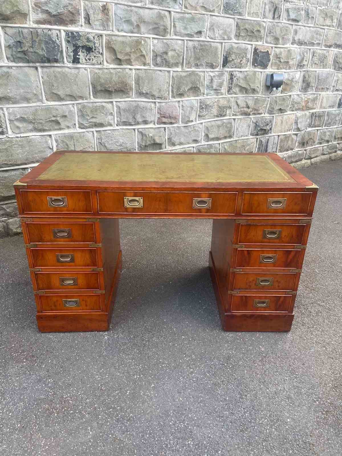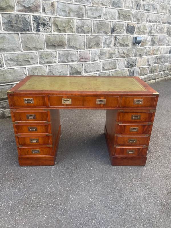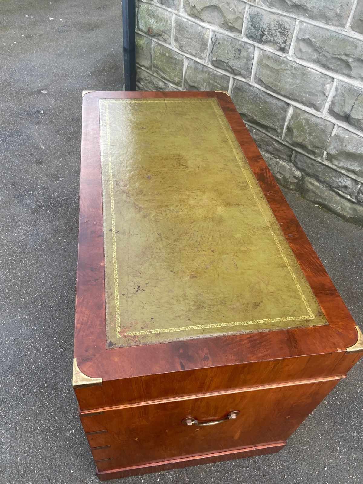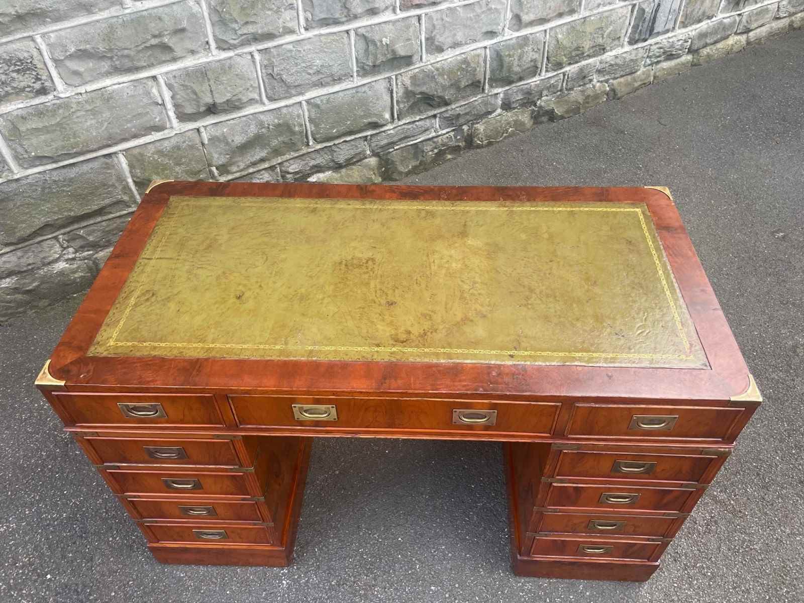 Great size & proportions. Green tooled leather scribe with brass corner mounts. It has 3 draws across the top with 4 draws to each pedestal. Brass flat fitting handles. Polished sides with brass handles on the sides. Standing on a plinth base with a castors underneath. Splits into 3 pieces.