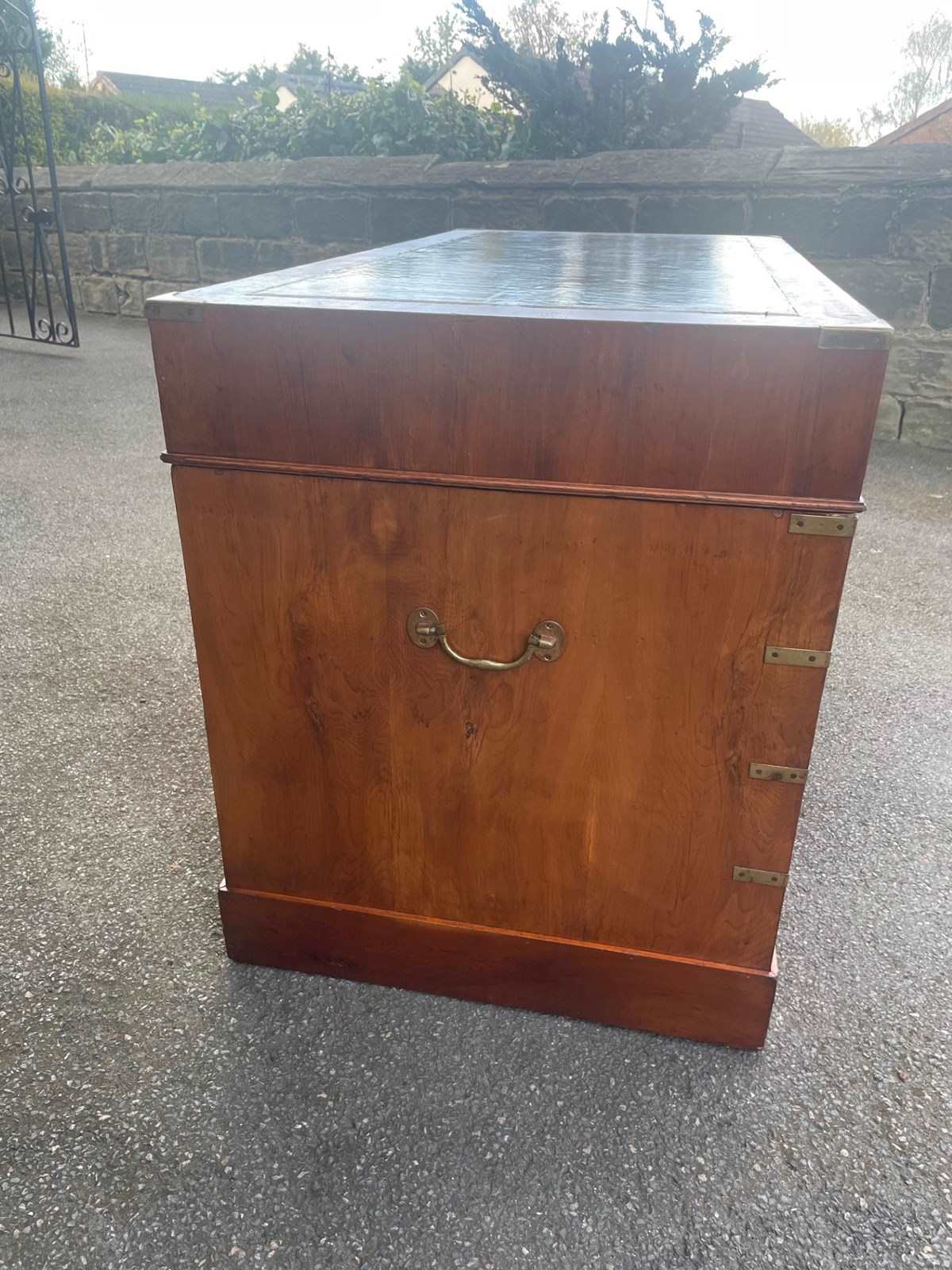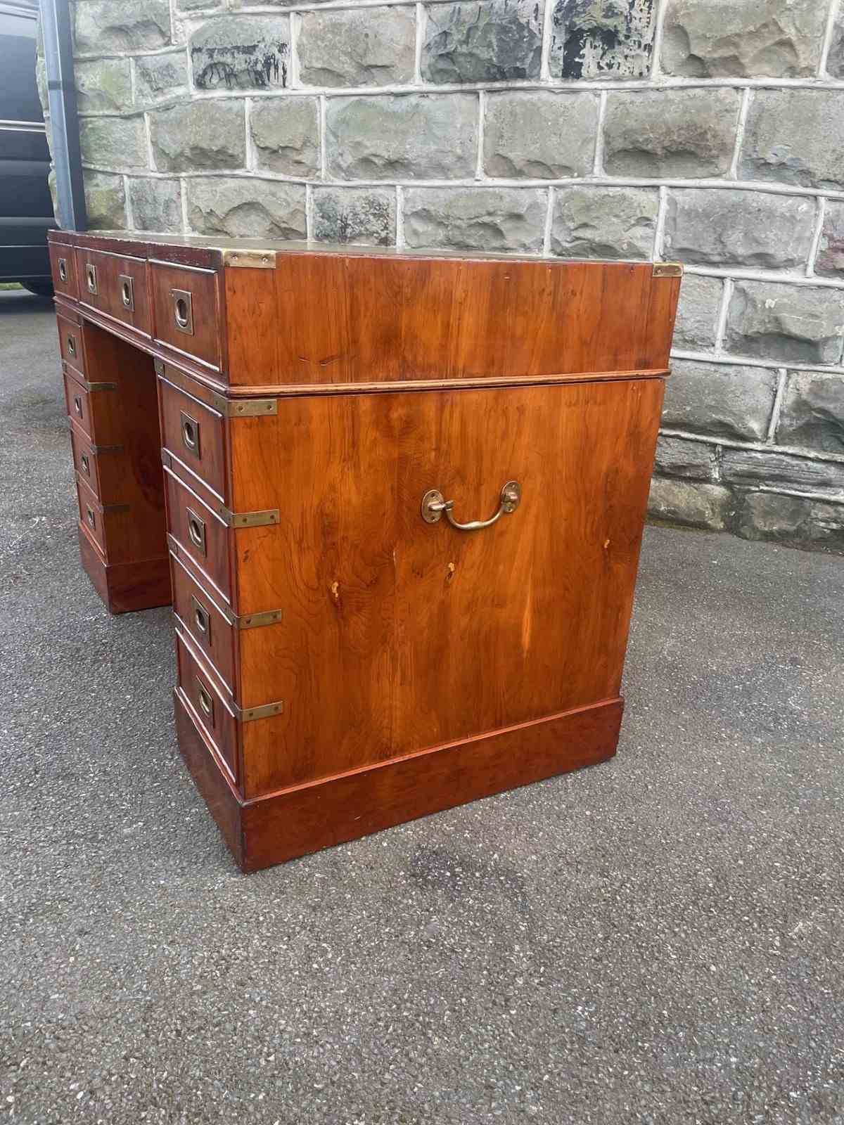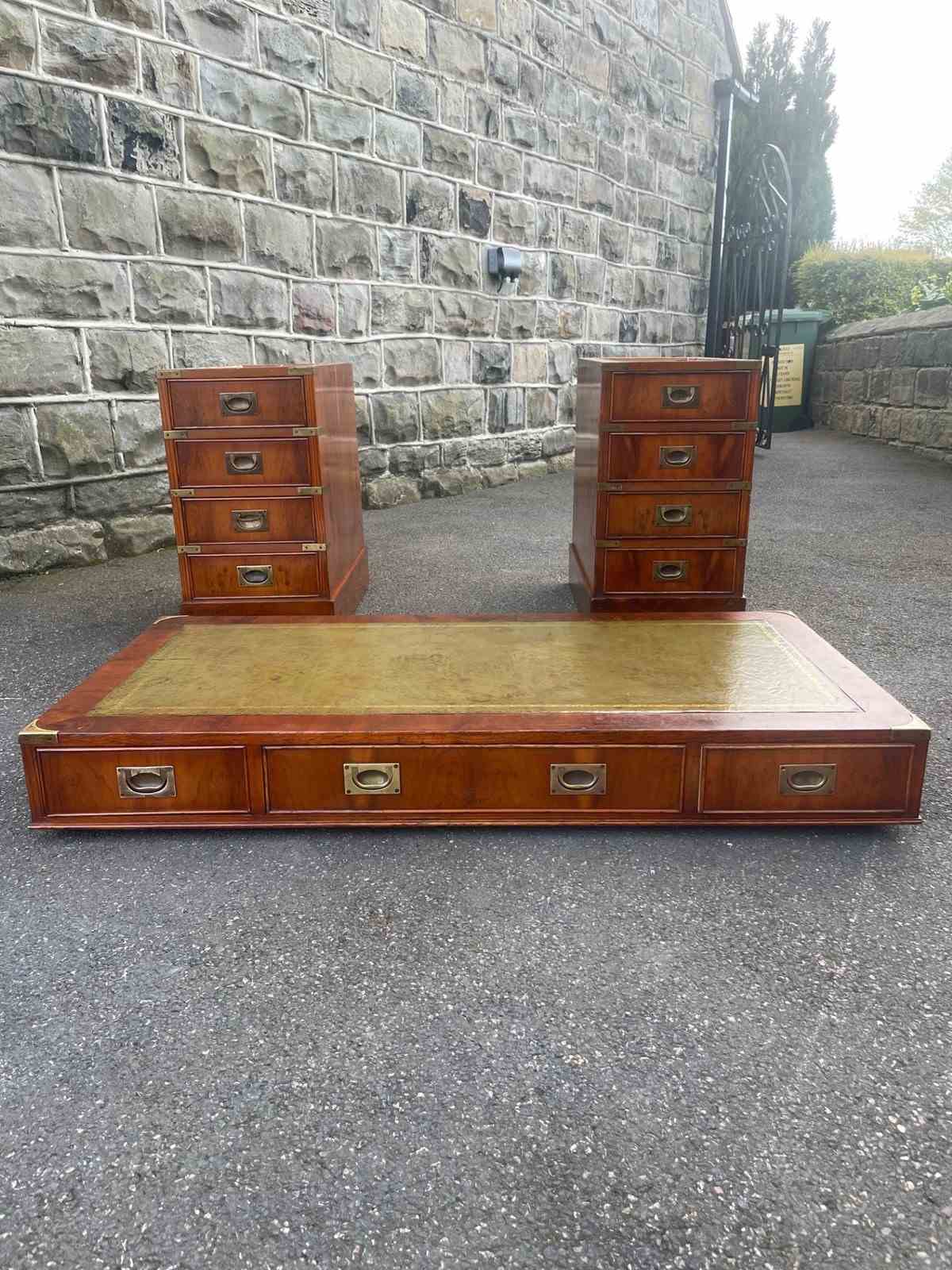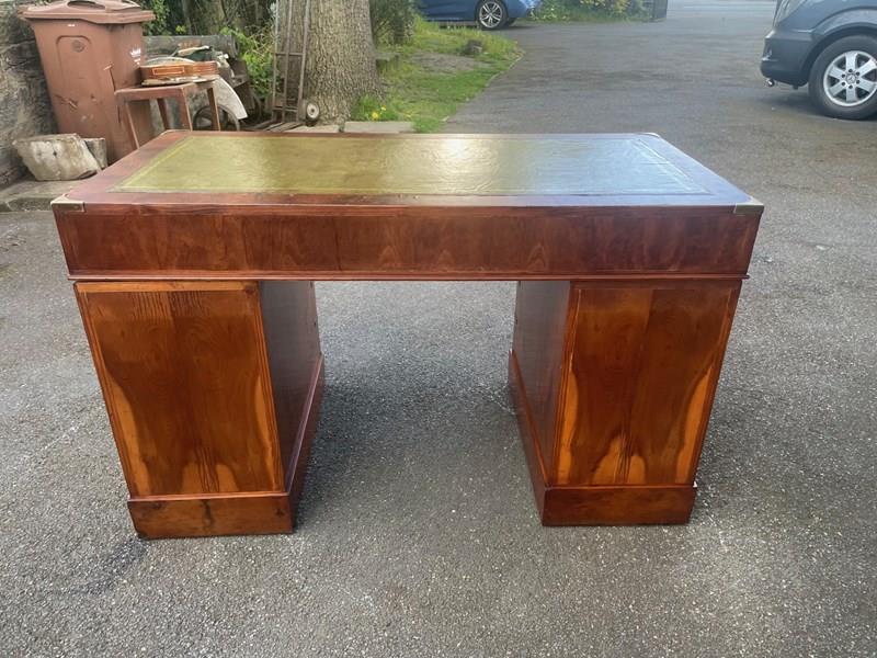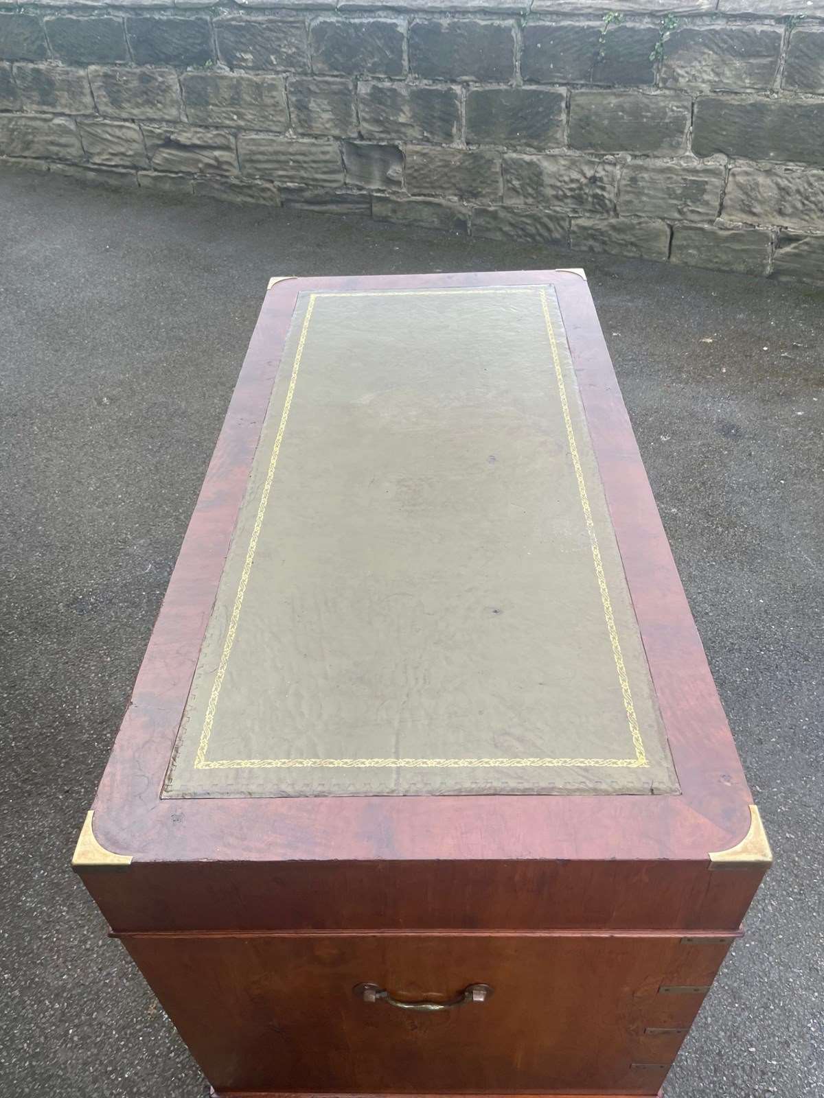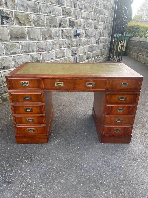 Great size & proportions. Green tooled leather scribe with brass corner mounts. It has 3 draws across the top with 4 draws to each pedestal. Brass flat fitting handles. Polished sides with brass handles on the sides. Standing on a plinth base with a castors underneath. Splits into 3 pieces.