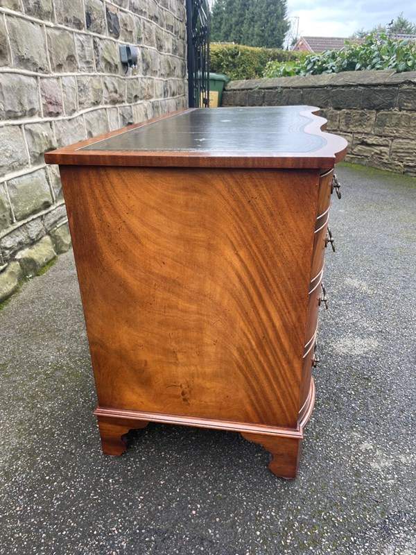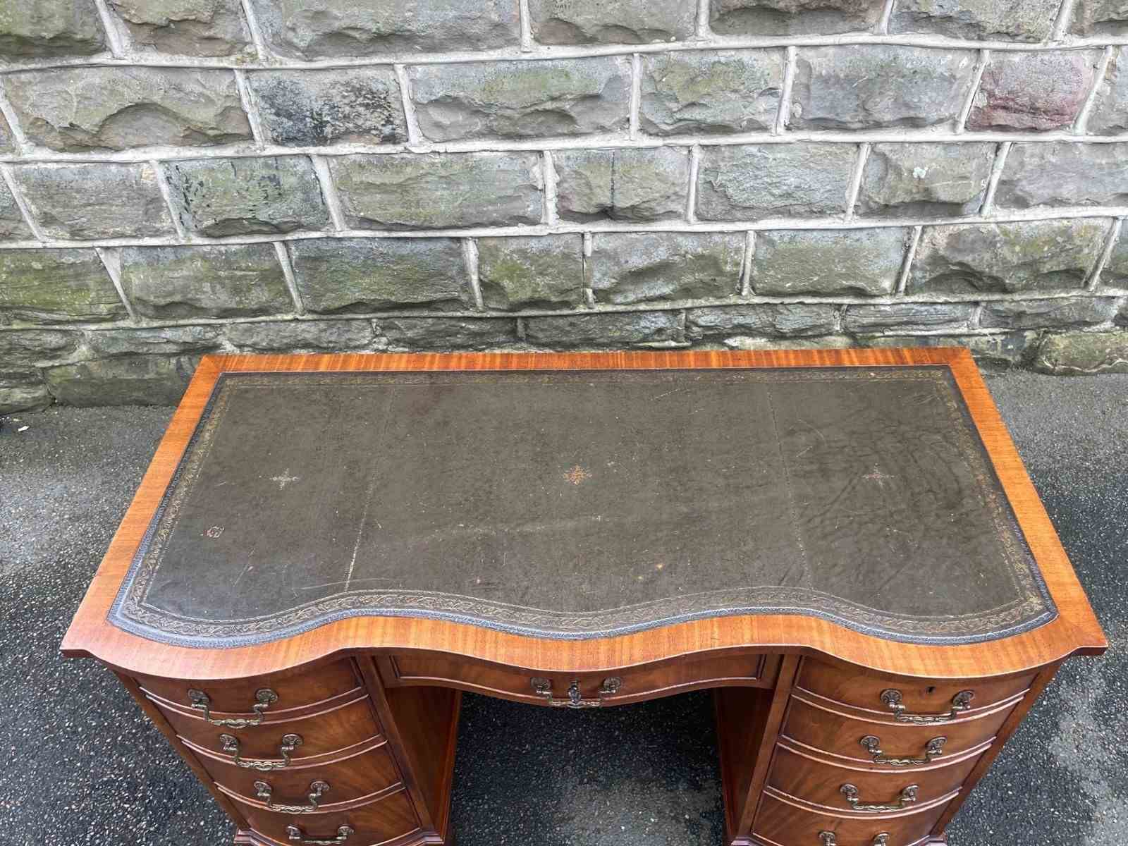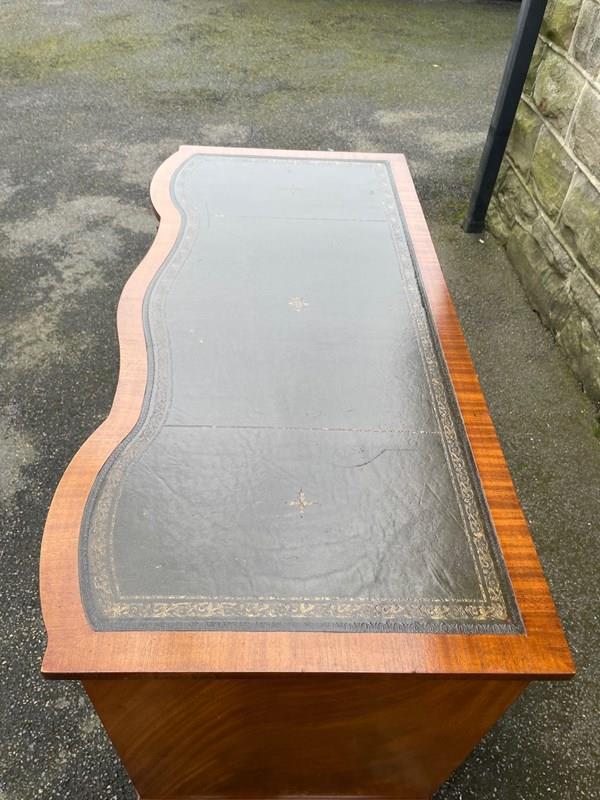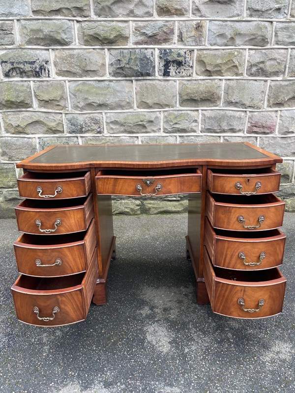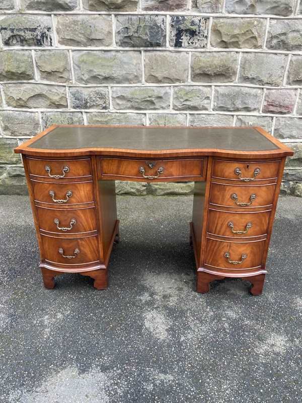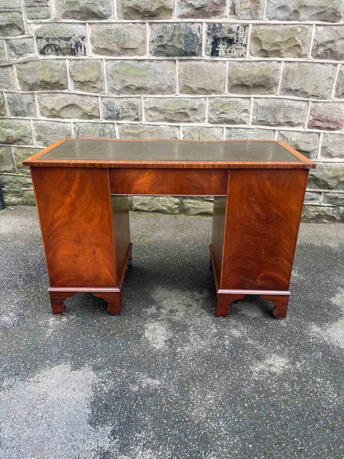 In walnut having an inset tooled olive green leather surface, central draw with 4 graduated draws either side. Polished walnut back & sides standing on bracket feet. It is 1 fixed piece of furniture.