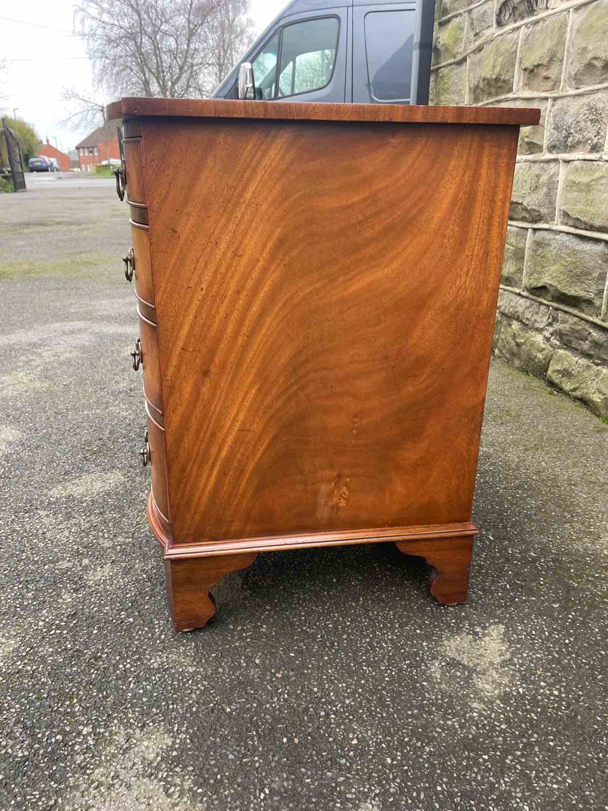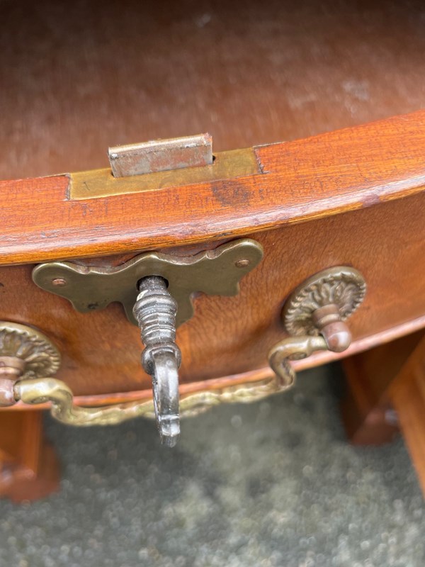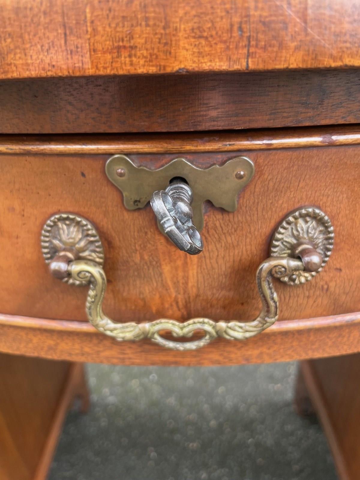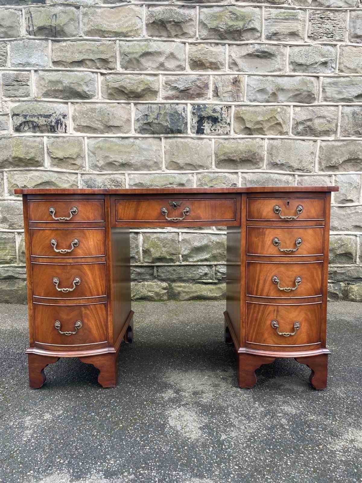 In walnut having an inset tooled olive green leather surface, central draw with 4 graduated draws either side. Polished walnut back & sides standing on bracket feet. It is 1 fixed piece of furniture.