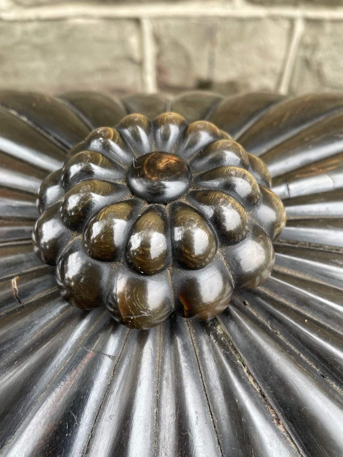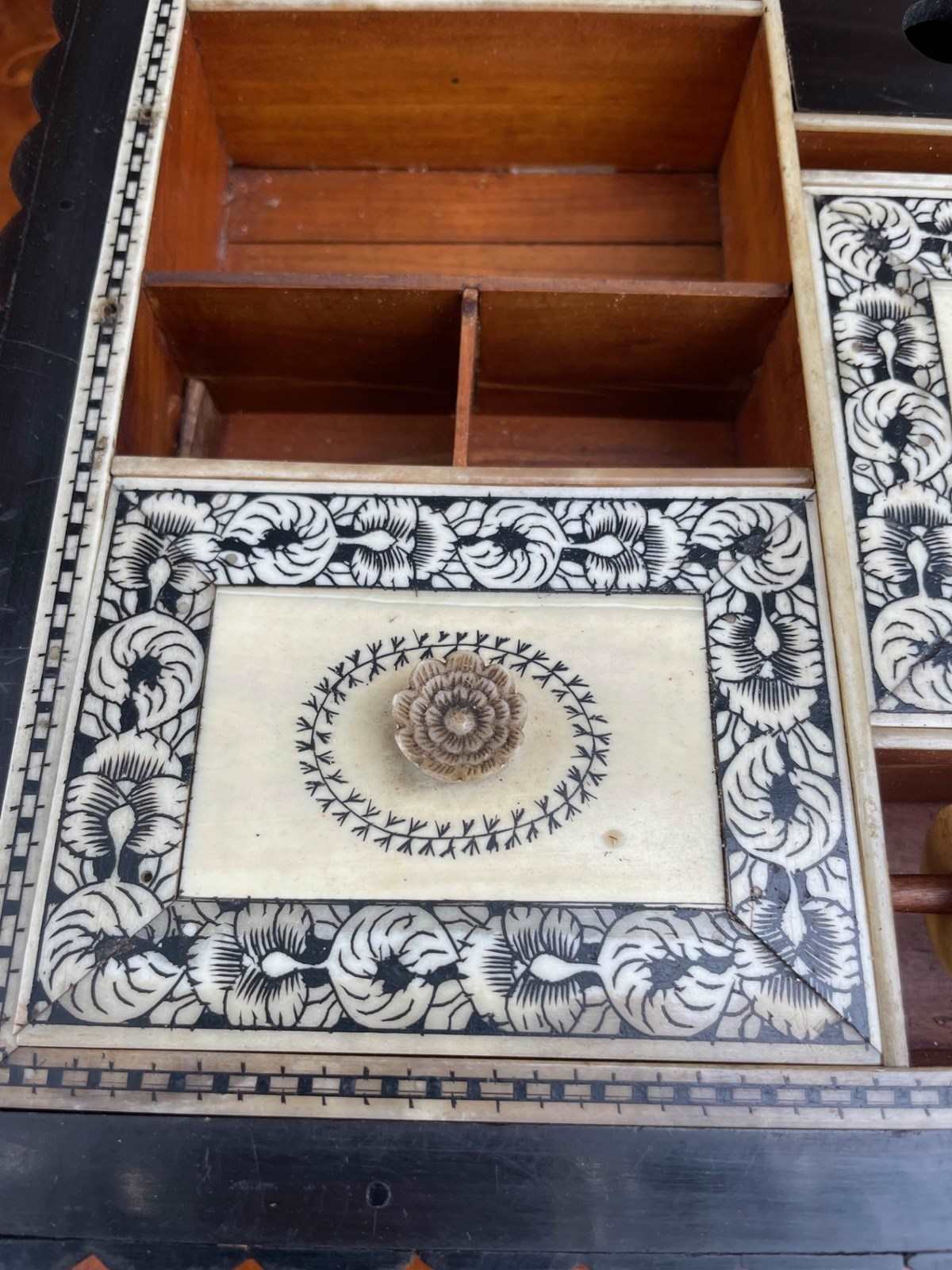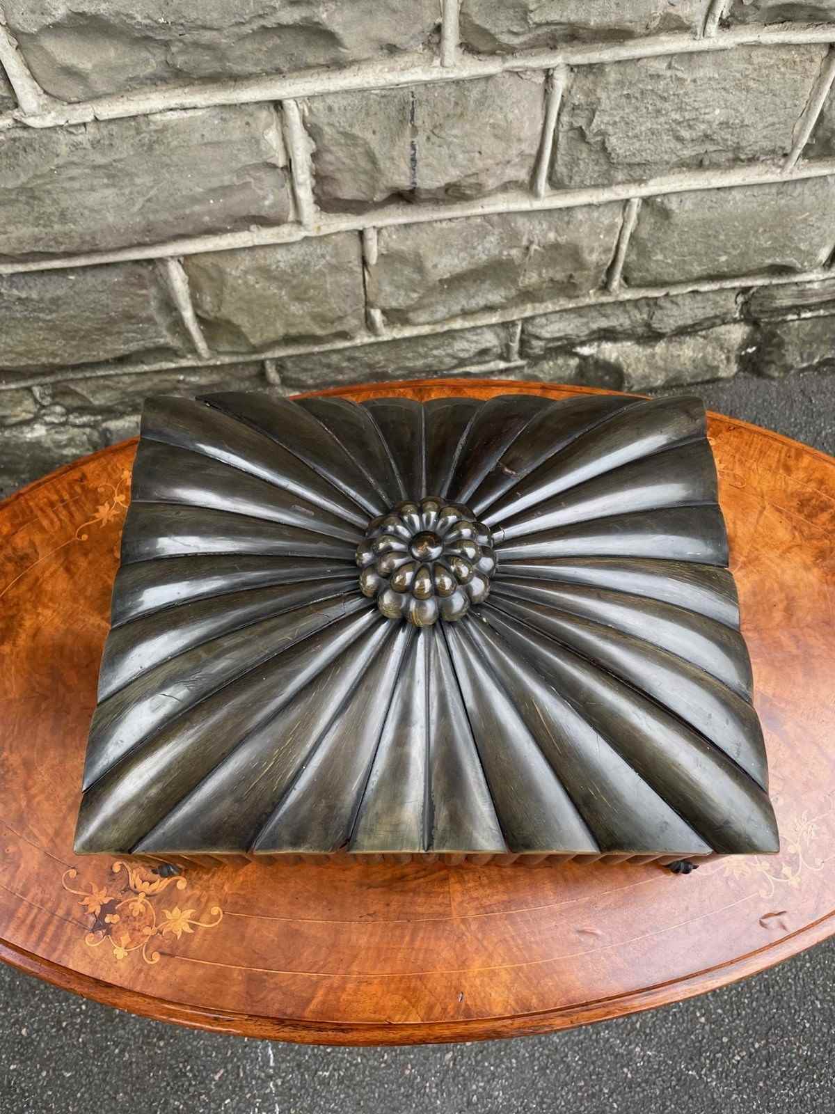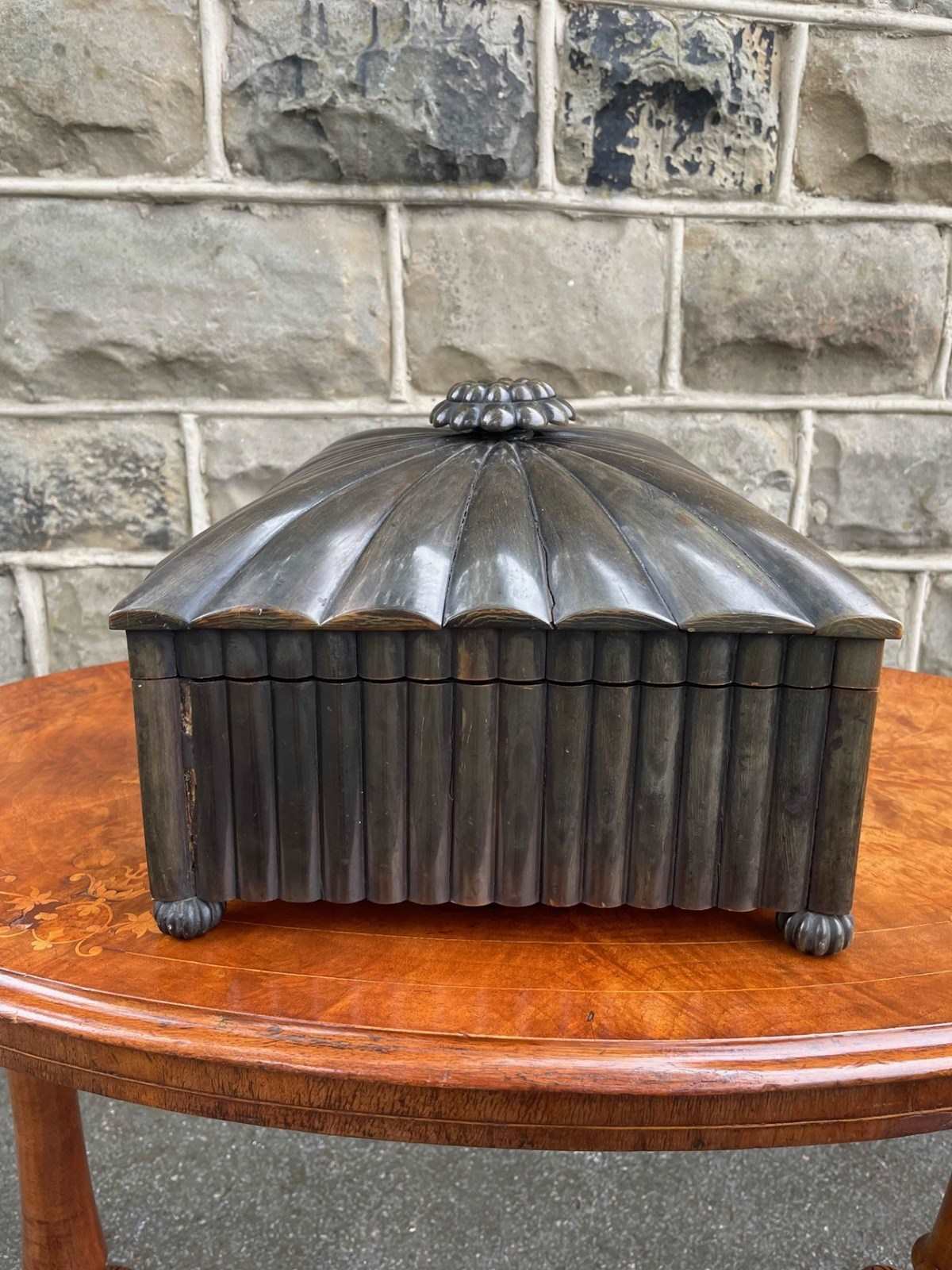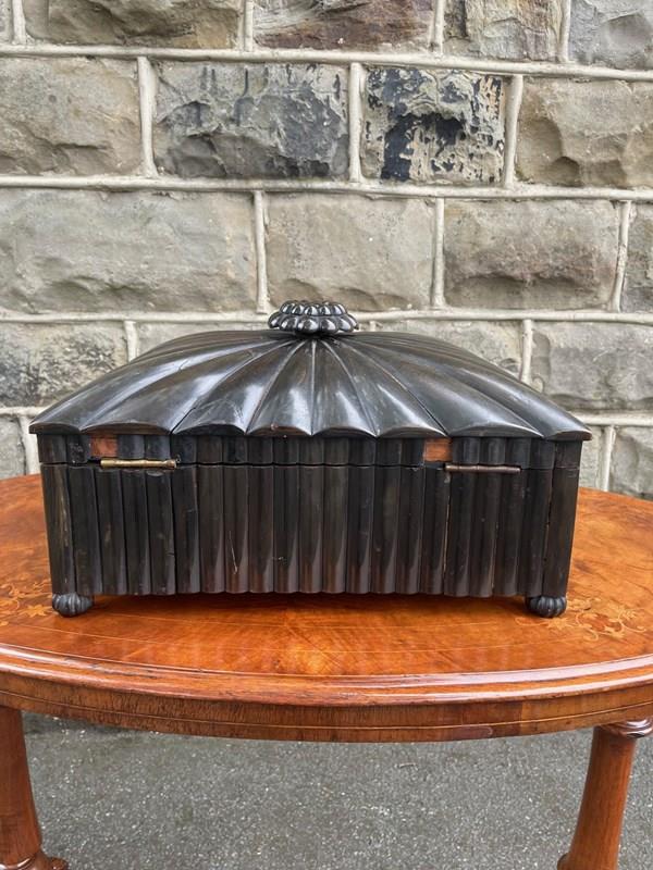The outer box covered in individual sections of horn with finial to the top and similar bun feet. Inside it has a lift out tray with lidded compartment etc.