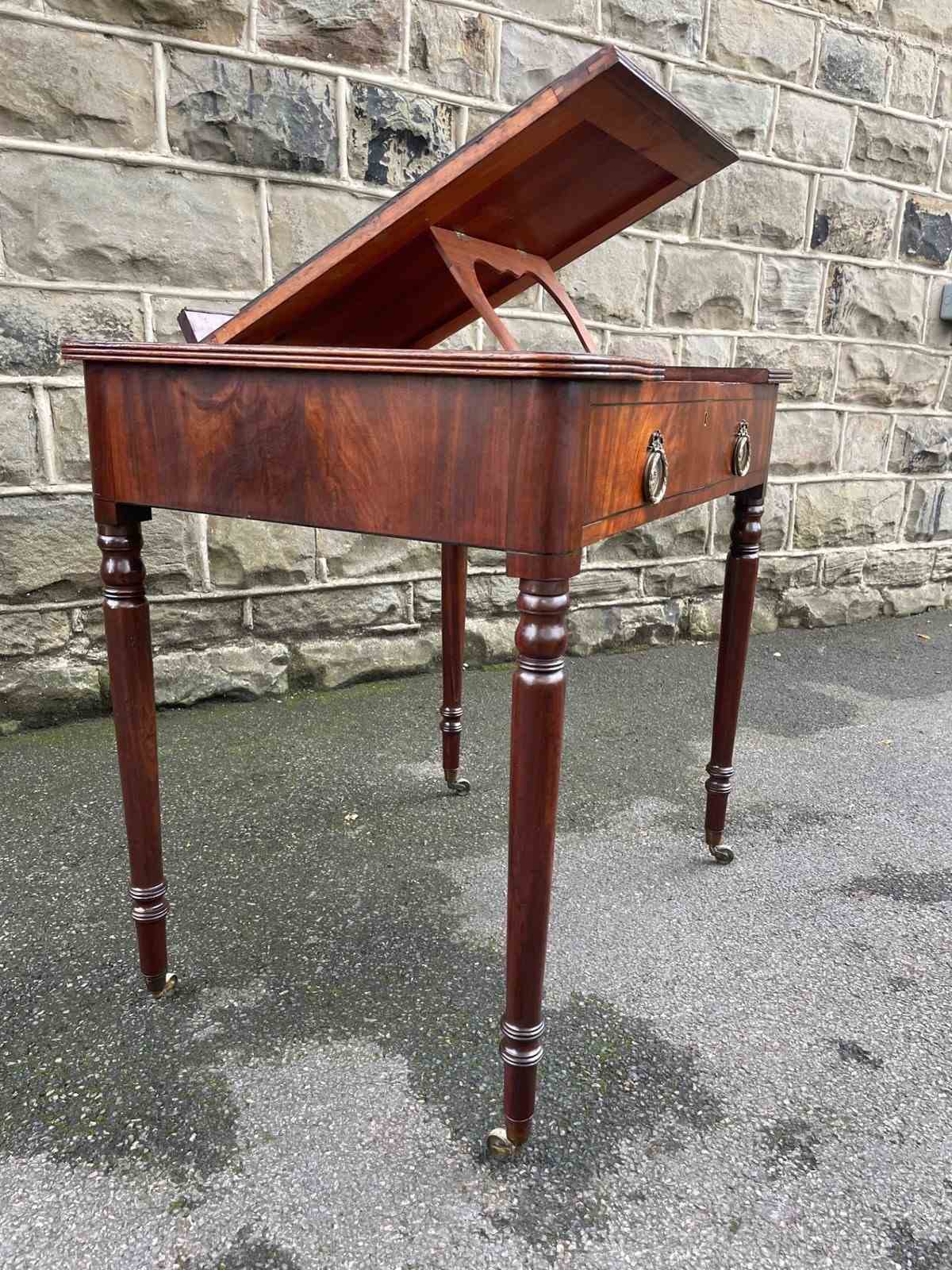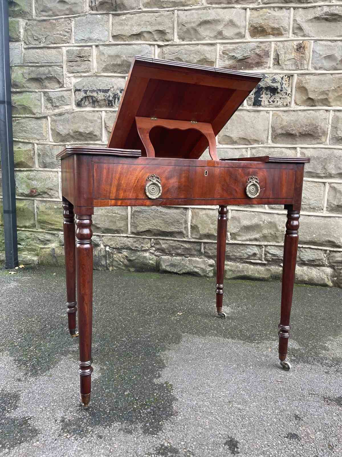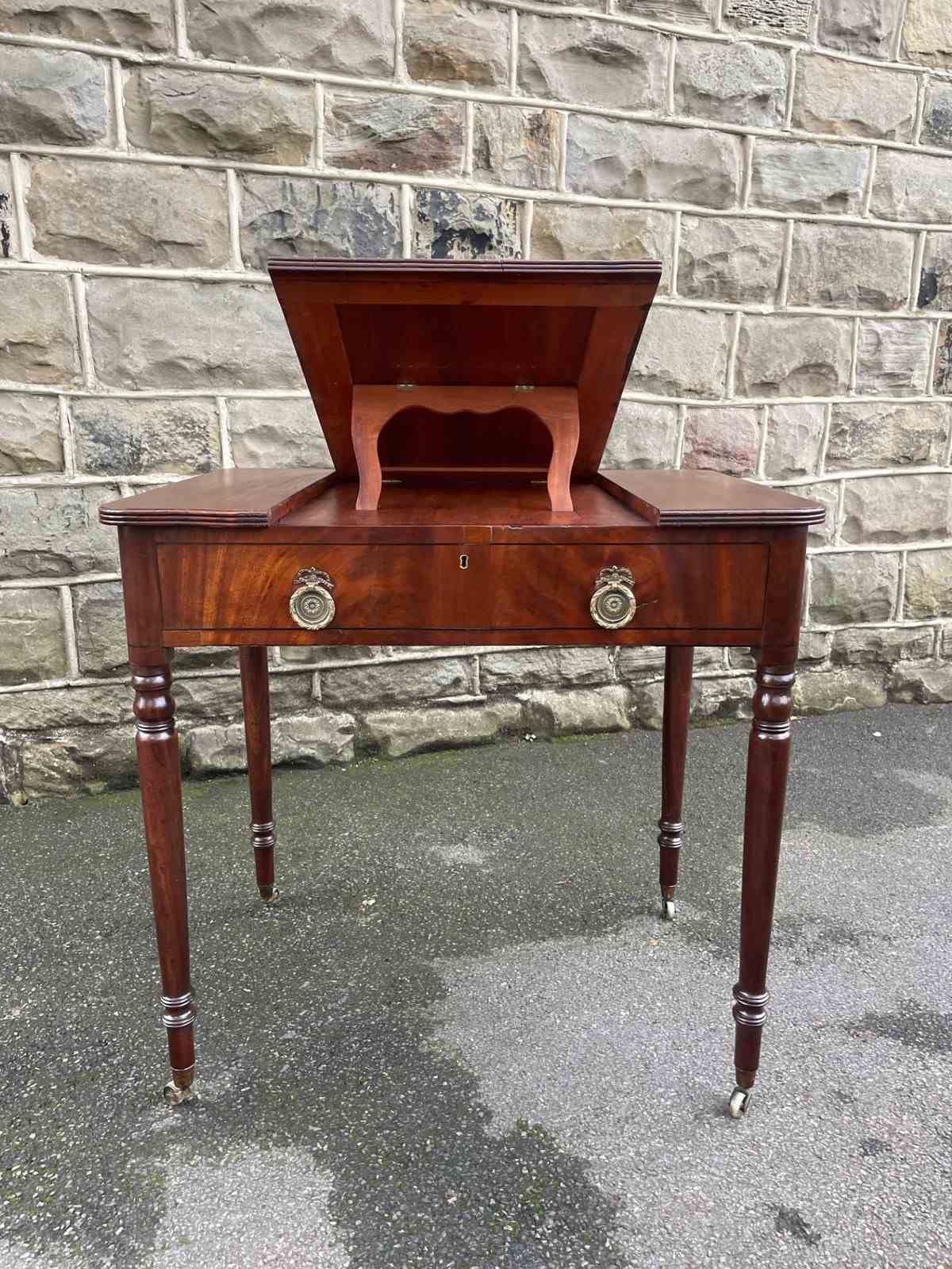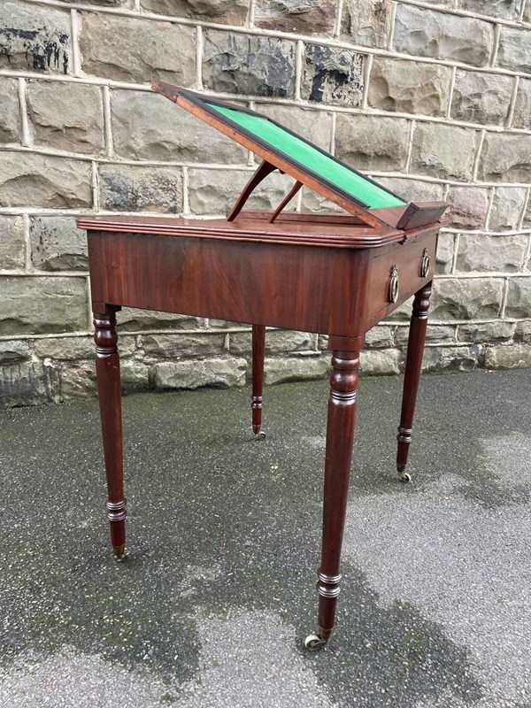 Lovely size & proportions . In mahogany having a central adjustable reading lectern with easel back to change the desired angle. Ornate brass handles on opposing dummy draws, standing on turned mahogany legs with brass castors.