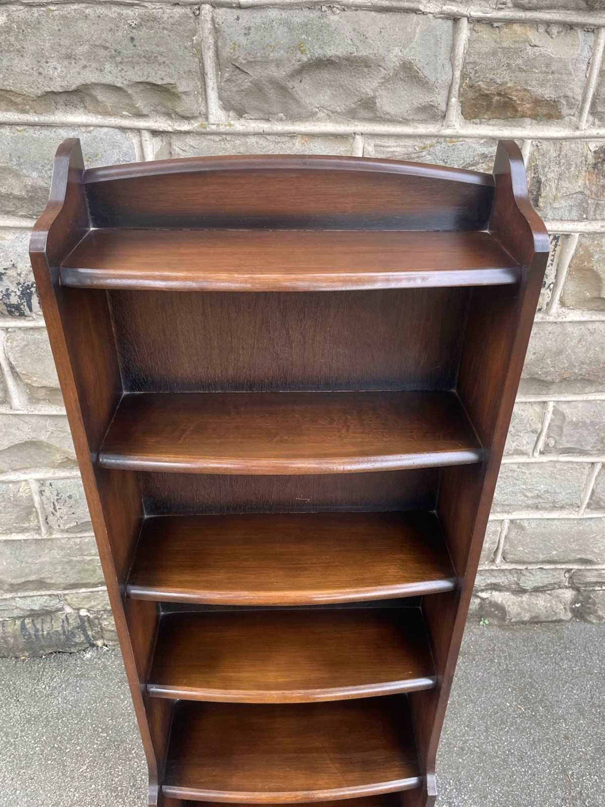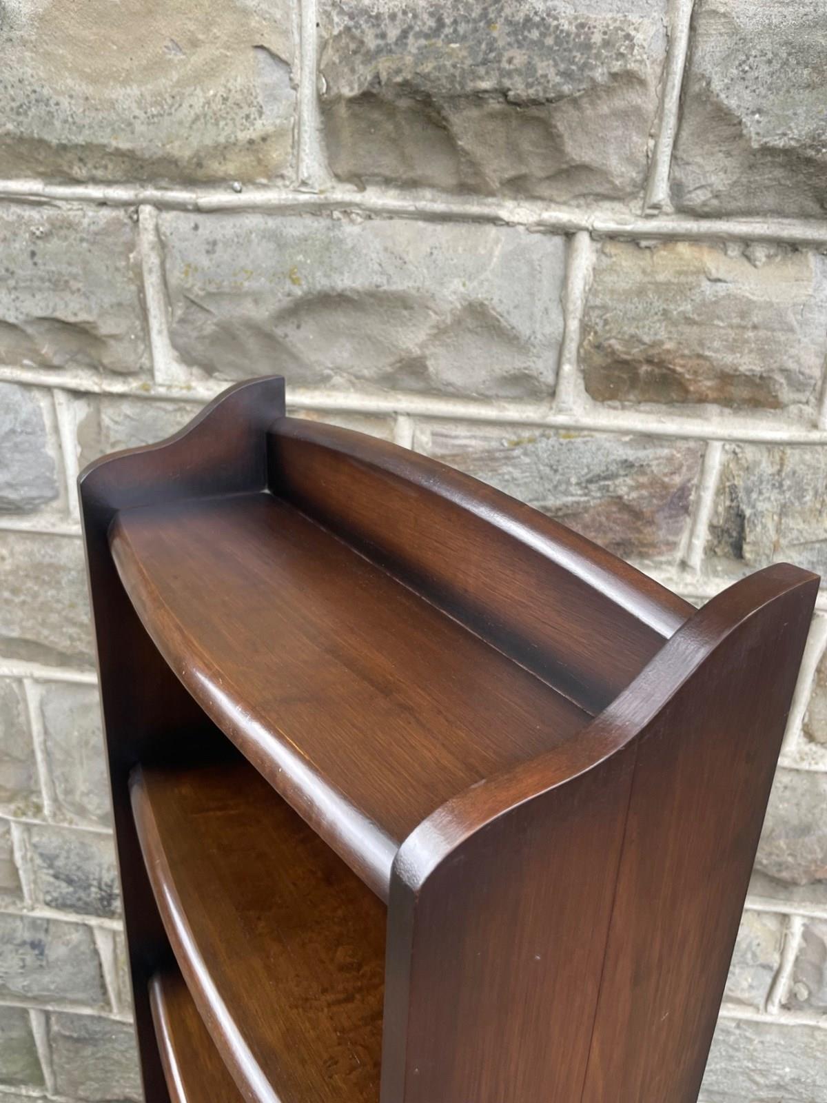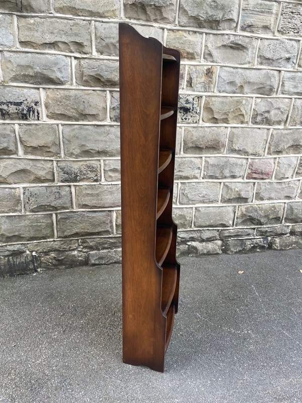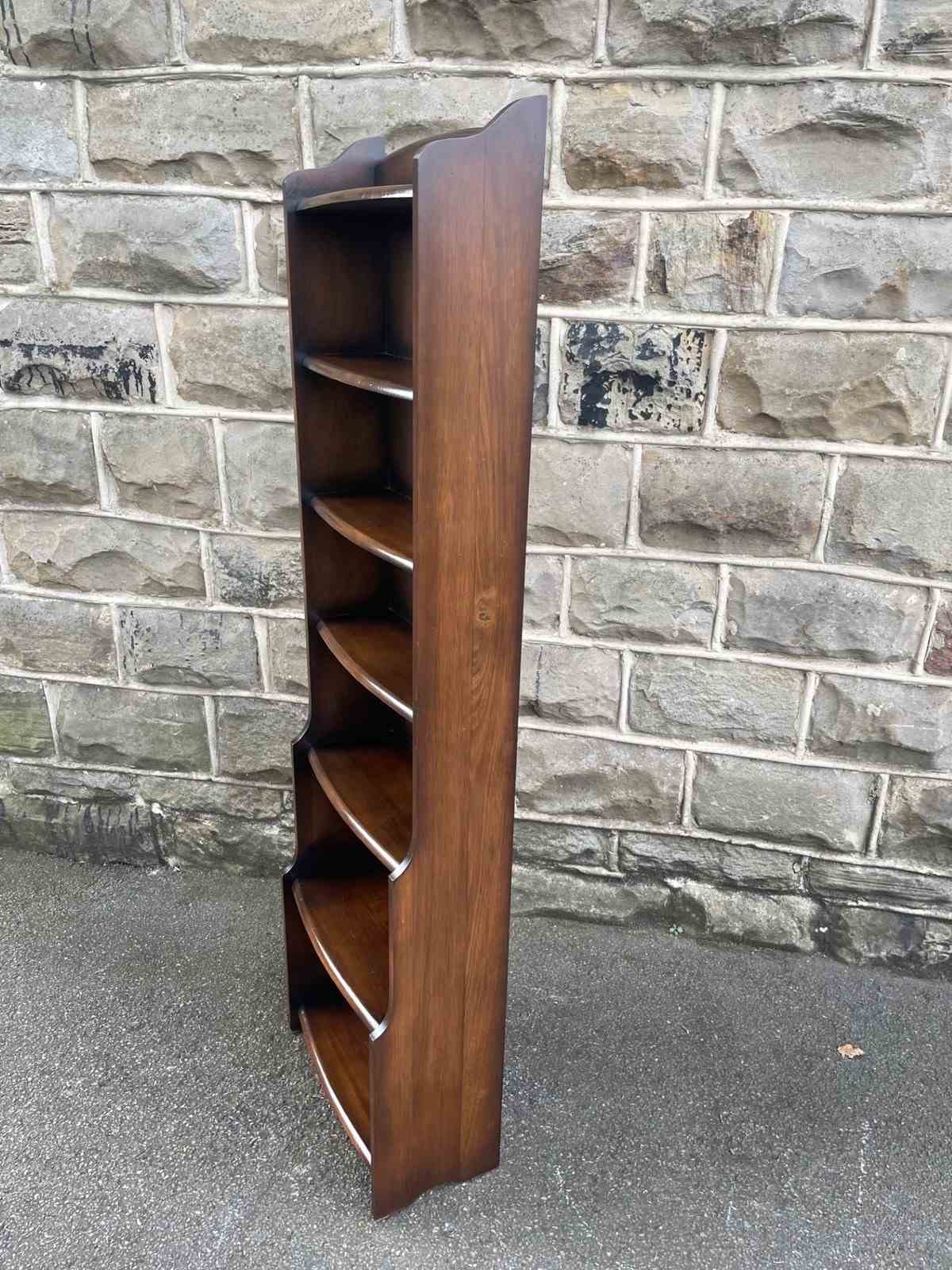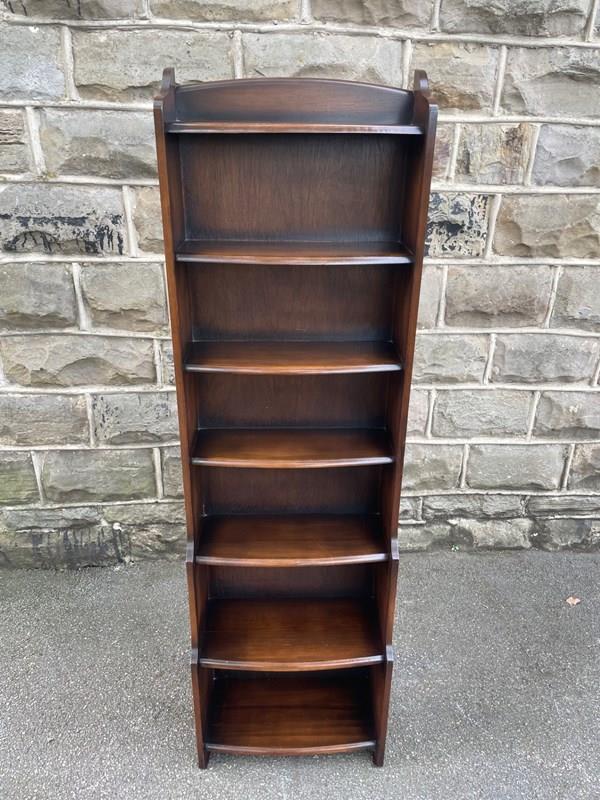 Offered for sale is this slim open bookcase made from oak. Shaped top with fixed shelves graduated in height.
