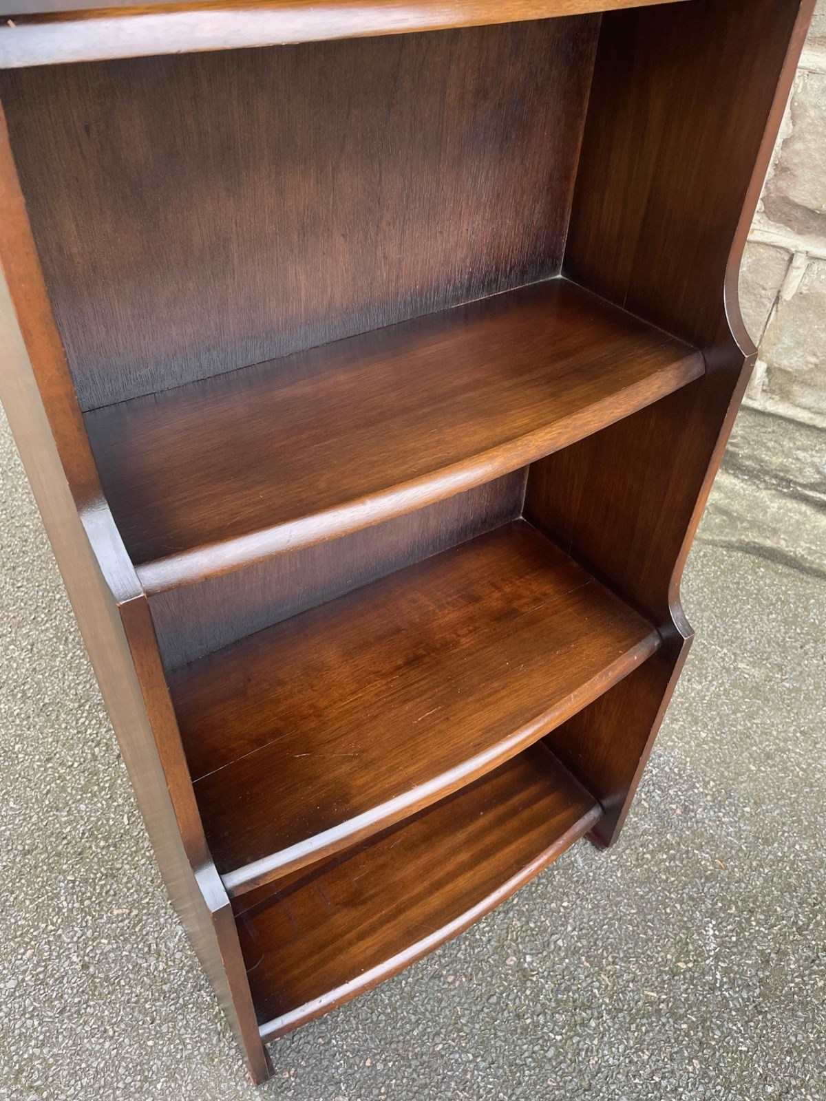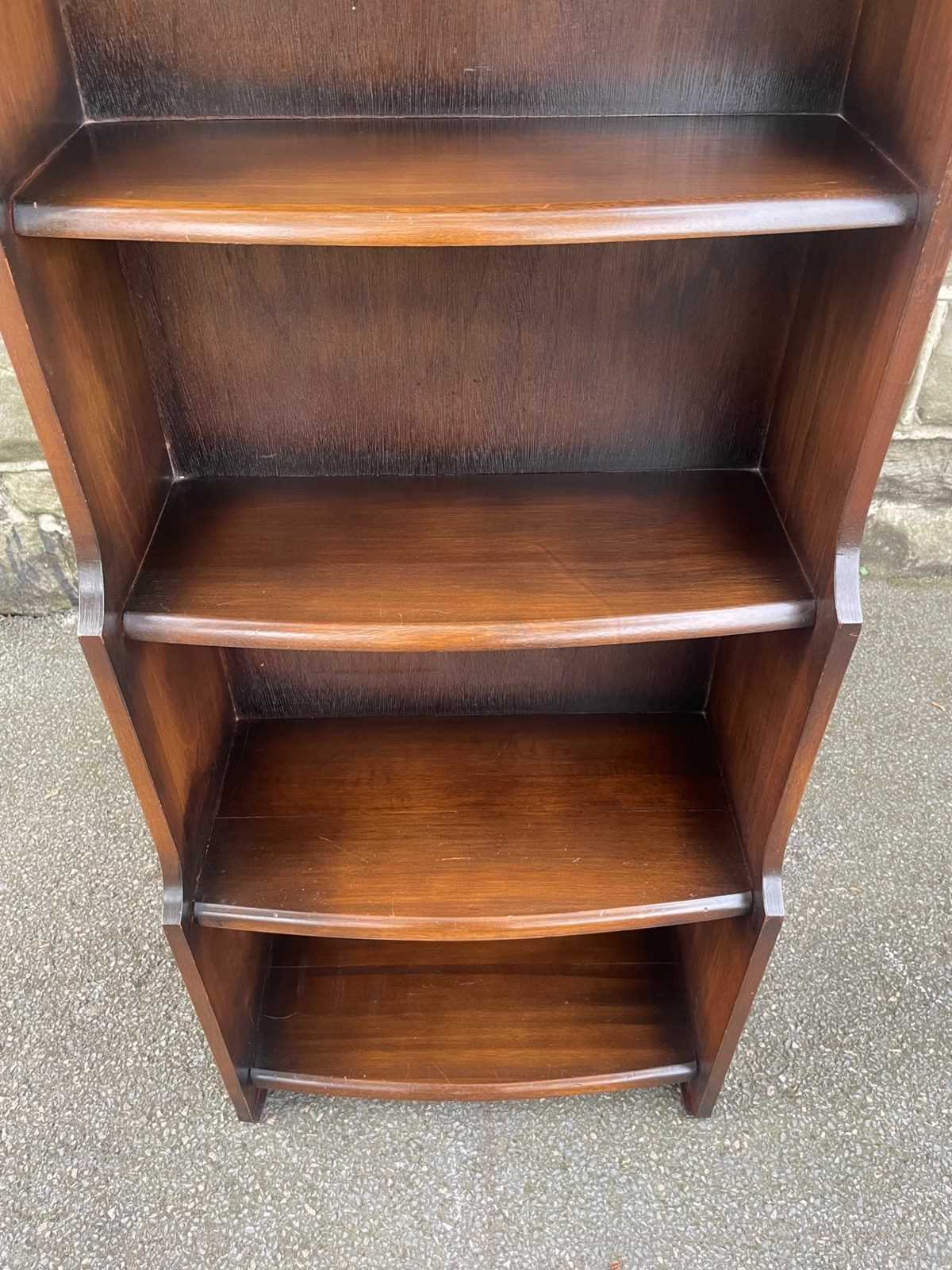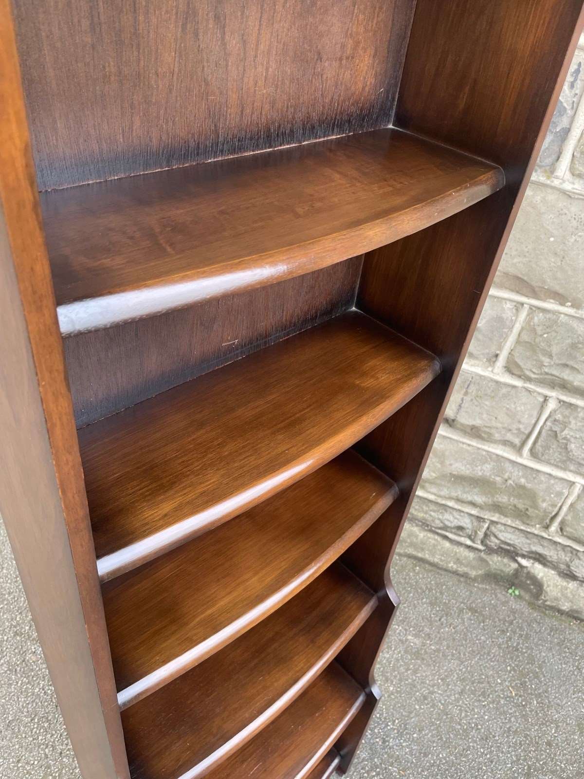Offered for sale is this slim open bookcase made from oak. Shaped top with fixed shelves graduated in height.