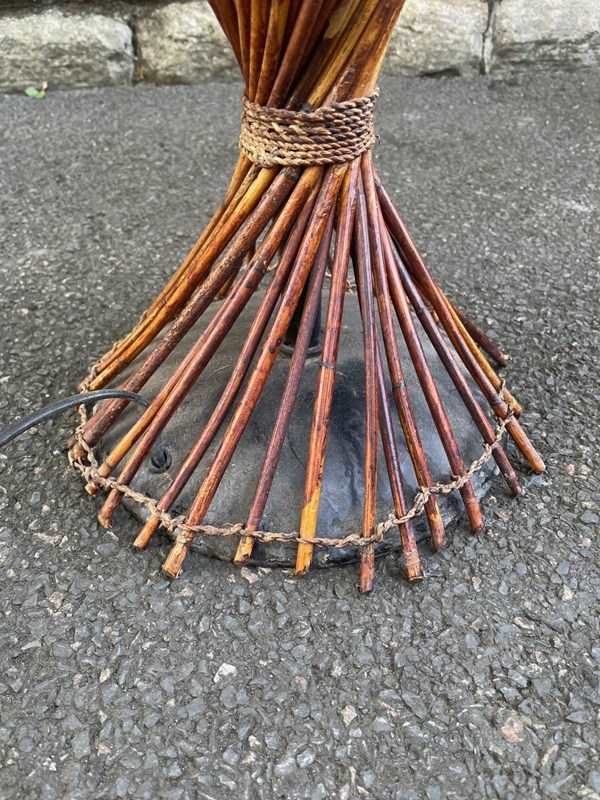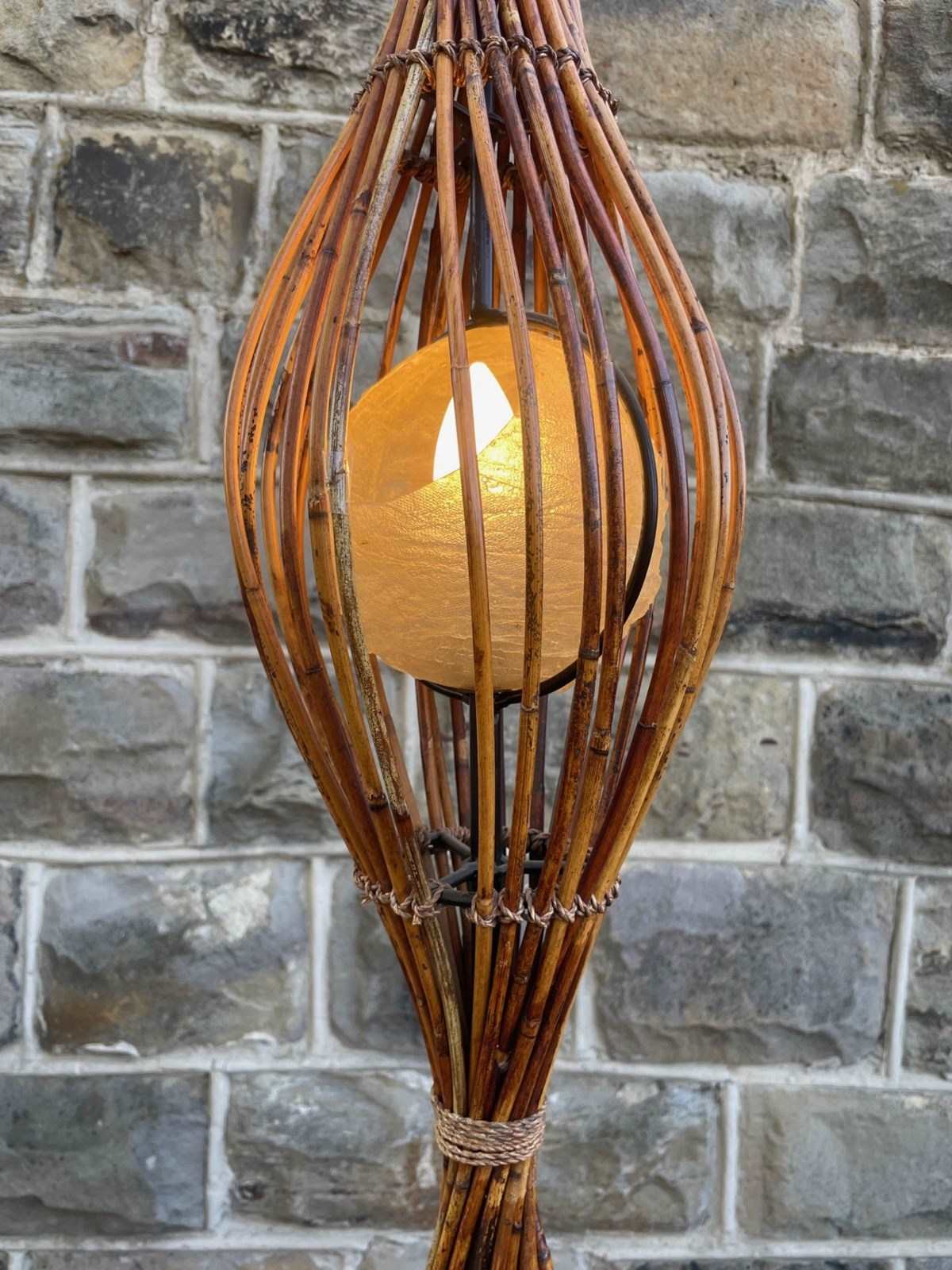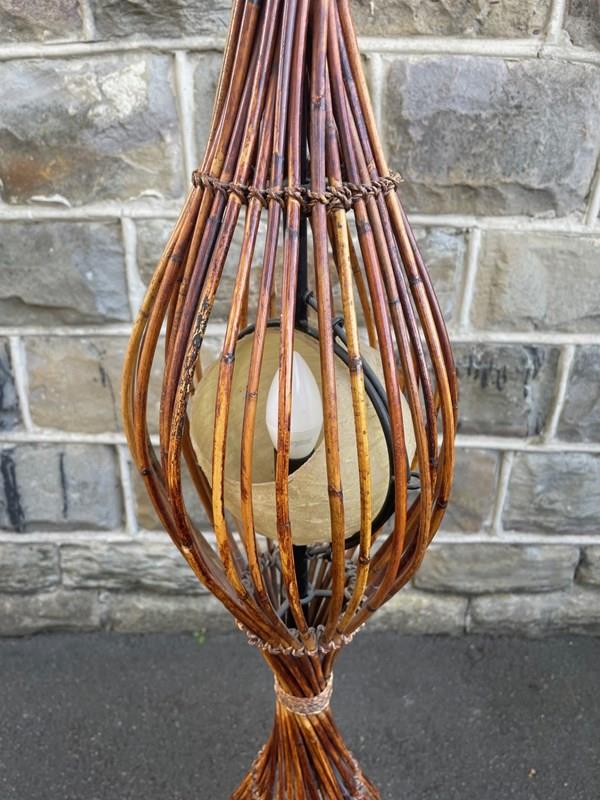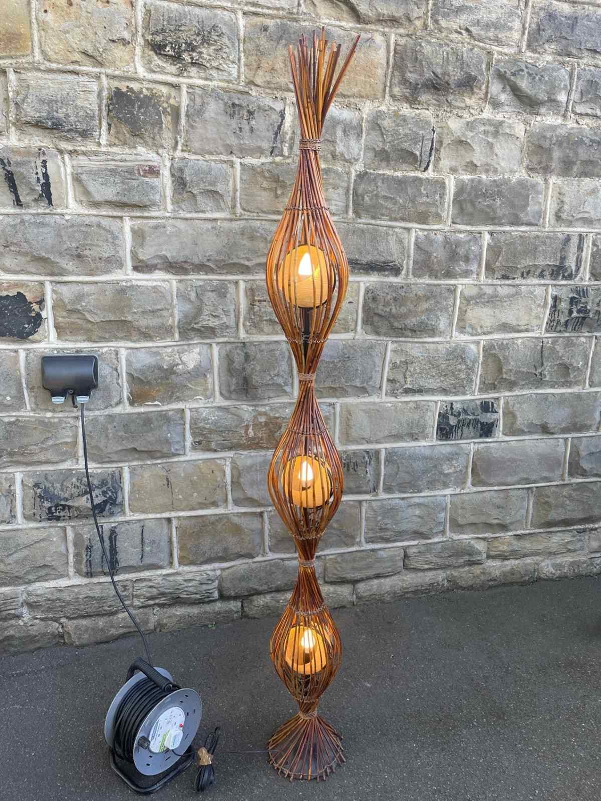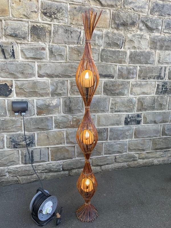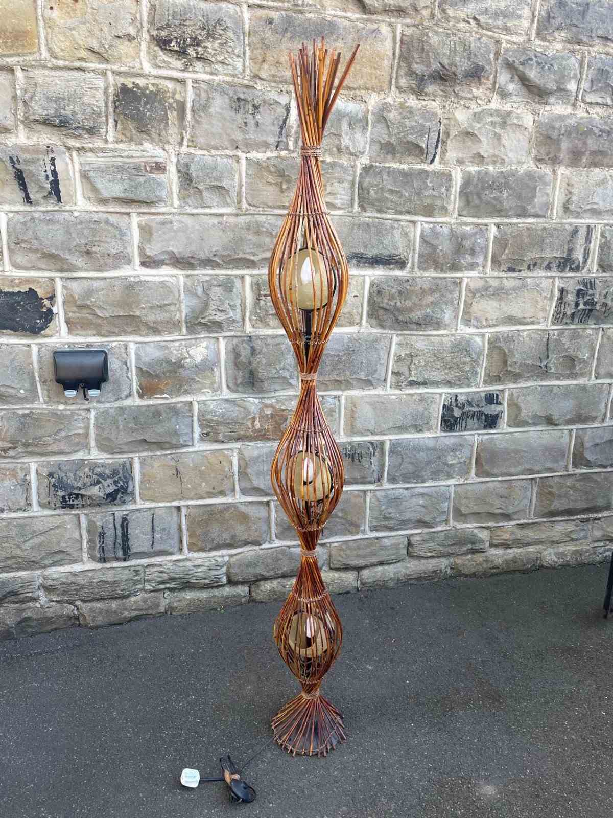 Constructed from thin sticks of bamboo twisted around to make 3 bulbous sections which each have a round shade within .