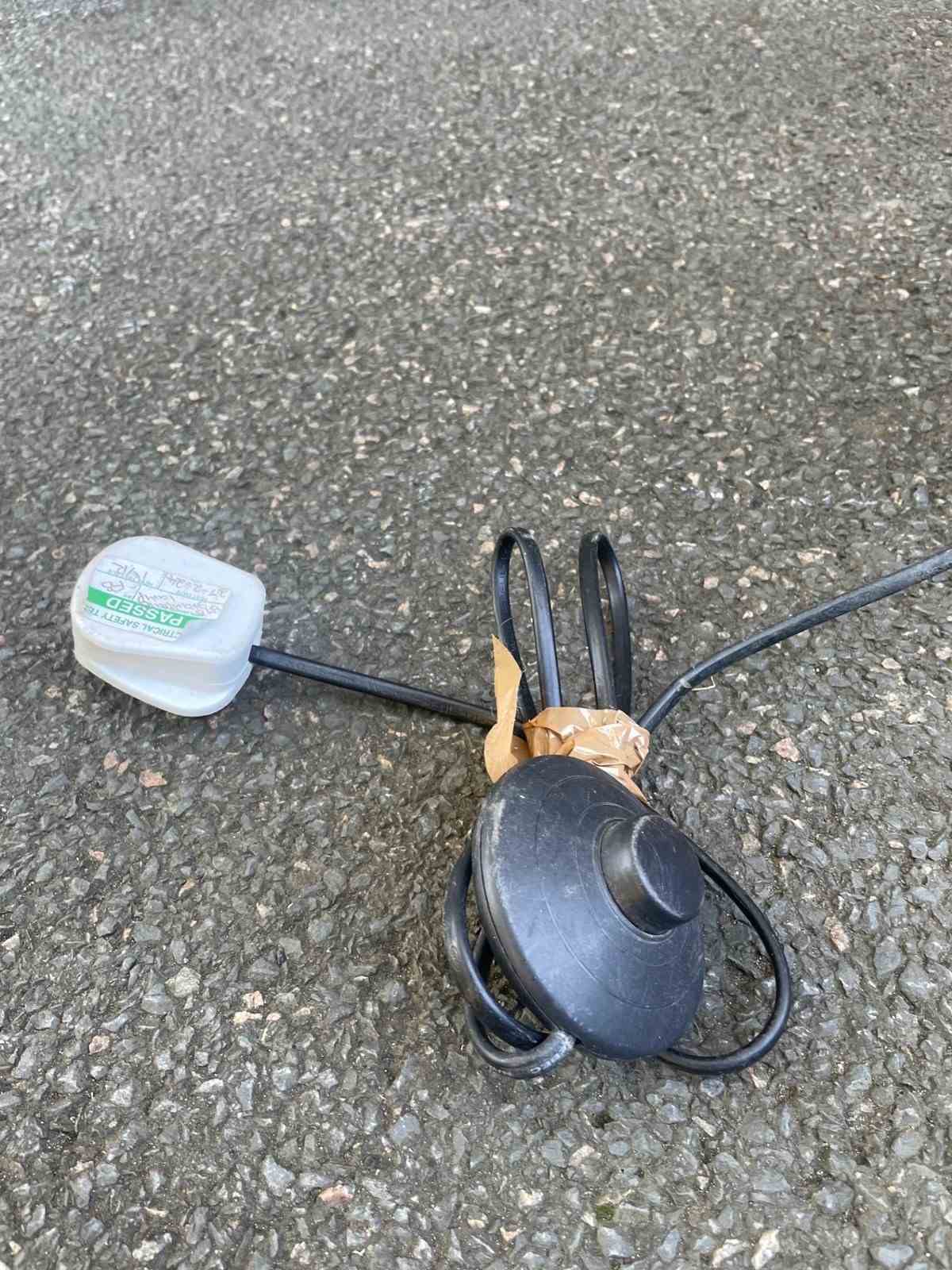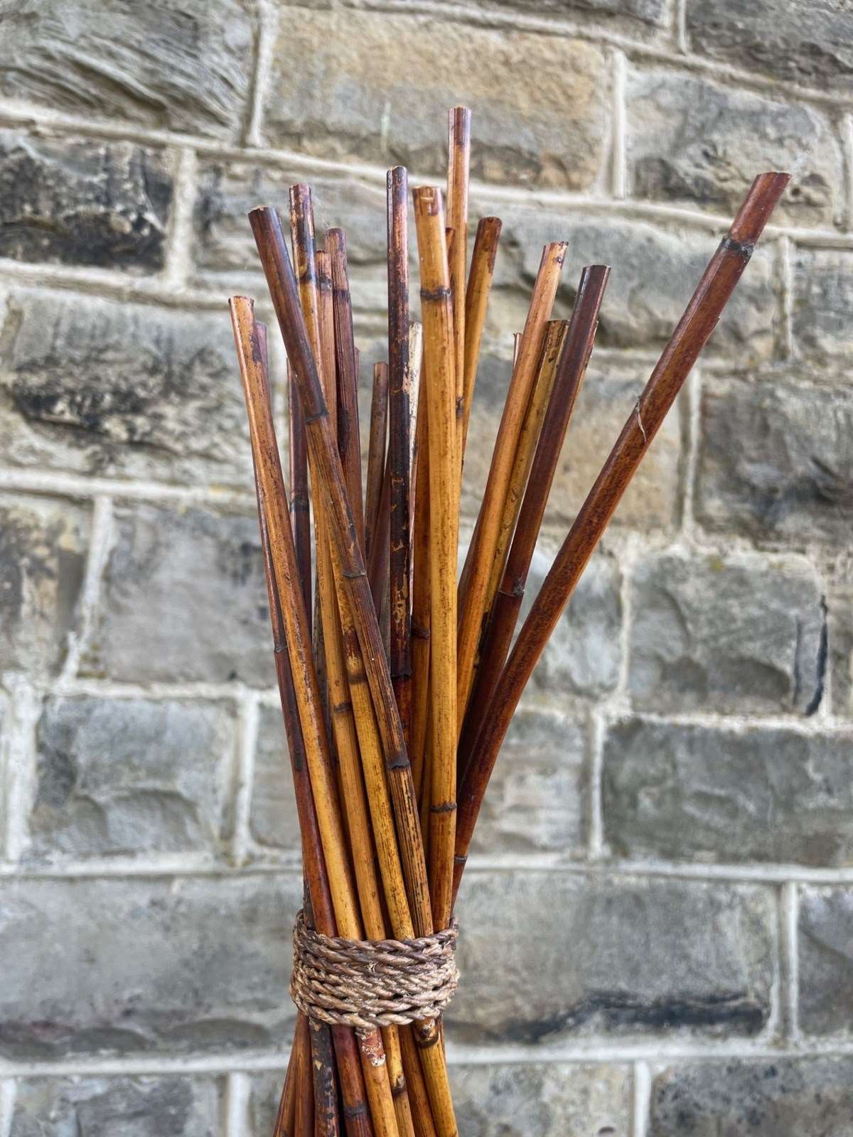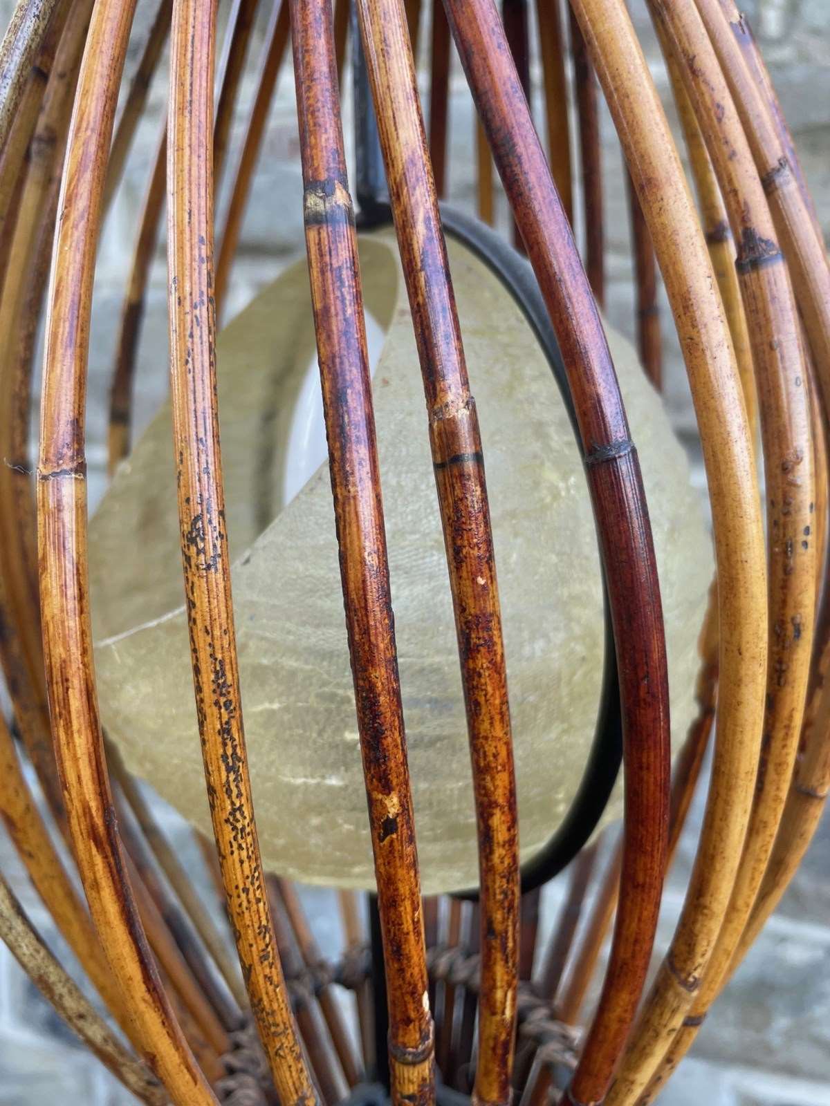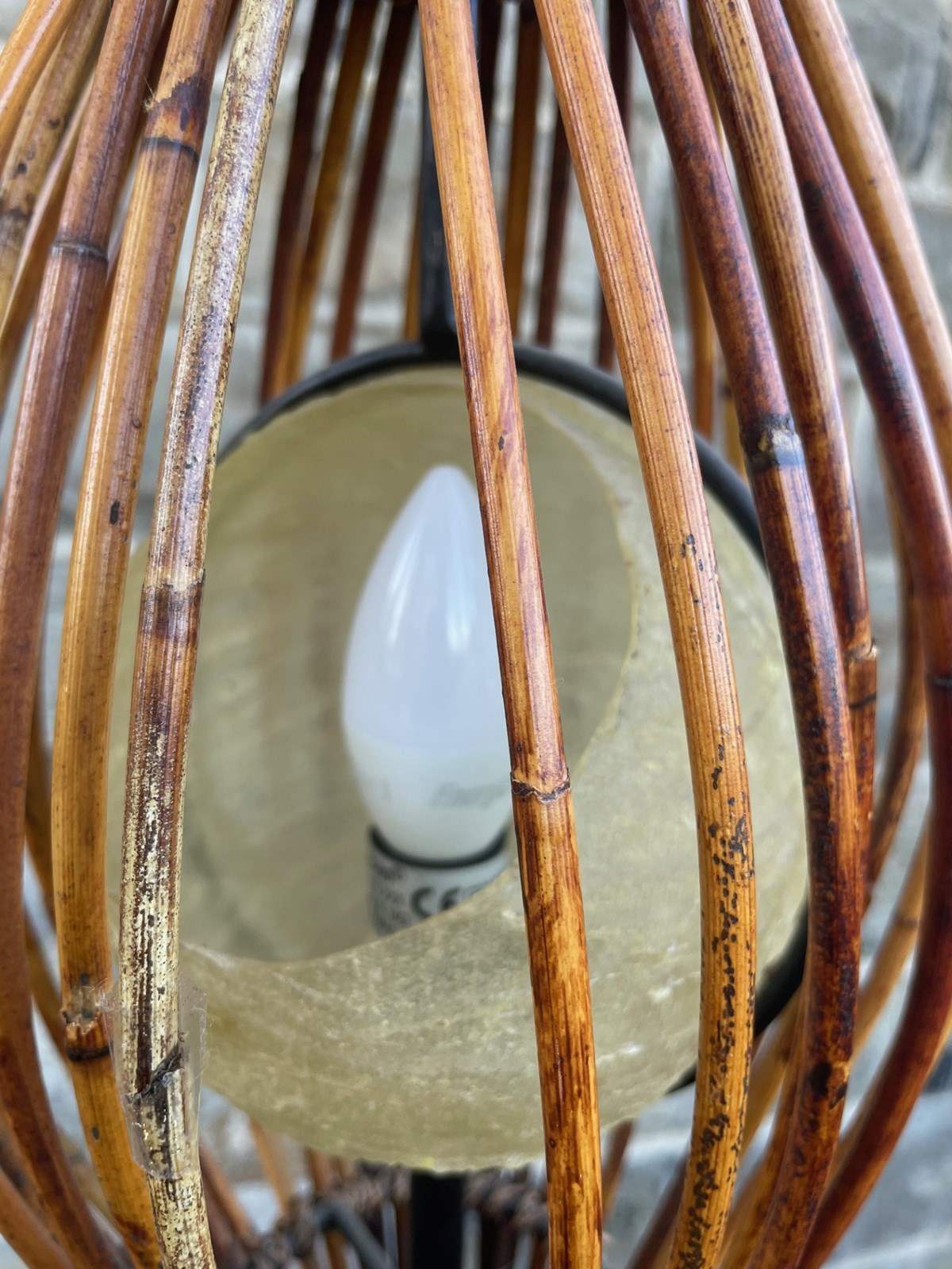 Constructed from thin sticks of bamboo twisted around to make 3 bulbous sections which each have a round shade within .