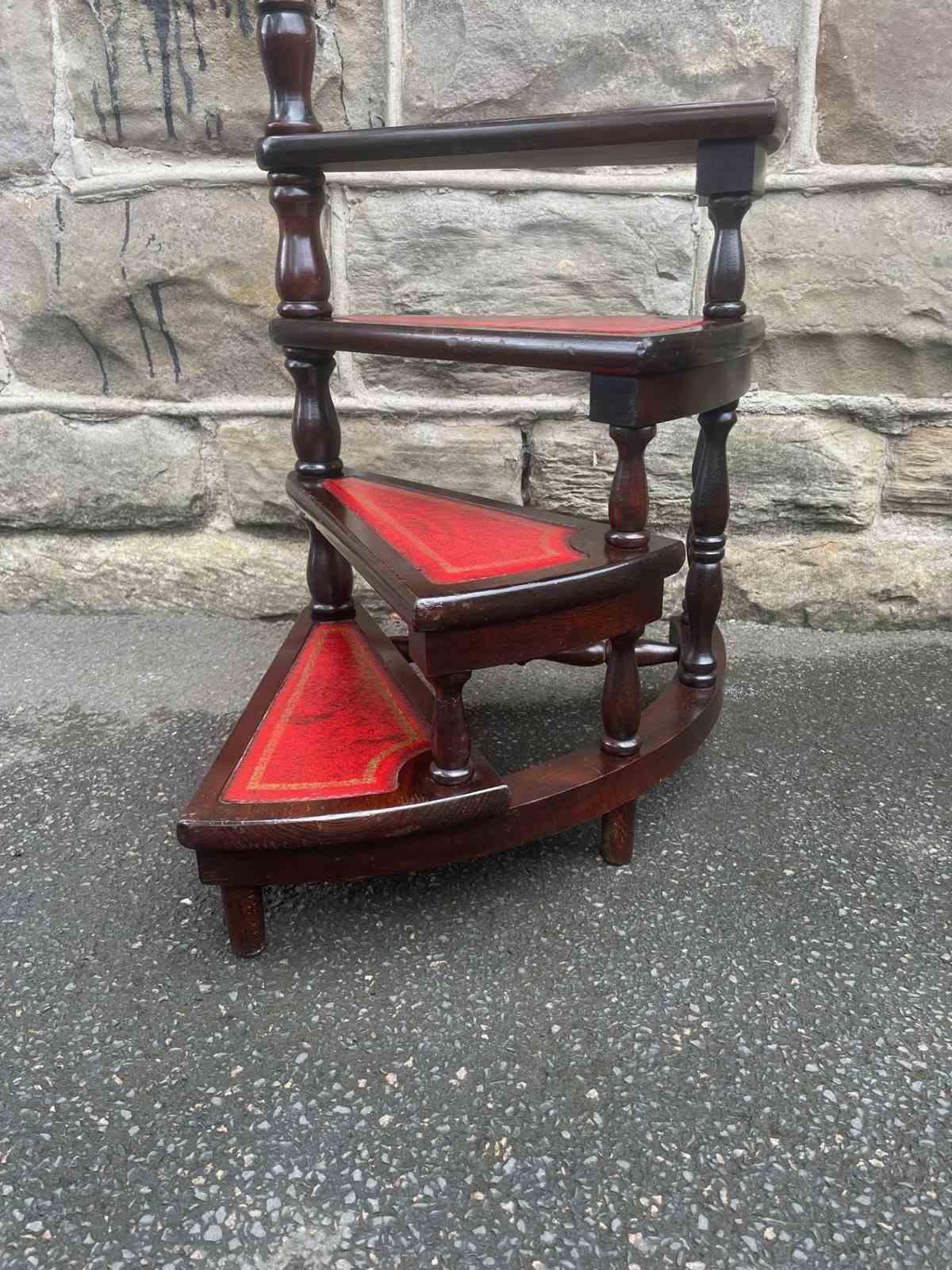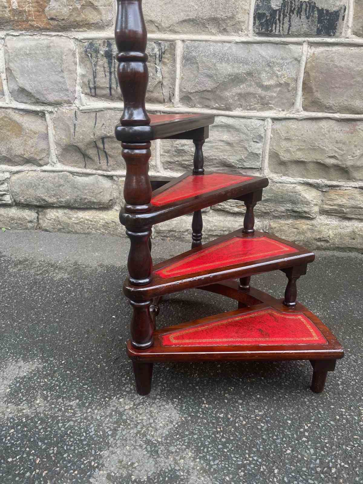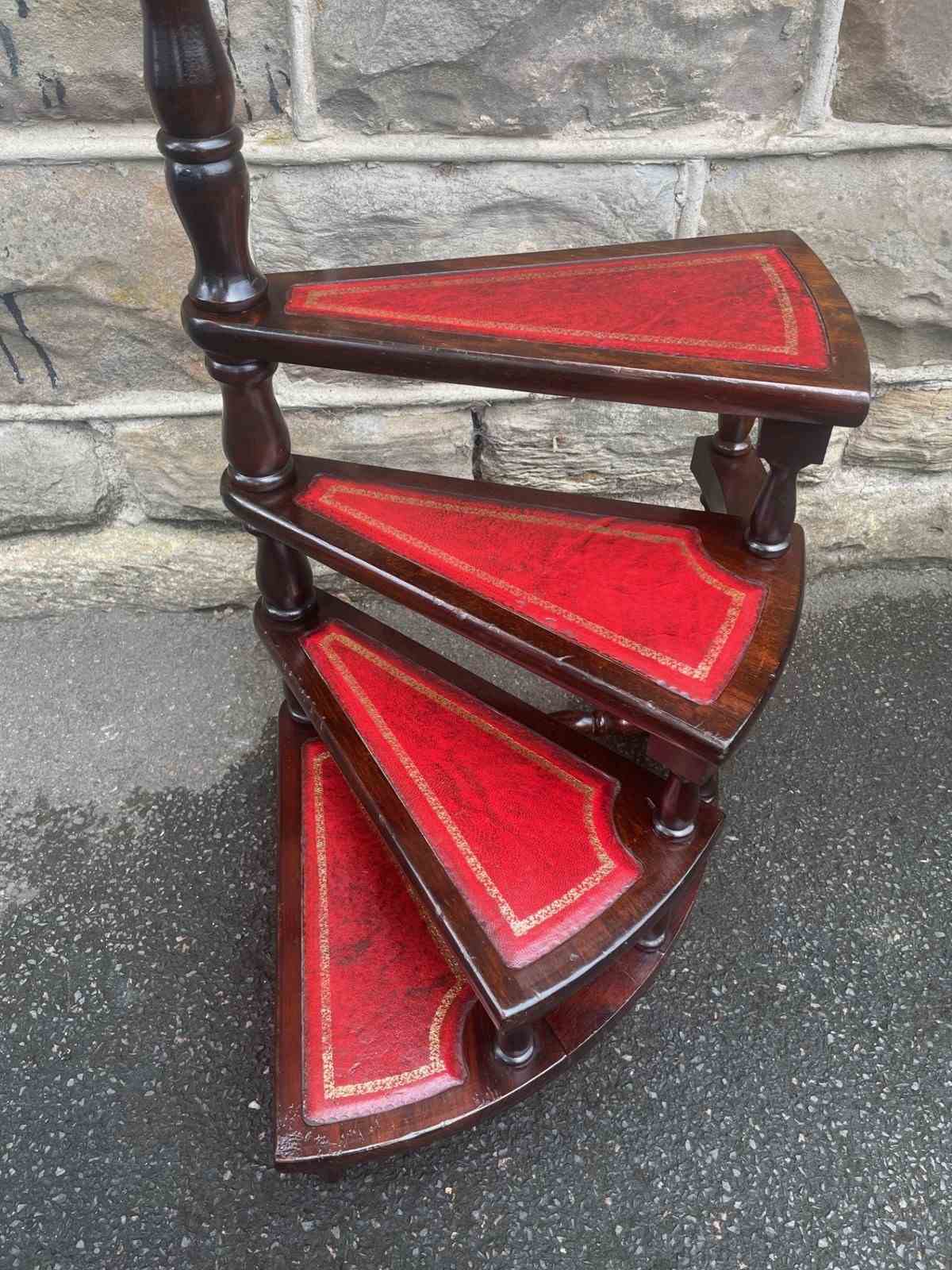 Offered for sale is this very decorative set of library steps, in mahogany having spiral steps with tooled red leather insets, turned handle with brass finial, standing on turned feet. Floor to top step height 21 inches