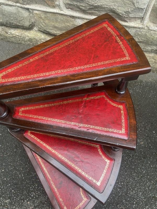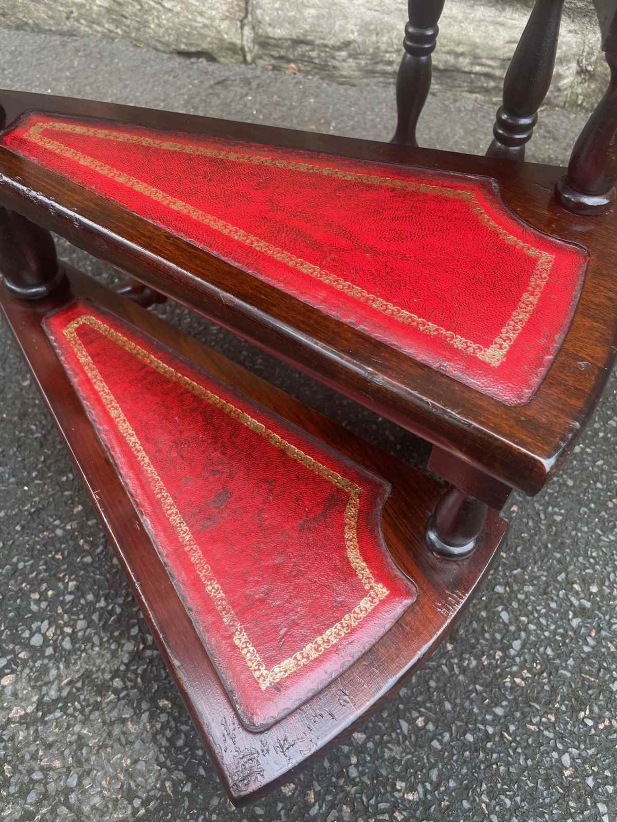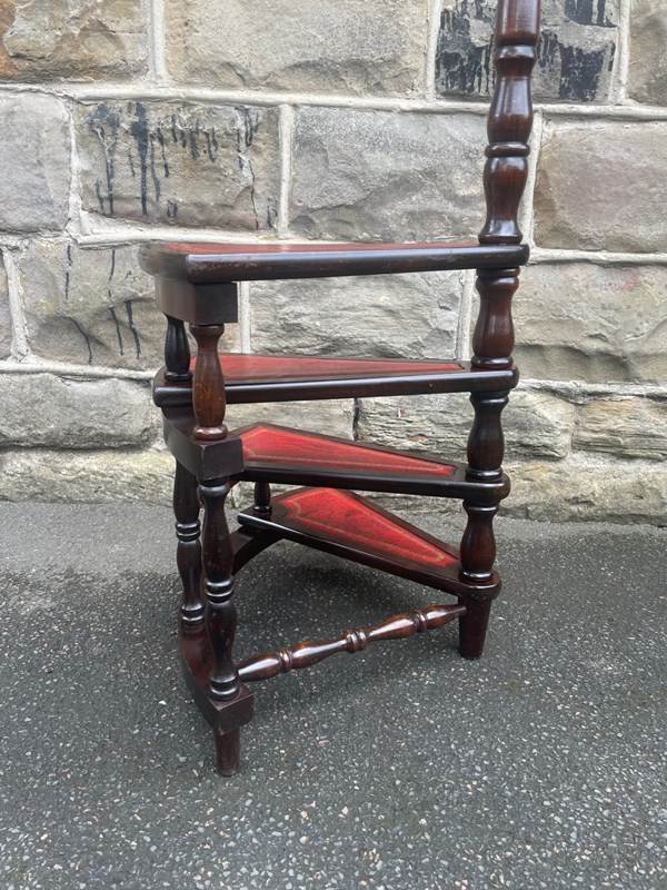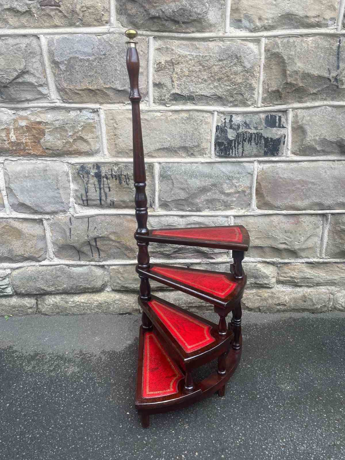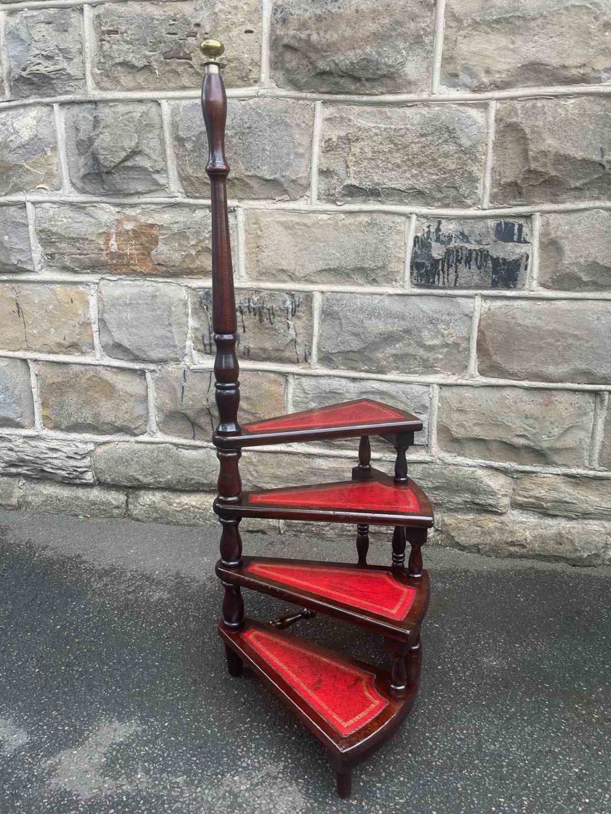 Offered for sale is this very decorative set of library steps, in mahogany having spiral steps with tooled red leather insets, turned handle with brass finial, standing on turned feet. Floor to top step height 21 inches