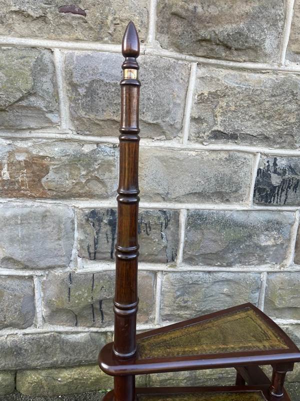 In mahogany having inset tooled leather steps, turned handle standing on turned feet. Floor to top step height 63cm