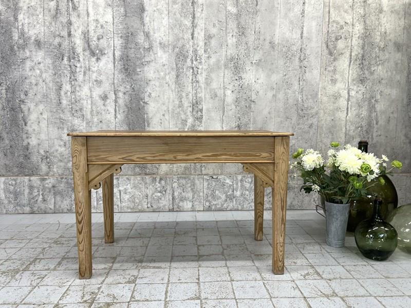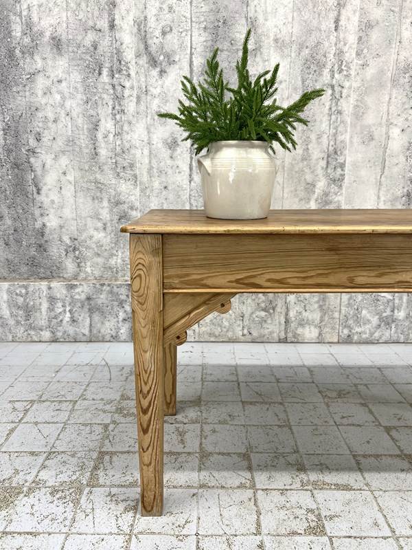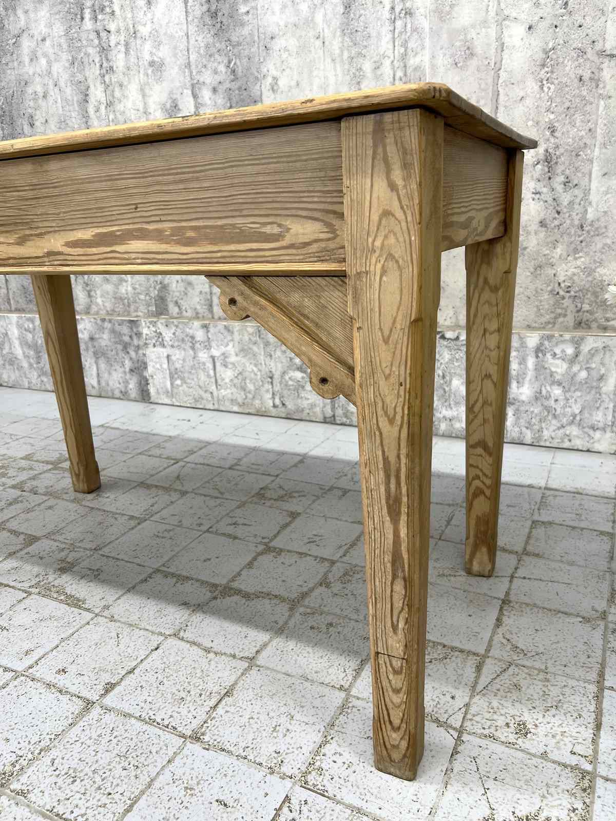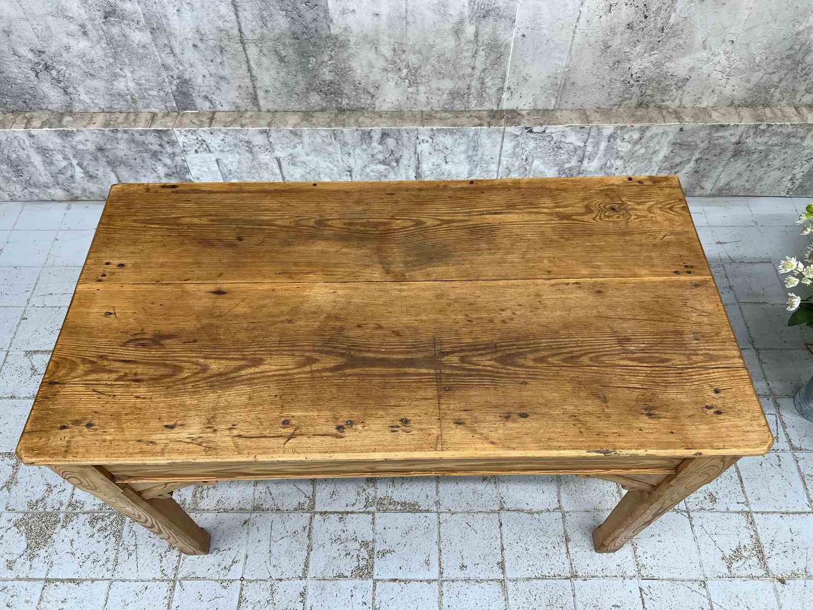 This table is full of character and texture. A traditional French kitchen table in antique pine which still has the original stain. This table is overall sturdy and absolutely suitable for use as a kitchen table or as part of a decorative corner with interesting objects or plants on top.