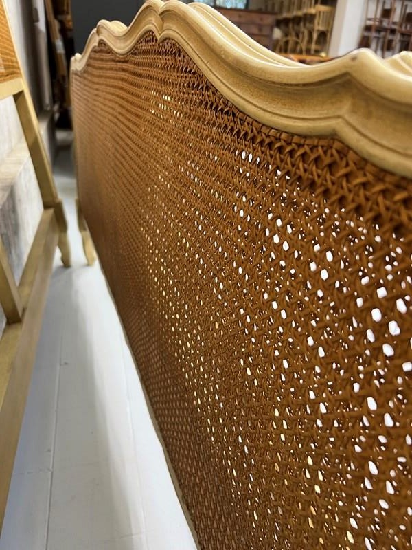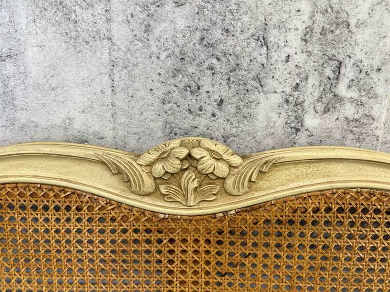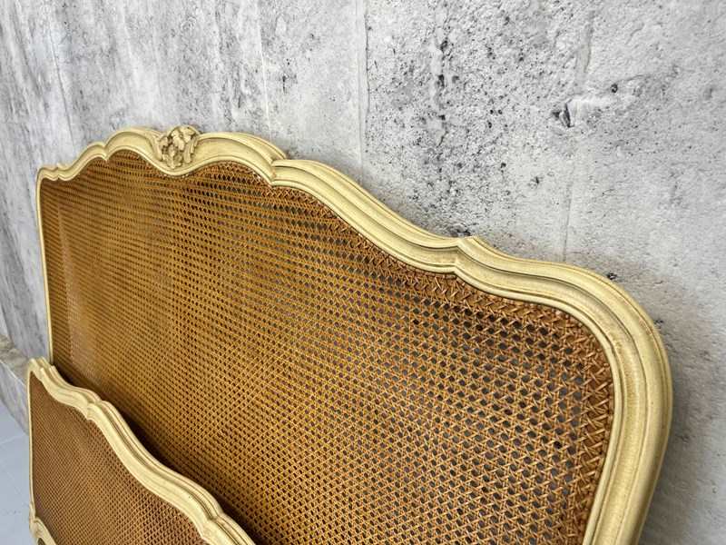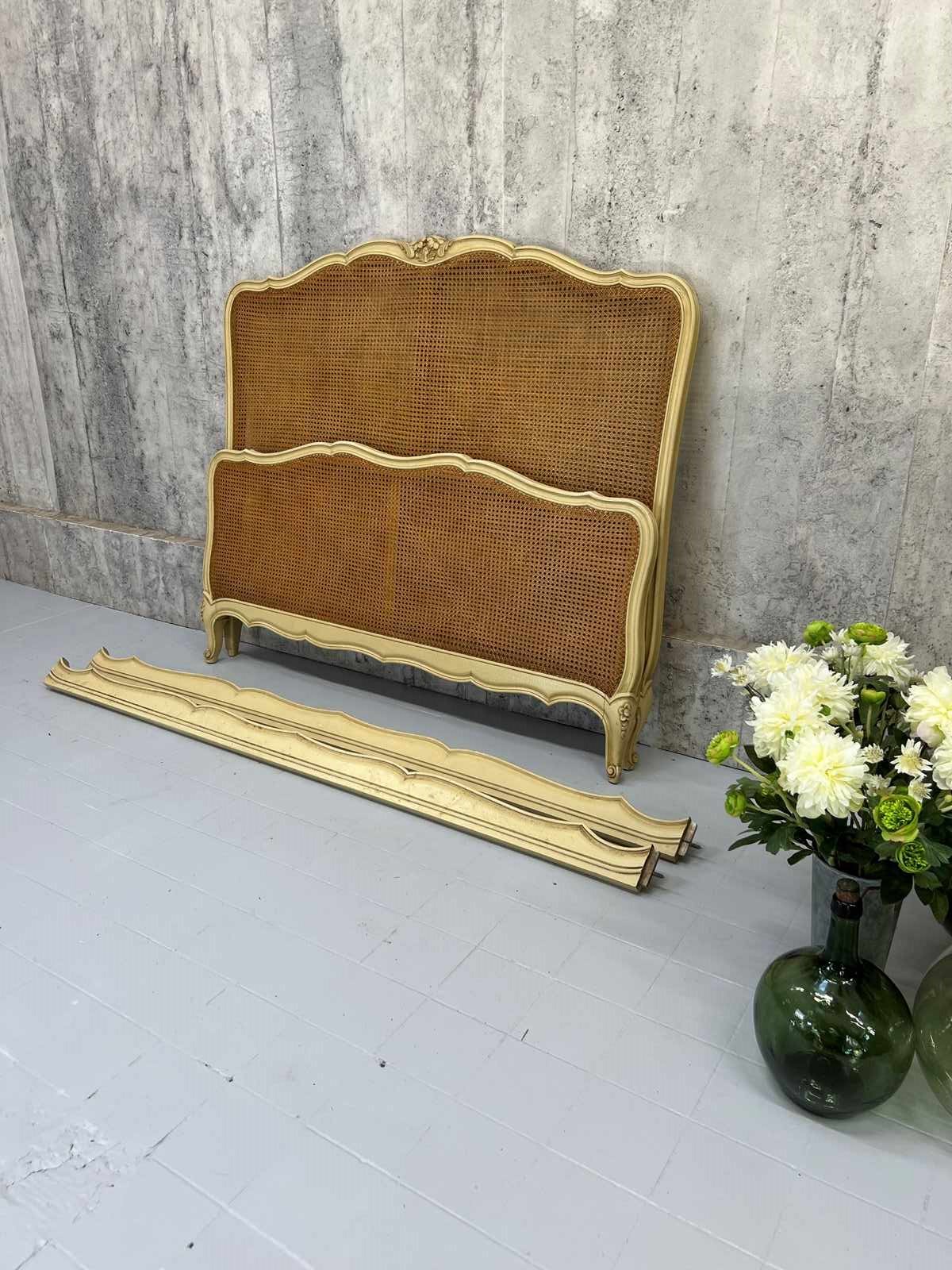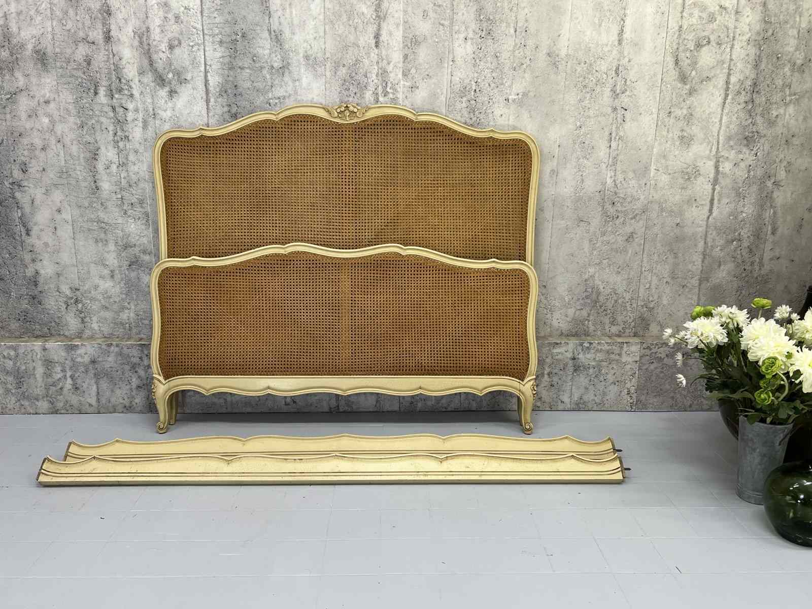 A lovely example of a traditional painted 'shabby chic' French cane bed frame. The paint is original and the cane work is in excellent condition.. The head board is single thickness and the foot board has a double layer of cane. The frame can be fixed onto a modern bed base or clever clients have fixed flat pack bed bases to the frame which also works brilliantly. Increasingly difficult to source. All original and ready to use.