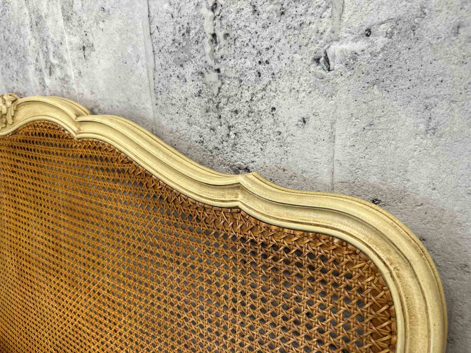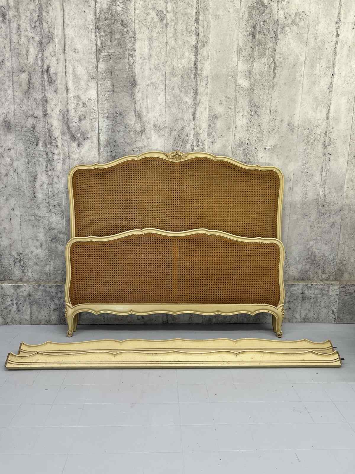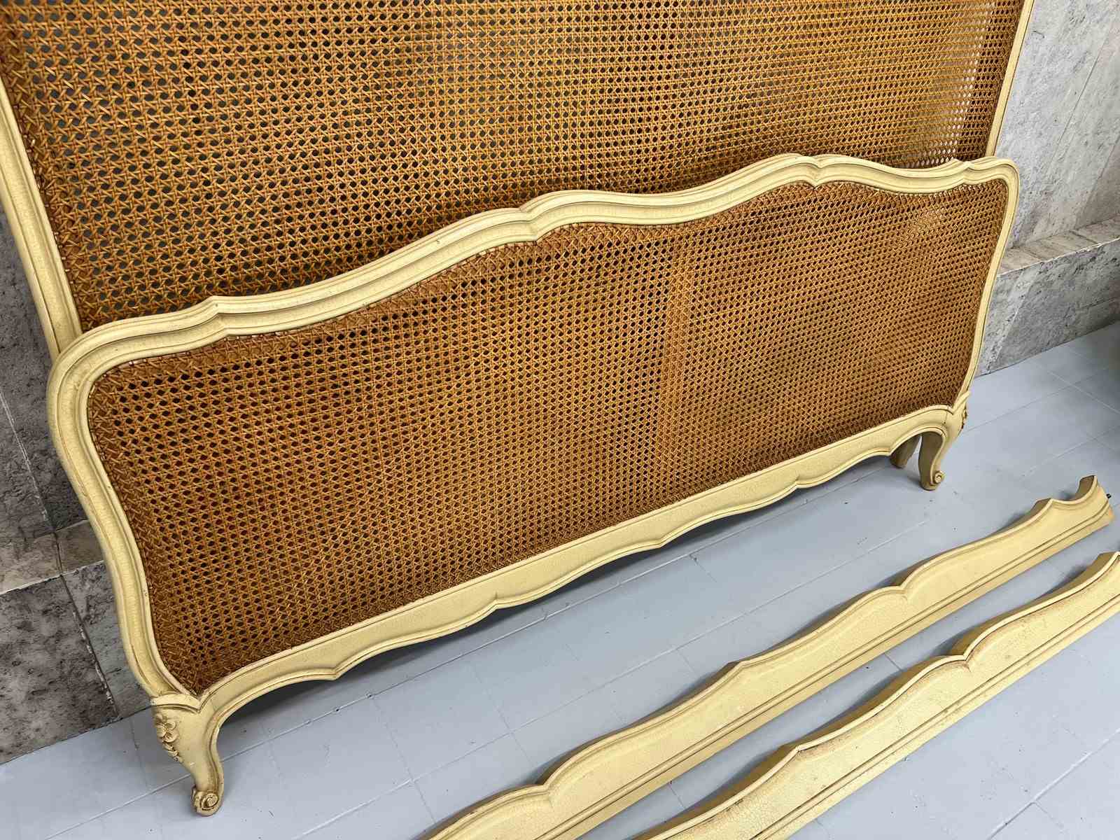 A lovely example of a traditional painted 'shabby chic' French cane bed frame. The paint is original and the cane work is in excellent condition.. The head board is single thickness and the foot board has a double layer of cane. The frame can be fixed onto a modern bed base or clever clients have fixed flat pack bed bases to the frame which also works brilliantly. Increasingly difficult to source. All original and ready to use.
