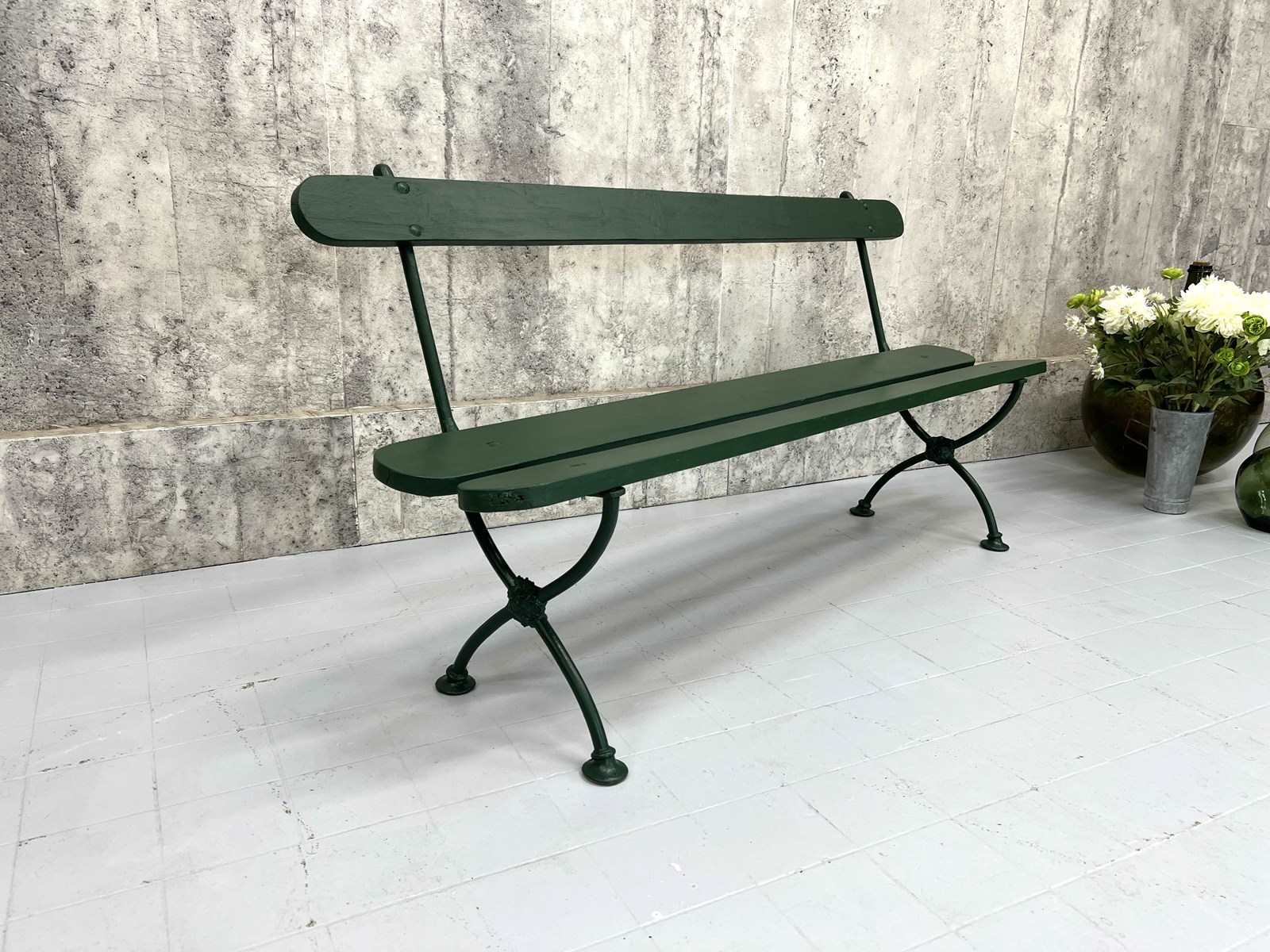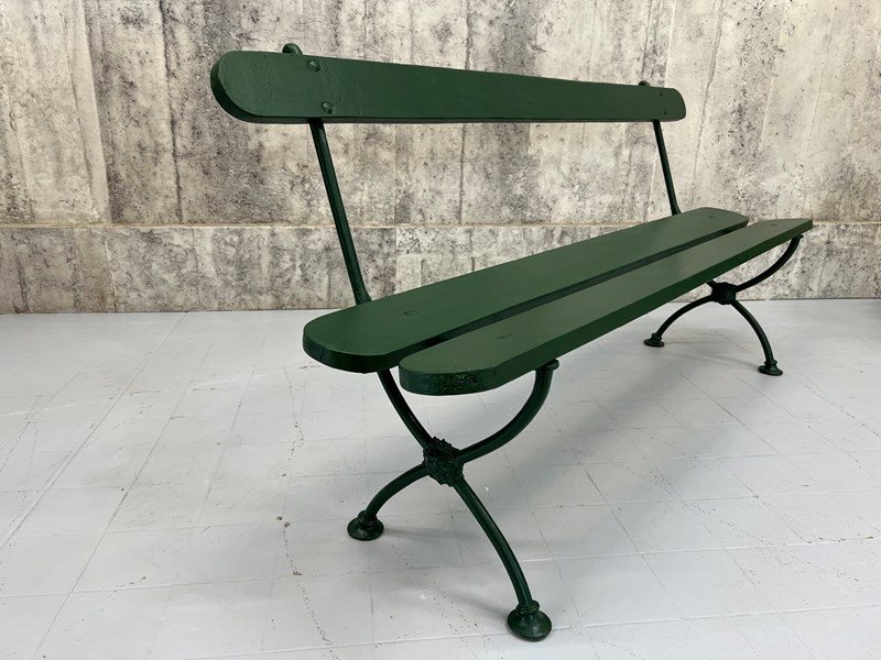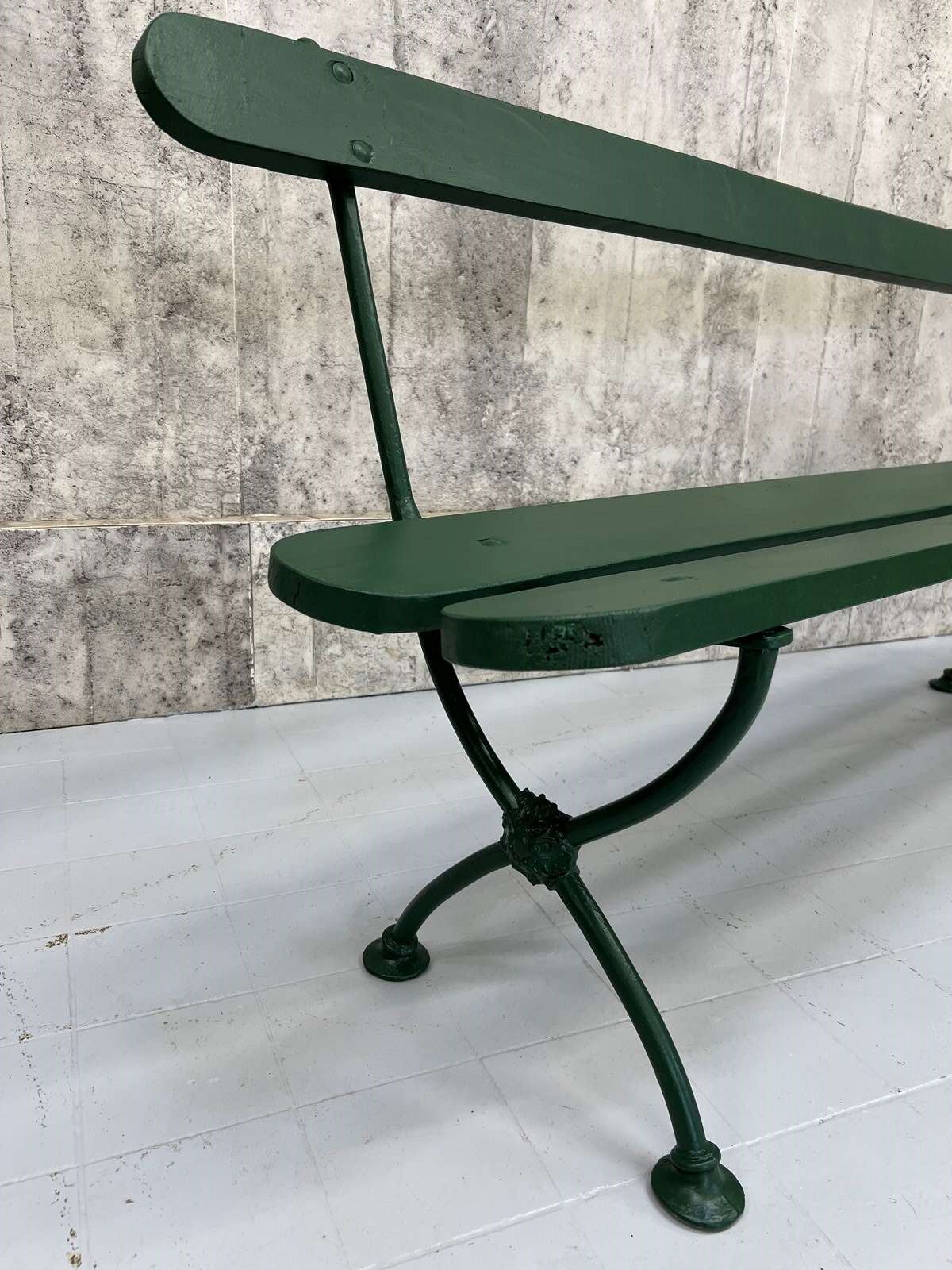 A beautiful metal and wooden vintage bench from France which has been finished in this fabulous forest green paint. A wonderful addition to a garden, an alfresco dining area or a terrace. In great condition, ideal to marry with a vintage table or a new one, or sitting in your garden positioned to enjoy your favorite view. Ready to use as it is. A wonderful find ready for a modern home.
