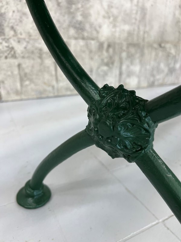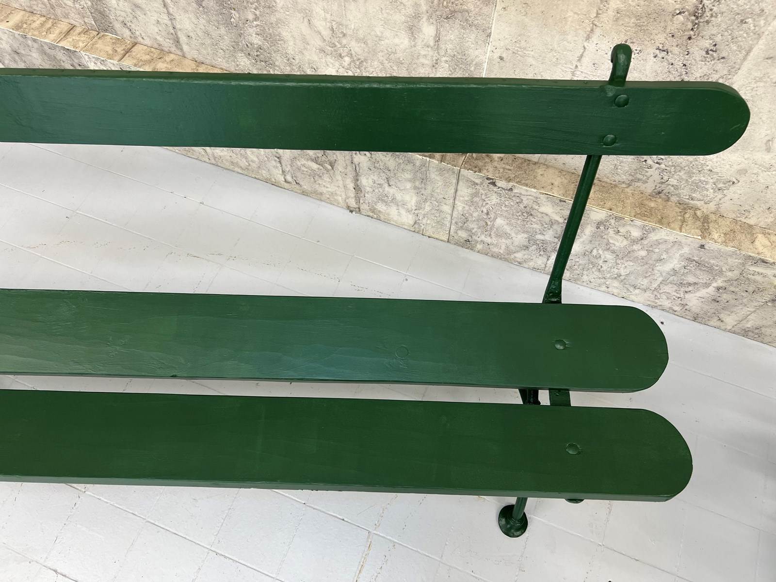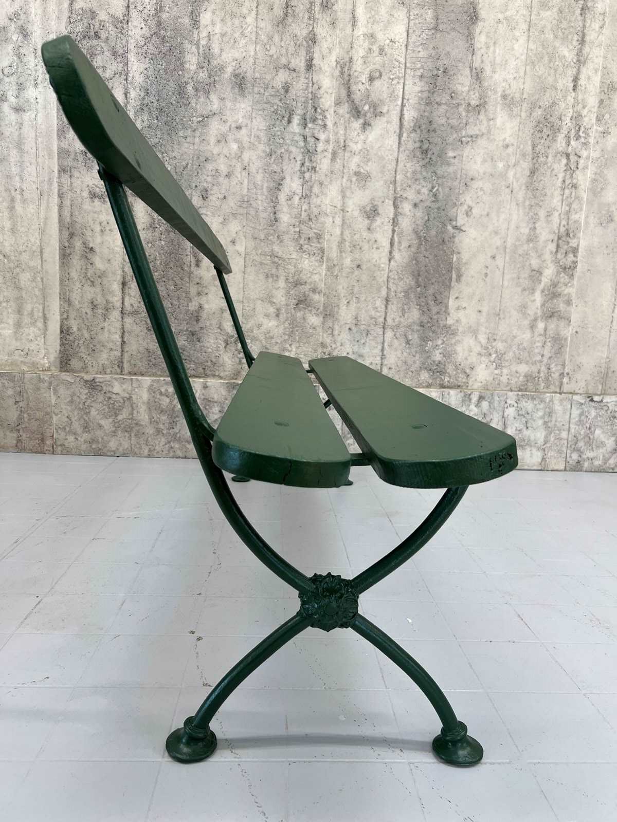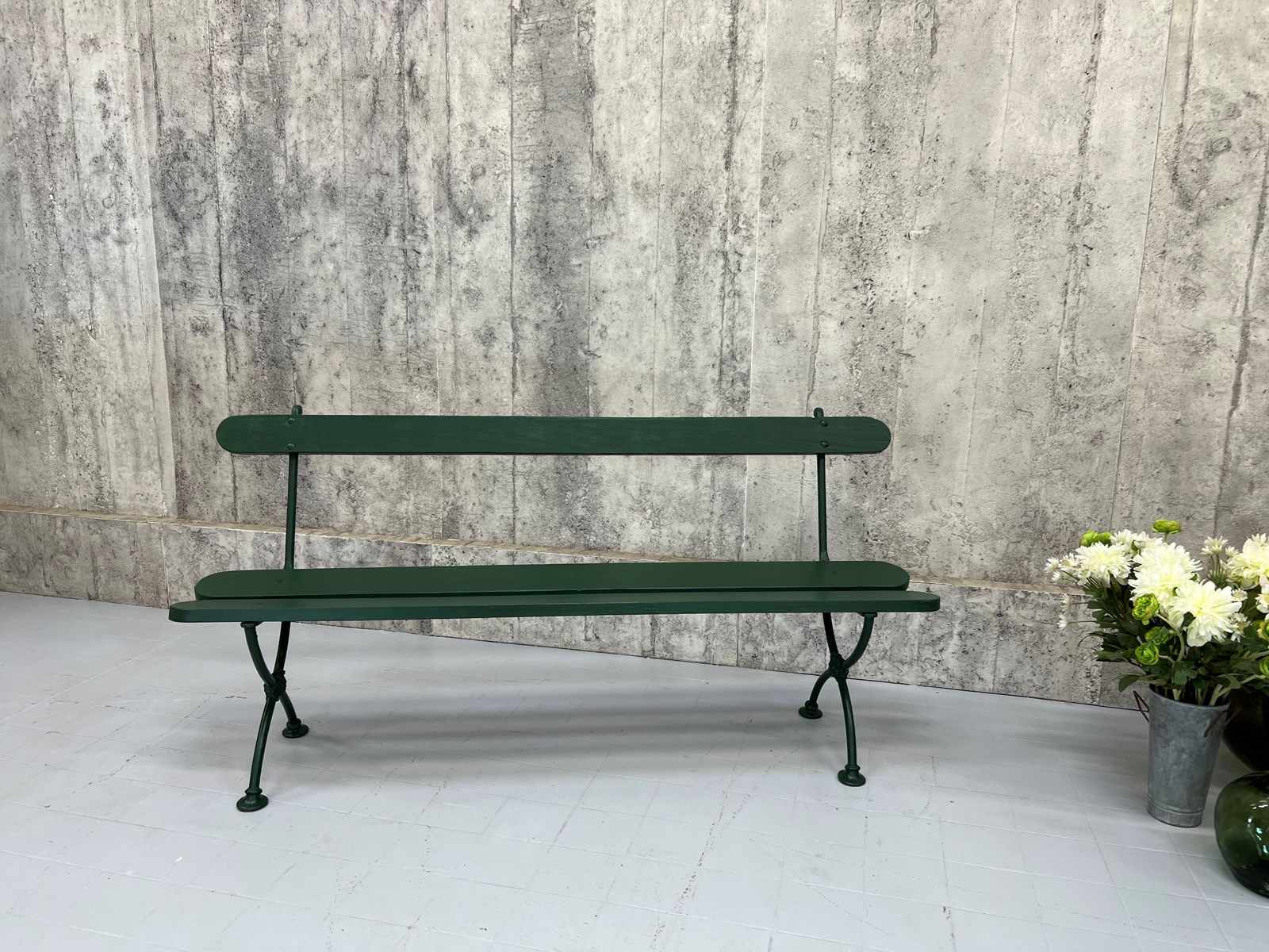 A beautiful metal and wooden vintage bench from France which has been finished in this fabulous forest green paint. A wonderful addition to a garden, an alfresco dining area or a terrace. In great condition, ideal to marry with a vintage table or a new one, or sitting in your garden positioned to enjoy your favorite view. Ready to use as it is. A wonderful find ready for a modern home.