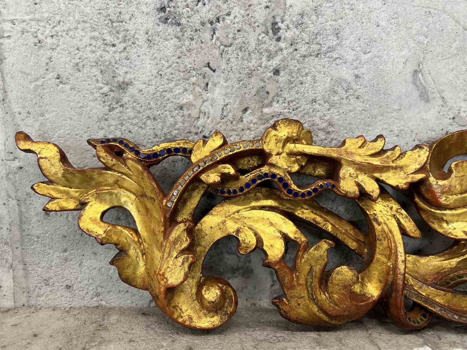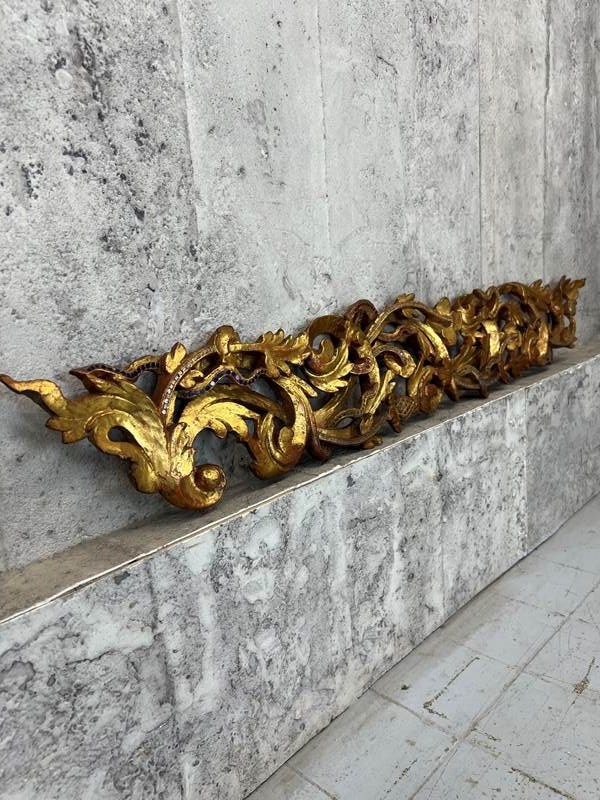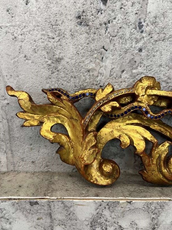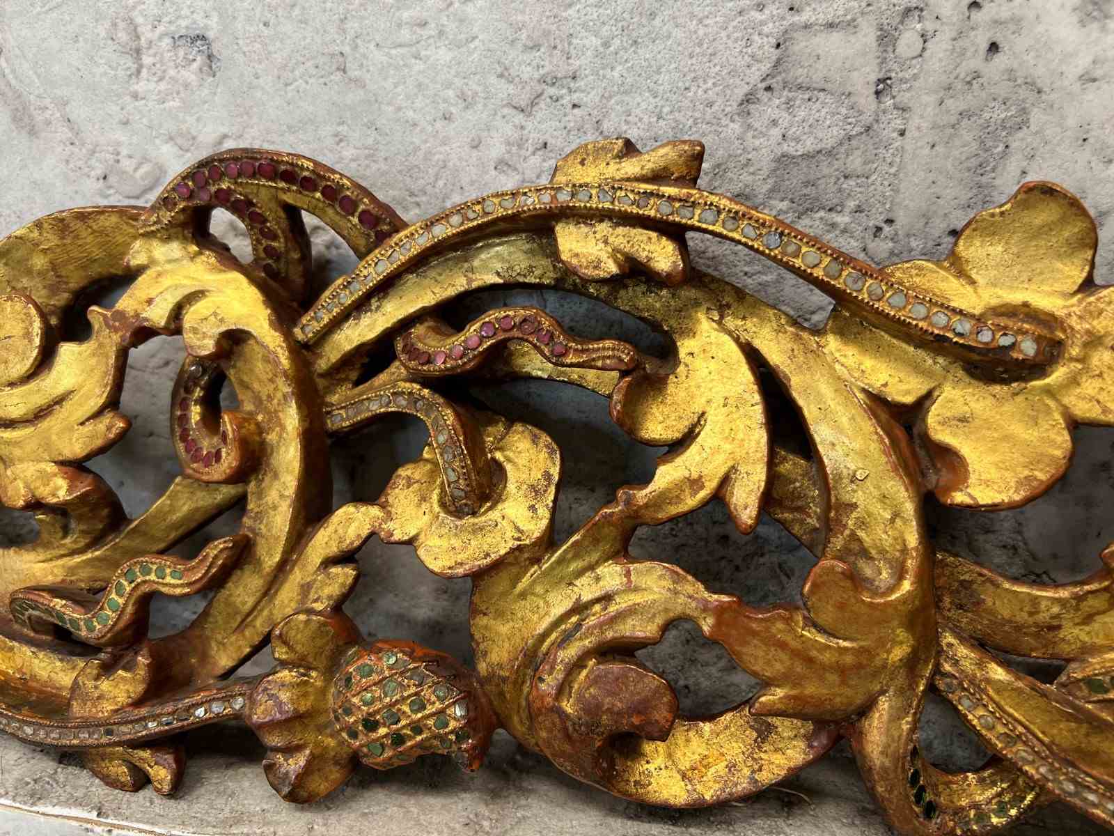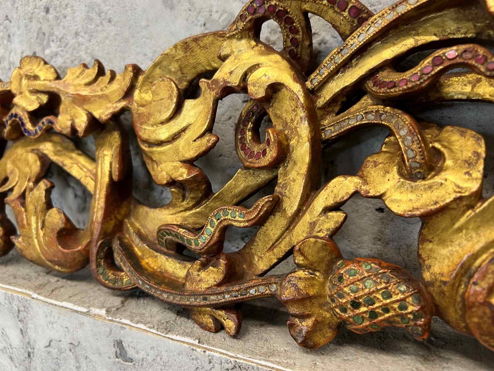 An incredible and unique door surround from Burma in the 18th century. Made from hand crafted Teak which has been water gilded and decorated with coloured glass chips. This is a stunning piece.. ideal for festive decorations.. the carving is in floral and serpentine shapes, with the glass chips offering additional decoration to the serpentine figures.