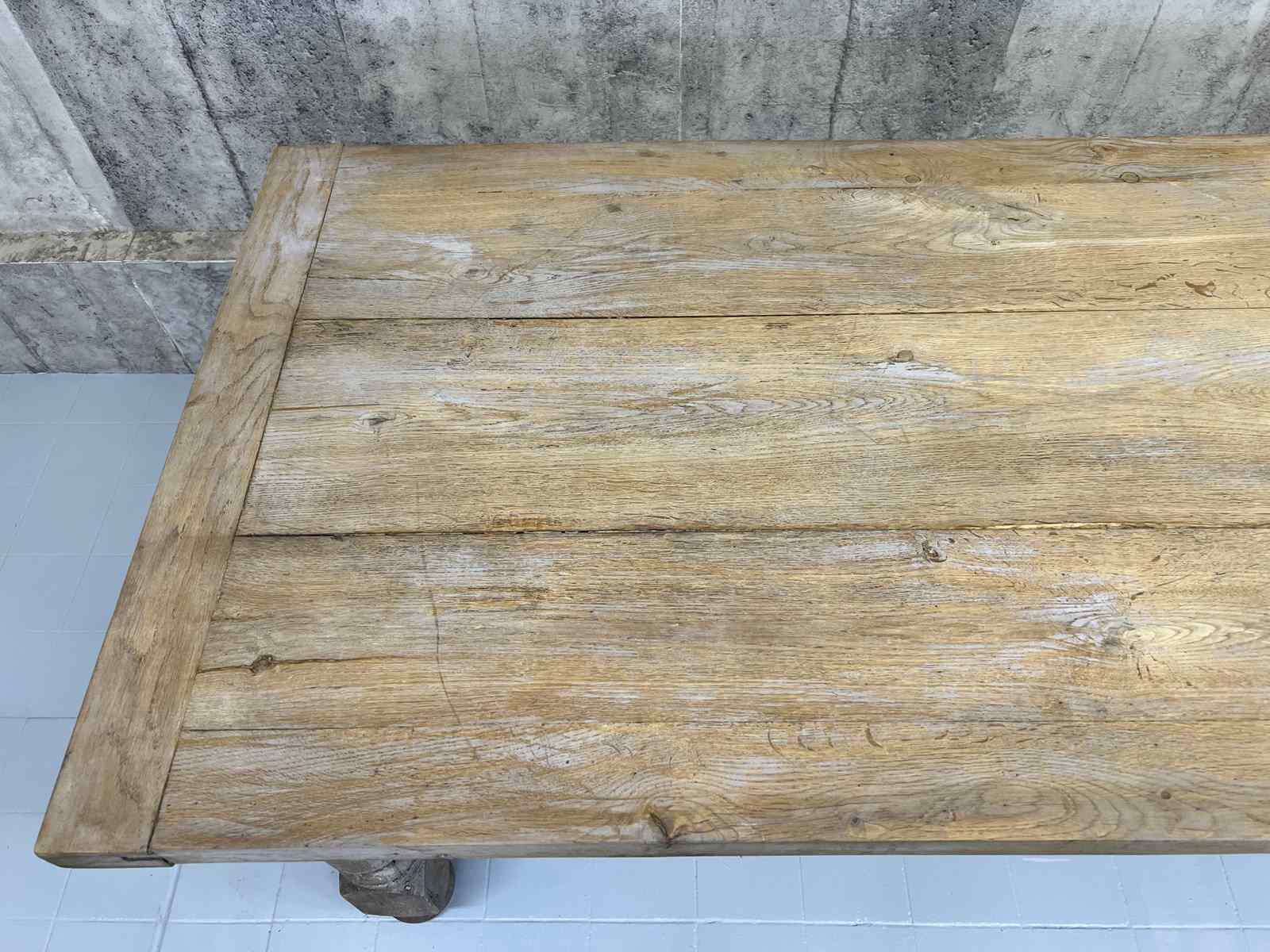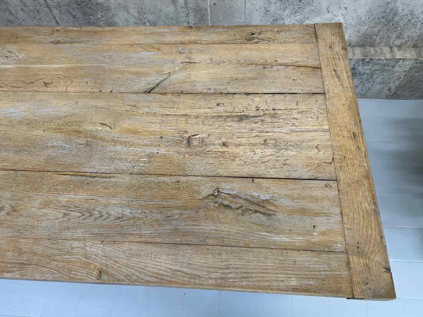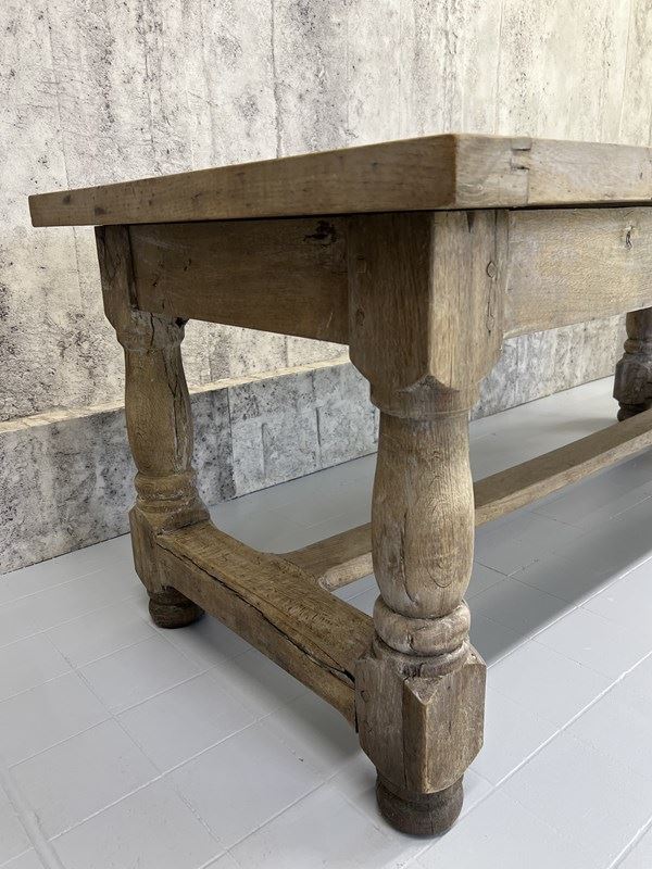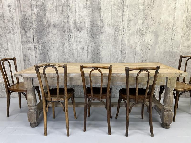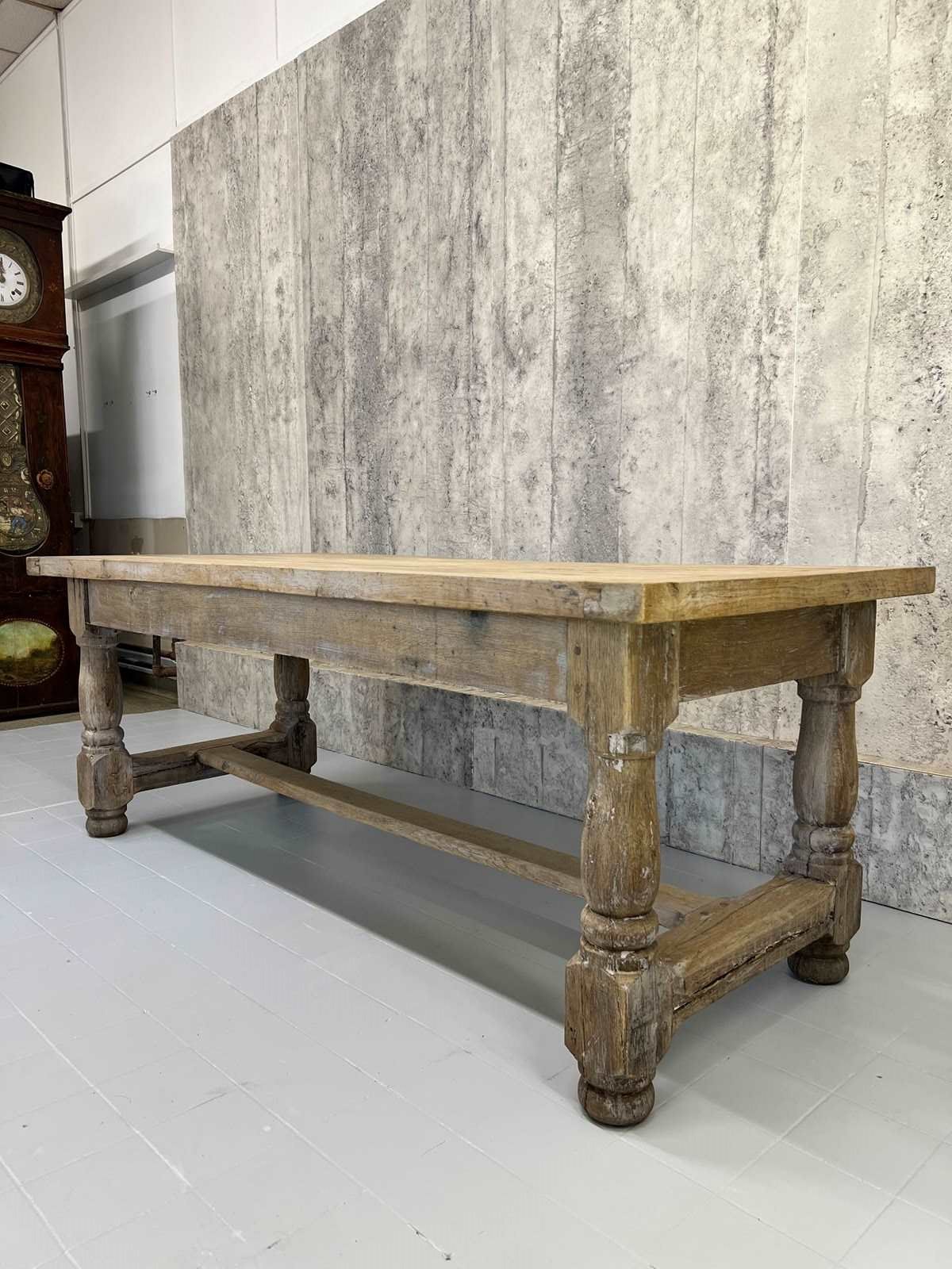 This is a classic rustic stripped French Farmhouse table, with strong turned legs with a stretcher, perfect for use in a modern kitchen or dining room. Ready to use as it is, or it is possible to treat the wood to match your scheme. The solid oak has evidence of an old grey painted finish in parts to the base and table top, which can be removed should you wish so, but to me, it is a layer to the story and adds a charm to the table. It mostly goes unnoticed once the table is laid and chairs are placed around it. The table top is separate from the base and so can more easily maneuver through smaller spaces. Ready to use as it is. Able to seat up to 8 comfortably. Sturdy, simple, solid. Classic.