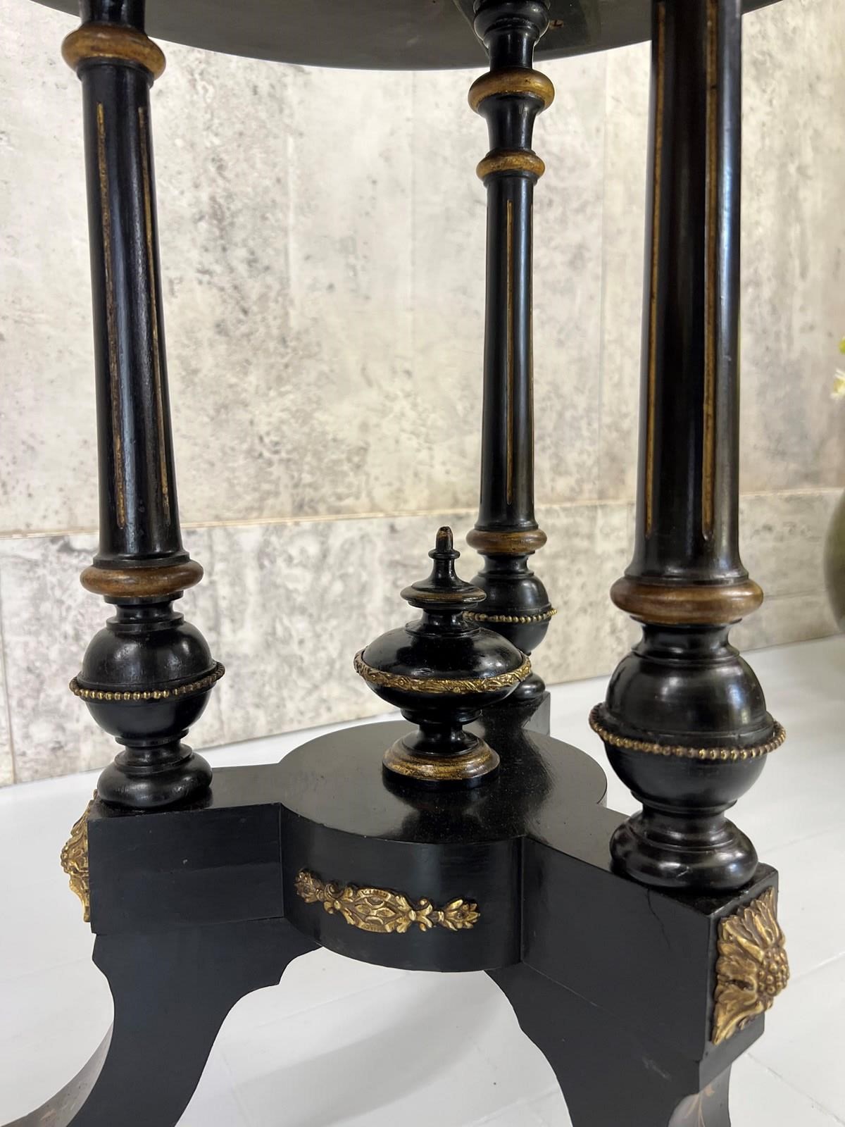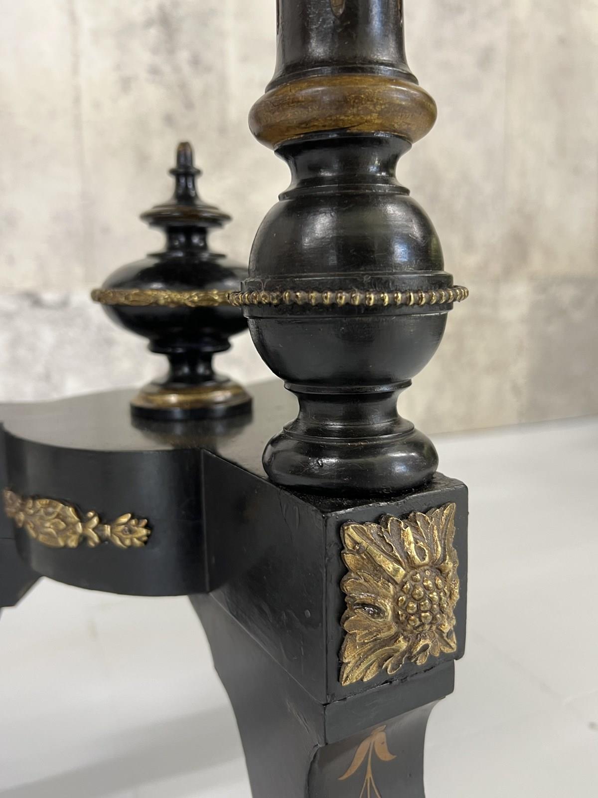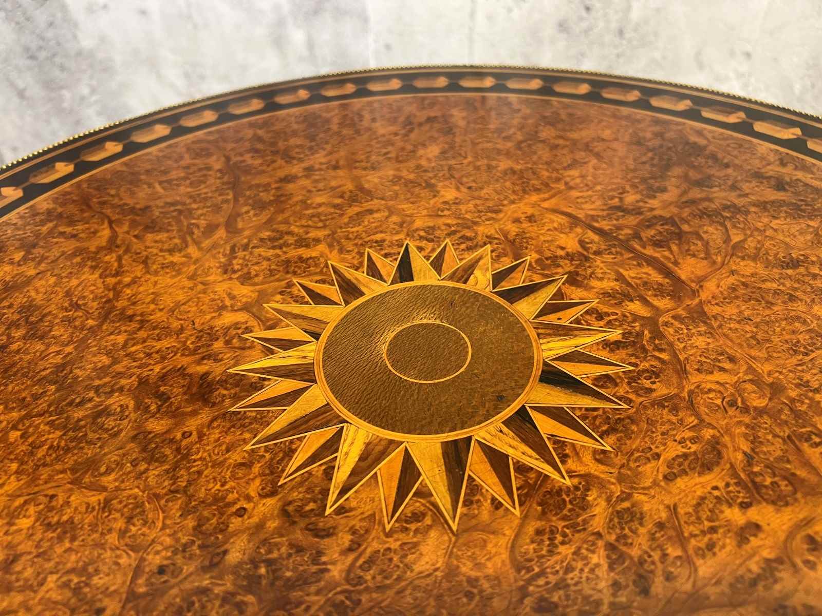 A museum piece. Quite literally. The top consists of an amboyna inlaid chain border. The border has stringing made from boxwood, rosewood and pear wood. The marquetry inlays are lacewood, tulipwood, and Pear. In the center of the Amboyna burr, the central inlay has lacewood, boxwood stringing and the inlays contain rosewood, ash, kingwood, tulipwood, satin wood, pear and other fruitwoods. The base is ebony veneer with parts embossed. The legs are ebony veneer inlayed with boxwood. The metal decoration is brass gilded with Ormolu.