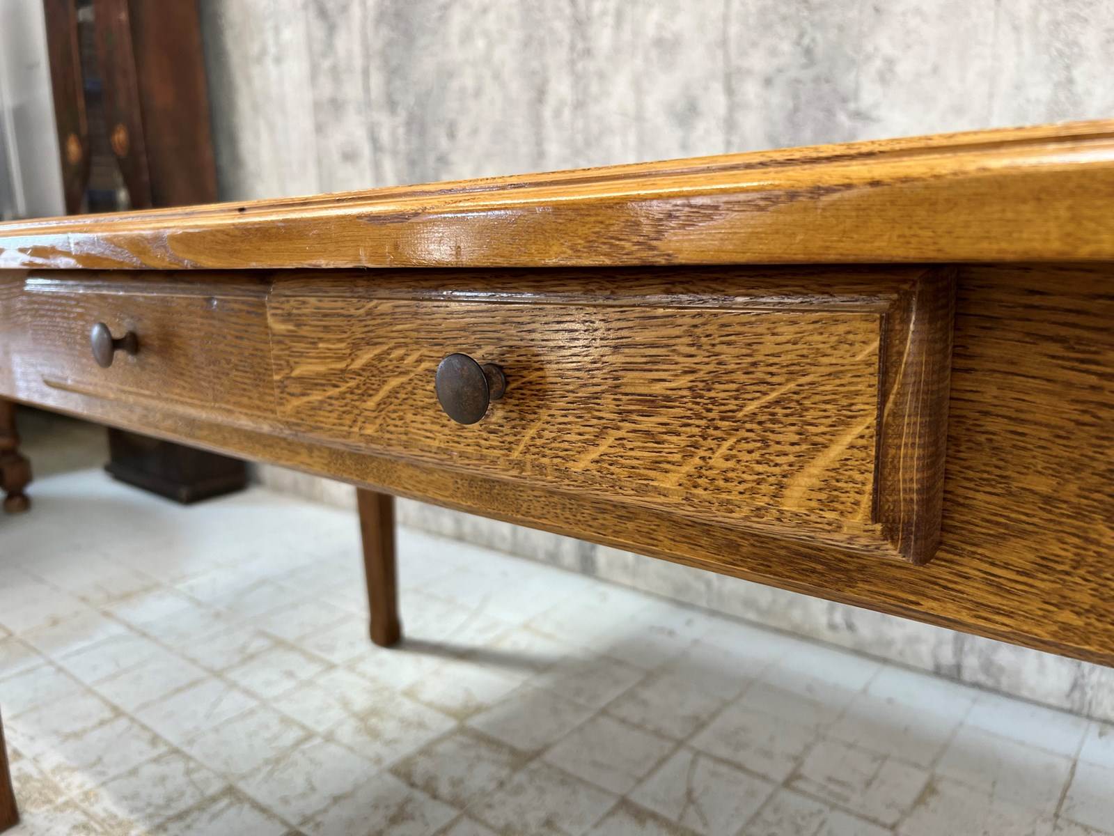 This table is absolutely beautiful. A Mid Century example of this classic table style. Really good choice for a small space as its easy to fit lots of chairs around the table. There are two useful drawers in the side of the table too. Please take a moment to look at the table top.. using the markings of the wood.. its beautiful. Will easily sit upto 8.. depending on your chair size. The top as had a gloss varnish finish. Stunning!