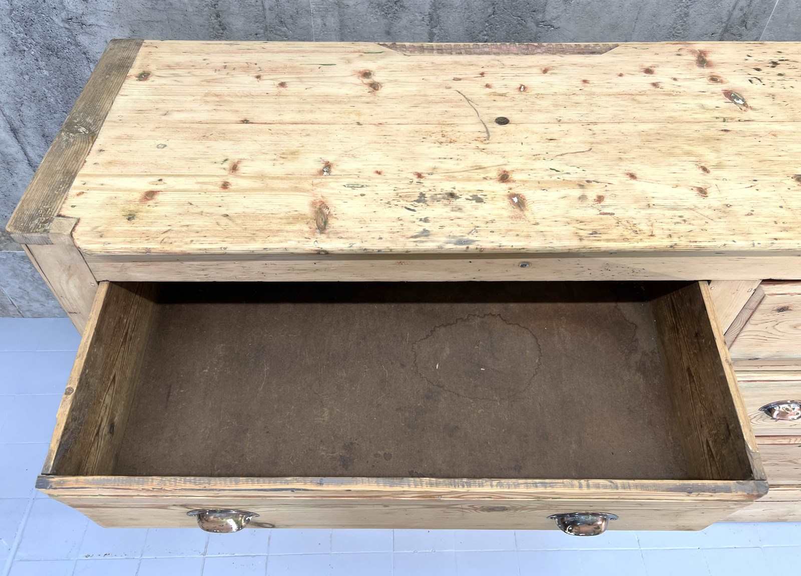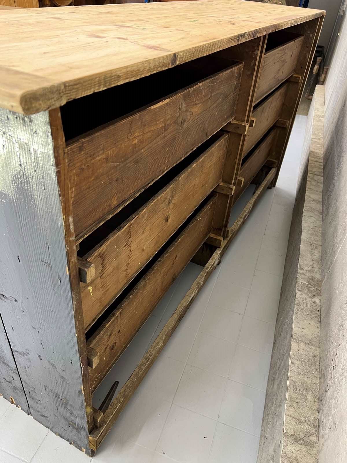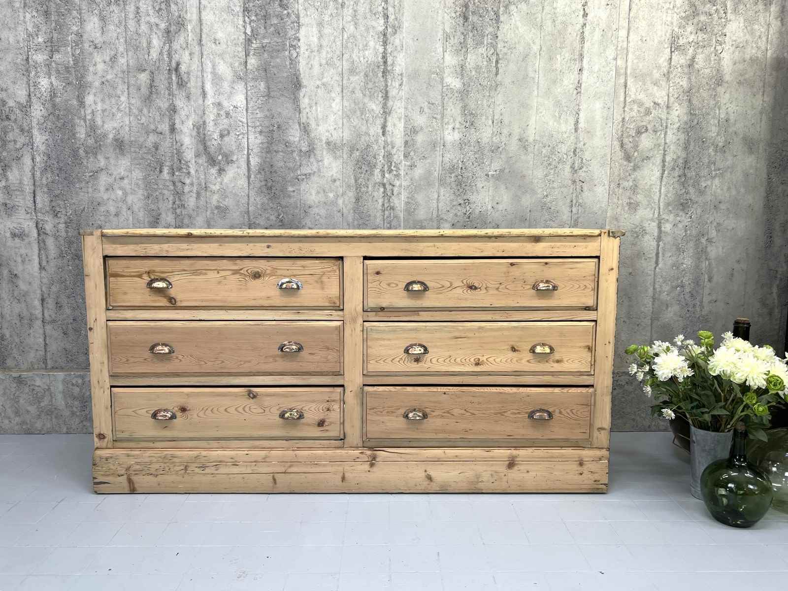 This fabulous looking sideboard with six wide drawers is a show stopper.. but wait.. it is not a high end sideboard, instead it is a rustic, simply constructed counter that was taken from a larger unit and amended to suit its new life. The original storage system was rustic, raw and this has been buffed up on the front and to the face, but you can still see signs of the different coloured paint on each side, you can see that the construction of the drawers are simple, you can see that there is not a back to this unit and you can see where the wood has been damaged on the sides where it has been removed from its original position.. BUT this is a fabulous piece.. the drawers are wide, the frontage of the unit and the top are this beautiful pine with evidence of old paint and beautiful original brass cupped handles. This is a fabulous piece and would be useful in every room in your home.