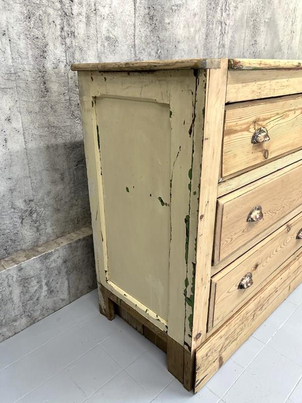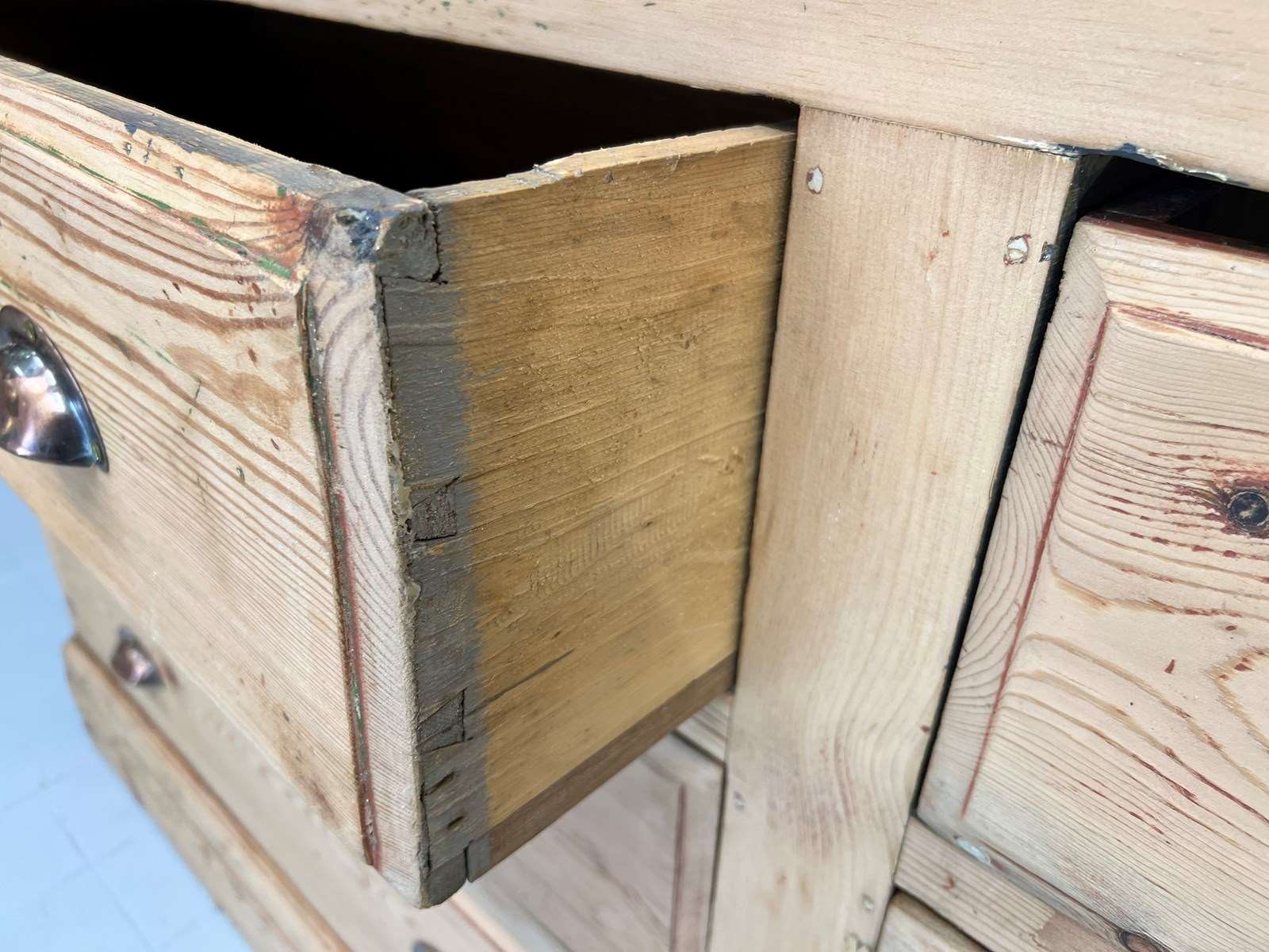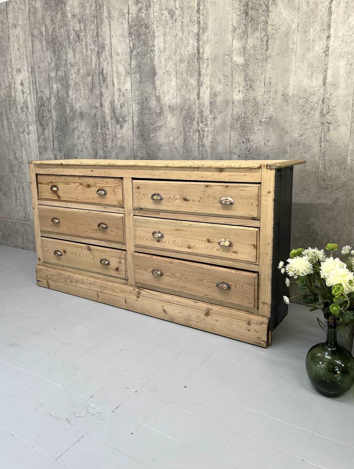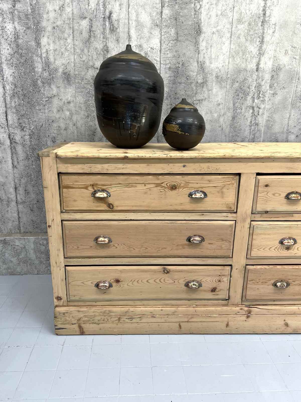 This fabulous looking sideboard with six wide drawers is a show stopper.. but wait.. it is not a high end sideboard, instead it is a rustic, simply constructed counter that was taken from a larger unit and amended to suit its new life. The original storage system was rustic, raw and this has been buffed up on the front and to the face, but you can still see signs of the different coloured paint on each side, you can see that the construction of the drawers are simple, you can see that there is not a back to this unit and you can see where the wood has been damaged on the sides where it has been removed from its original position.. BUT this is a fabulous piece.. the drawers are wide, the frontage of the unit and the top are this beautiful pine with evidence of old paint and beautiful original brass cupped handles. This is a fabulous piece and would be useful in every room in your home.