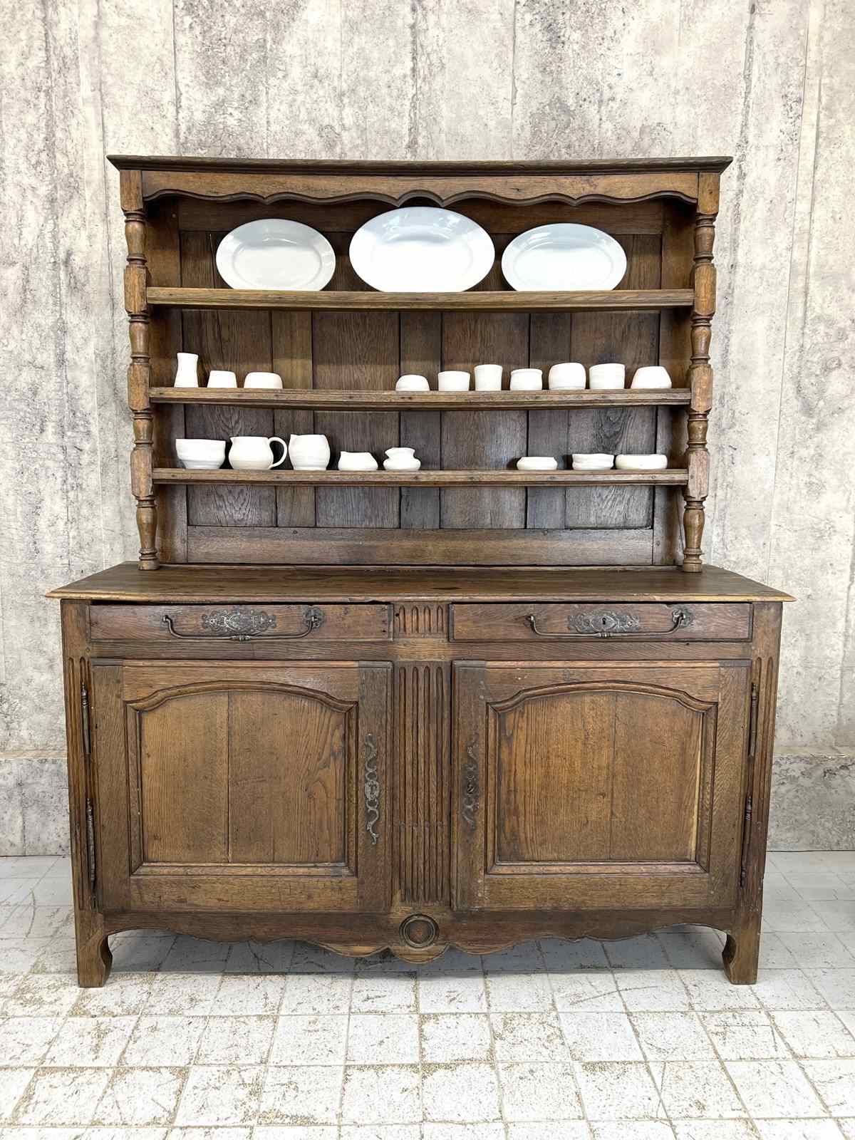 A solid oak dresser from the 20th century the base can be used as a characterful and hugely practical cupboard or sideboard, or as originally intended with the dresser top installed as a dresser to house kitchen crockery etc. Lots of storage in the cupboard section and the drawers, ideal to use in a kitchen as it will store so much. The top section can be used for displaying plates and smaller objects. I have used a base just like this one as a run in a kitchen. It was so much cheaper than installing a fitted kitchen and practically stored so much more. Made from solid oak, you can see the marks and wear from use over time. Solid, original and in really good working order, this is ready to use as it is. We can supply just as a sideboard or with the top section included. There will be no alteration to the list price however.