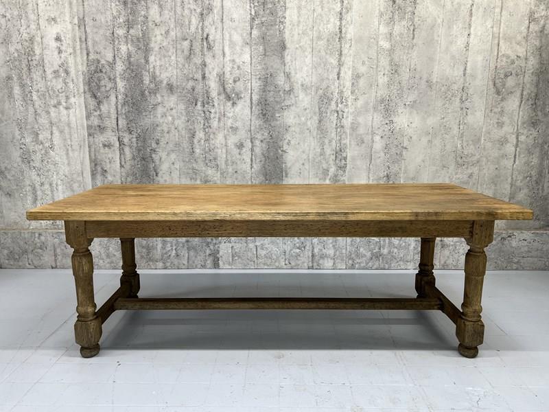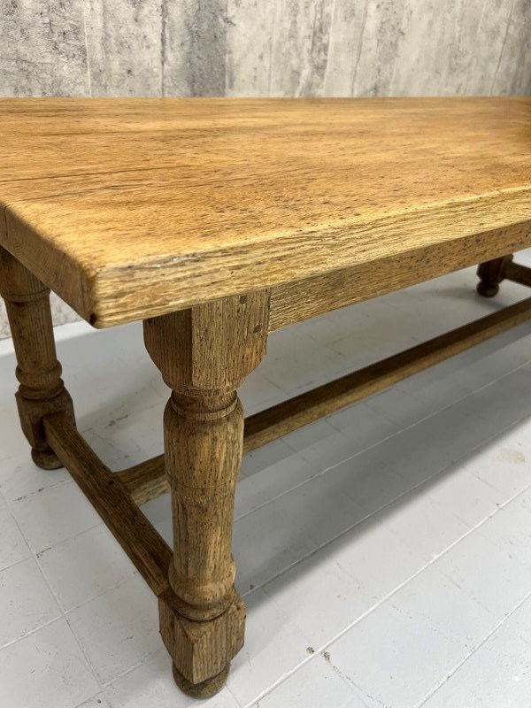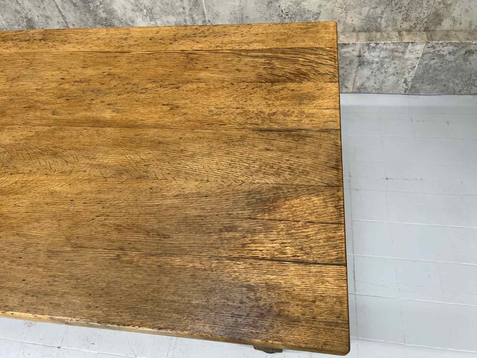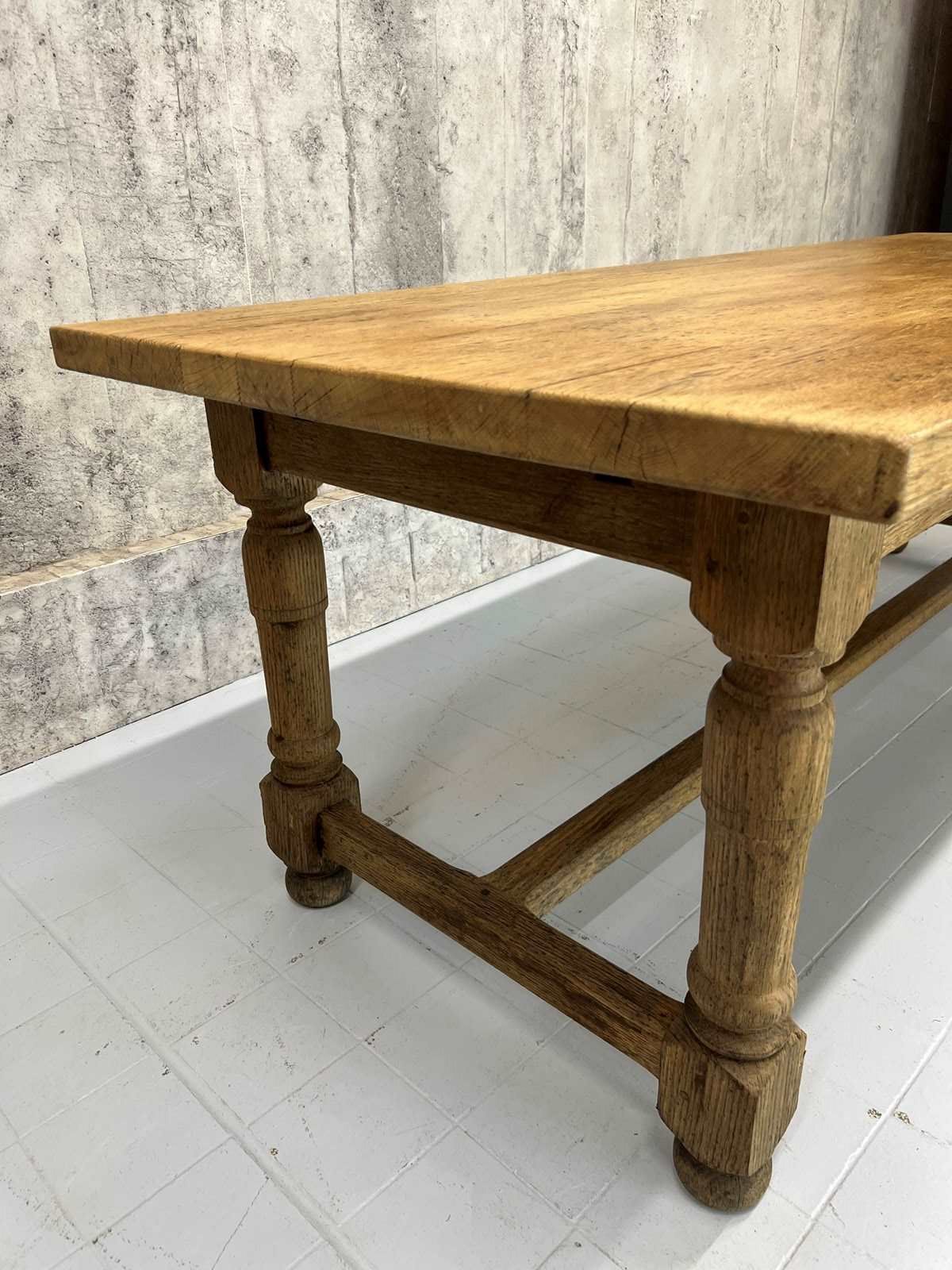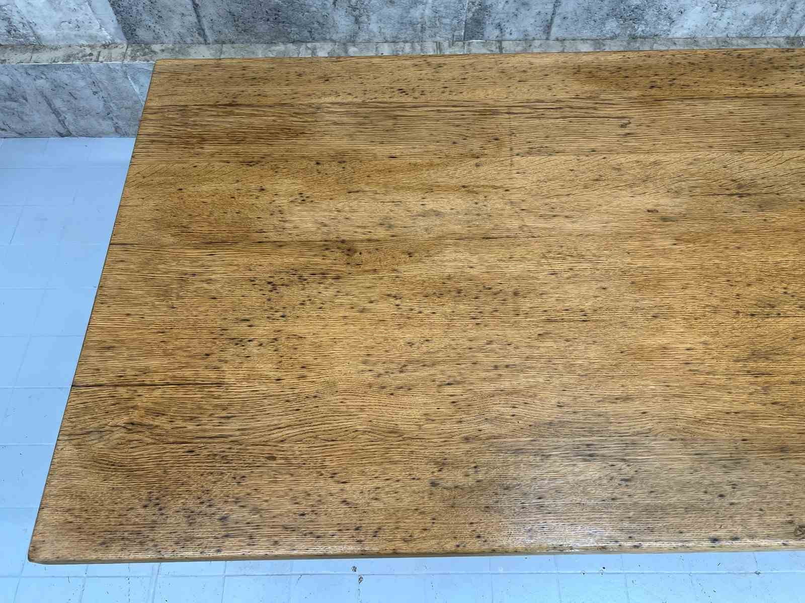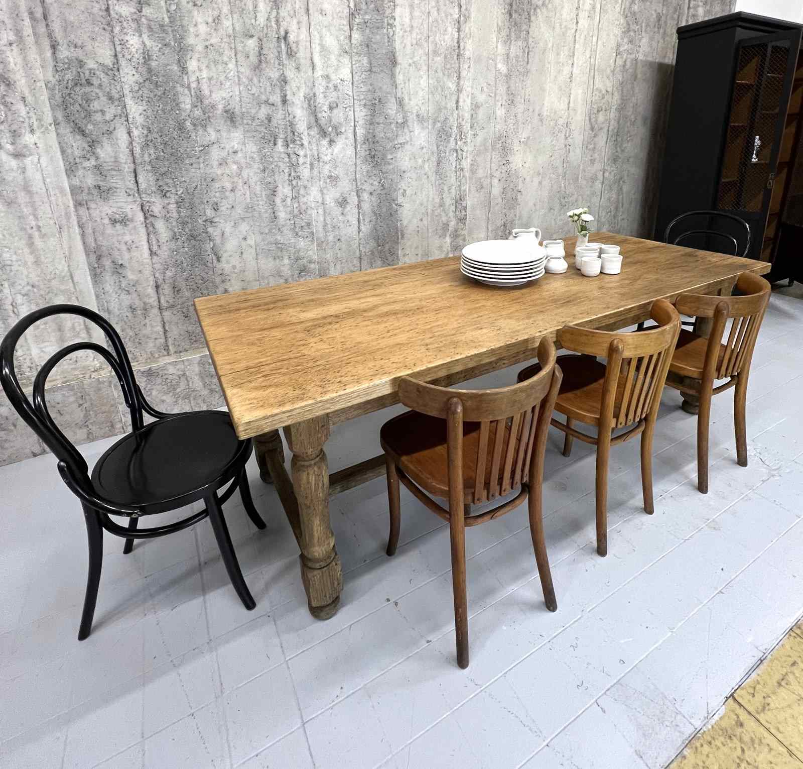 A classic French table design. A heavy and fabulous table that can seat 10 easily, maybe more if you use benches. Made from solid French oak, turned legs, ideal in a kitchen, formal dining space or outside covered eating area. Marry with benches, modern chairs or vintage chairs. Versatile and ready to use as it is. This table has many generations of good use in it still. The wood is in excellent condition throughout. Marks and bashes as you would expect commensurate with age and use.