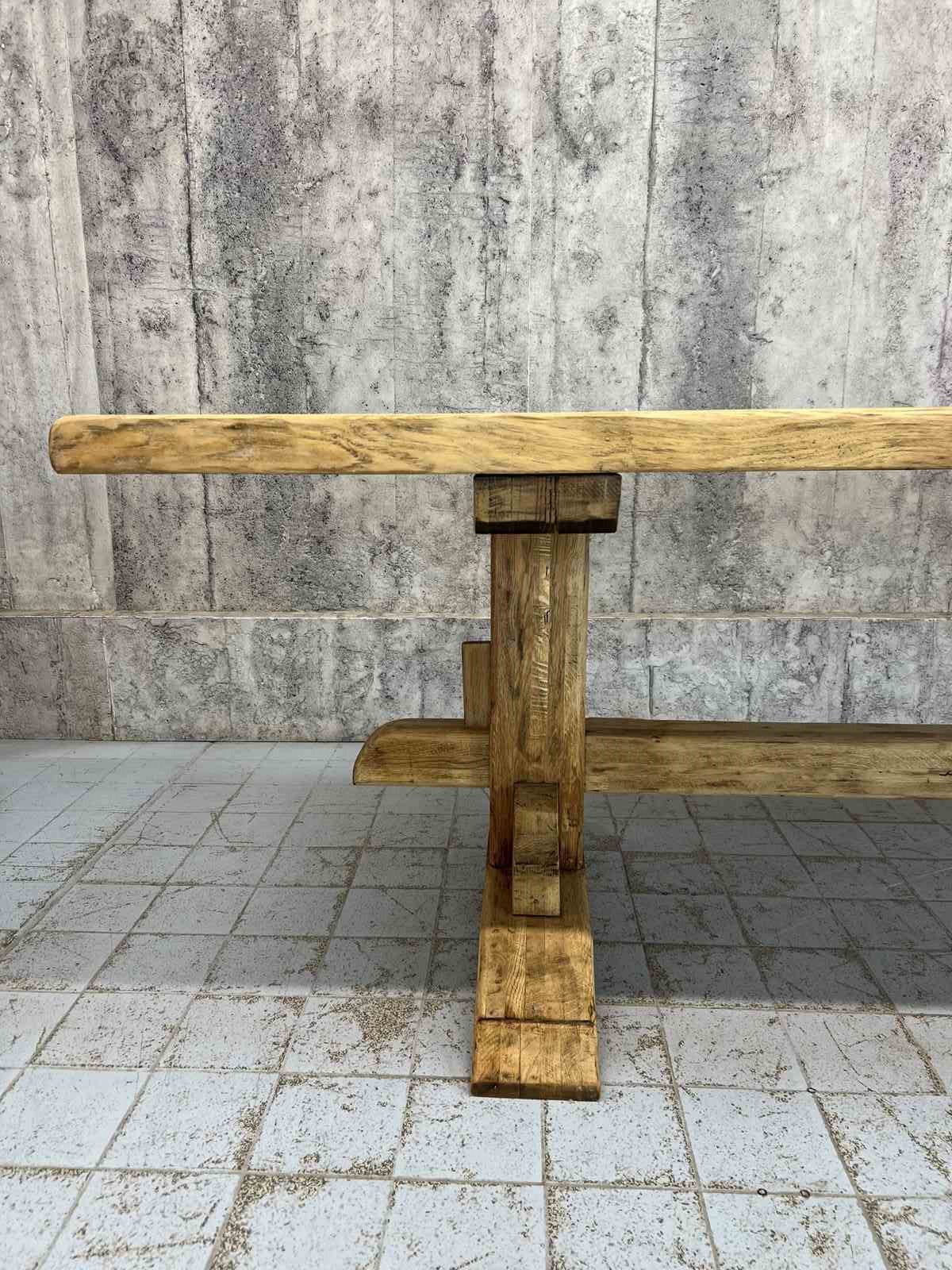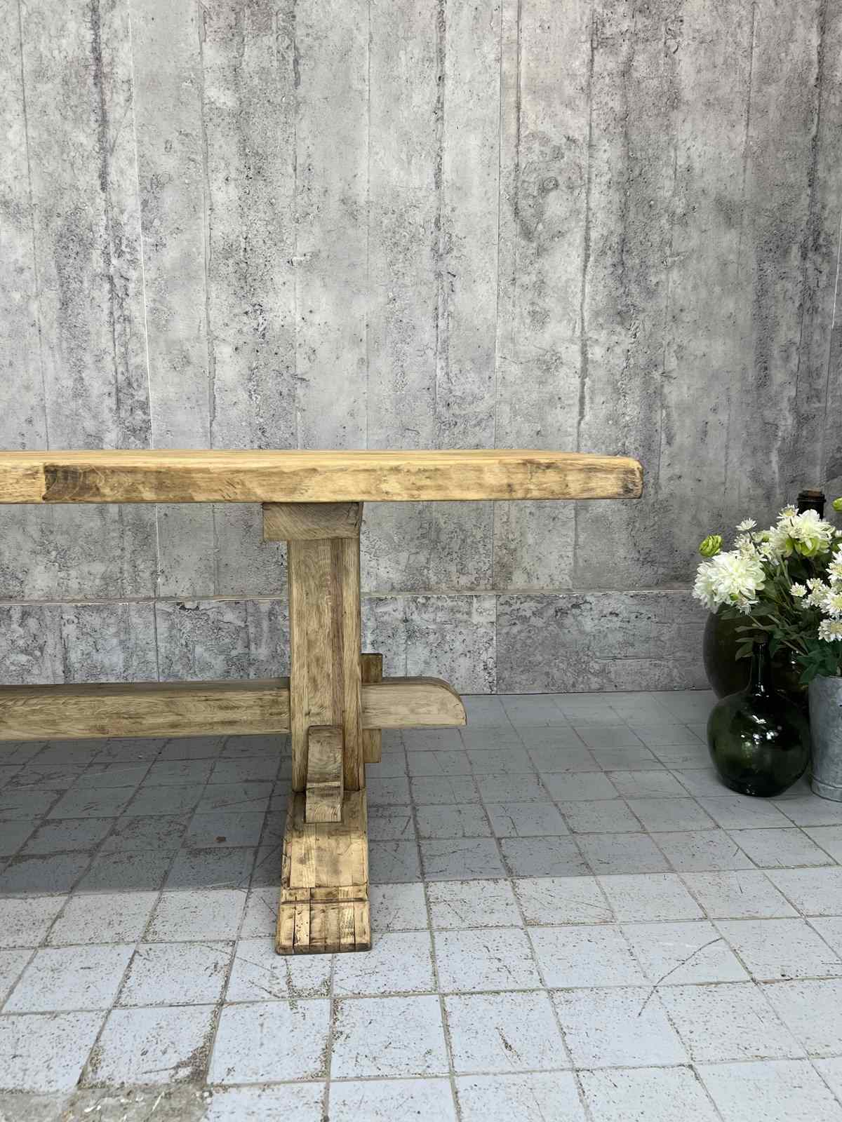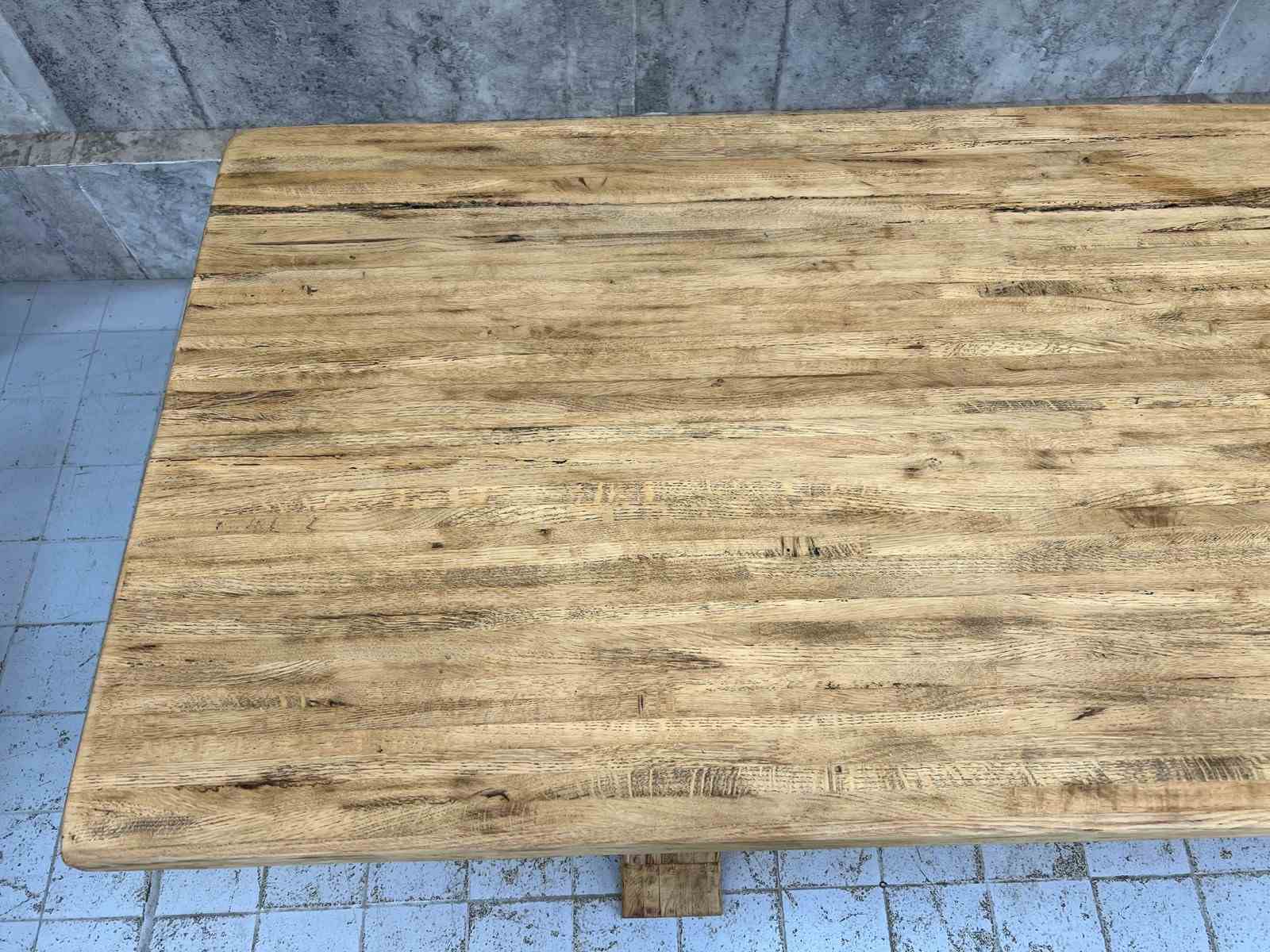 The oak has been stripped revealing the beautiful bleached tones of the woods natural patina. The table top has interesting details.. please see the photographs for more information. All part of the original construction of the table. We can fit three bistro chairs down each side so in total, depending on chair size, this can seat up to 8.