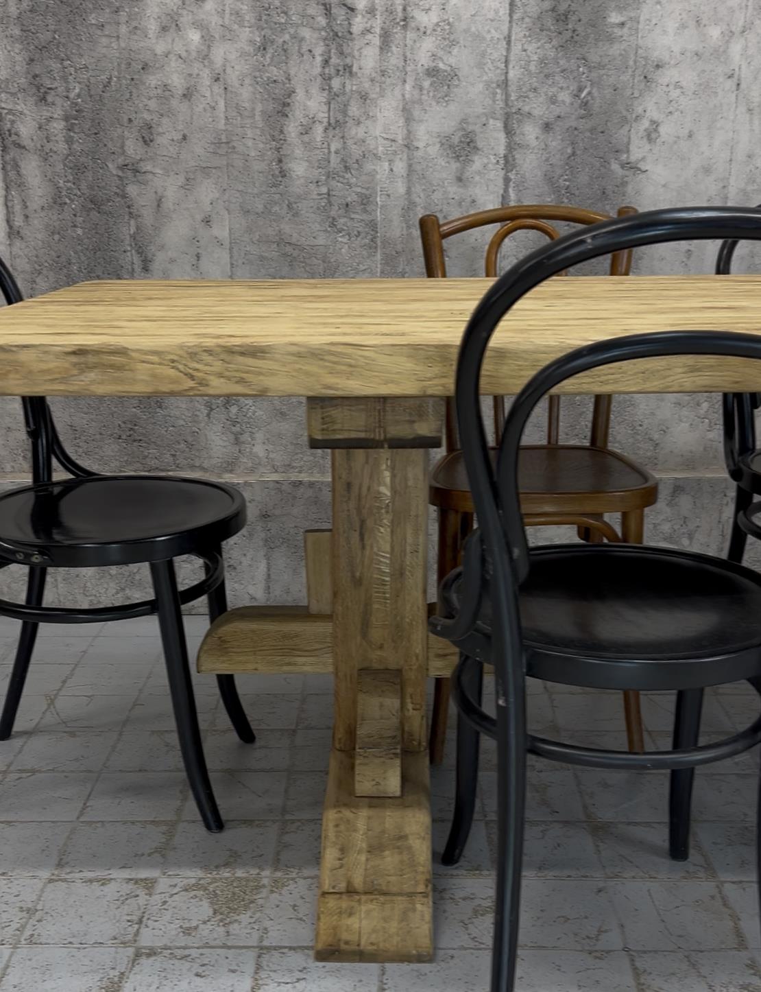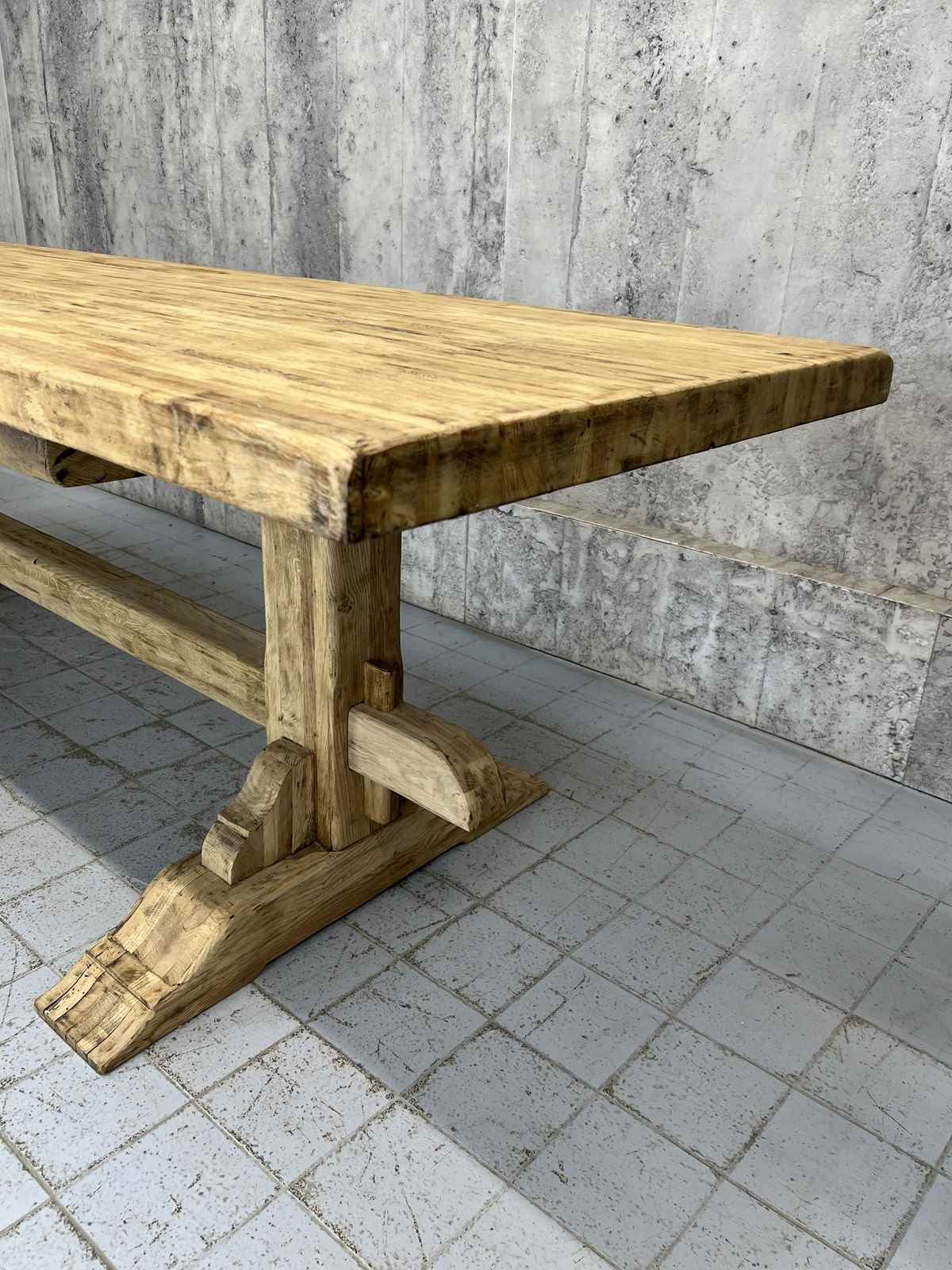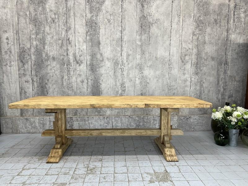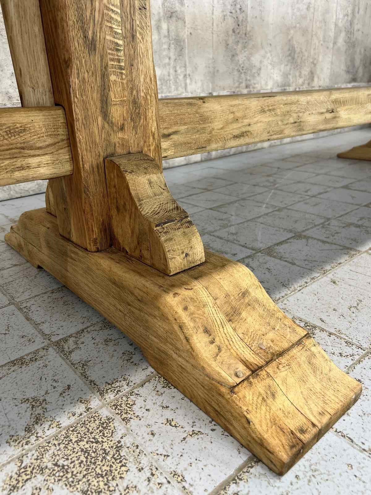 The oak has been stripped revealing the beautiful bleached tones of the woods natural patina. The table top has interesting details.. please see the photographs for more information. All part of the original construction of the table. We can fit three bistro chairs down each side so in total, depending on chair size, this can seat up to 8.