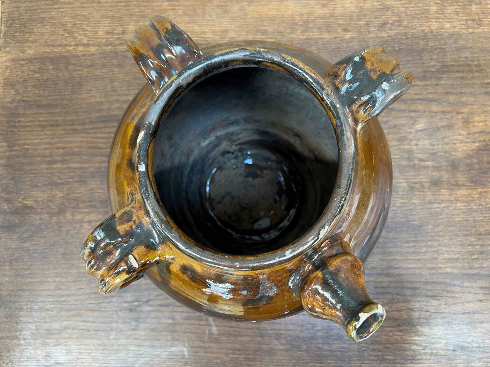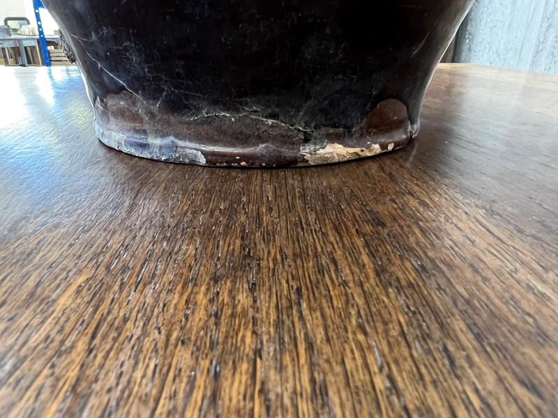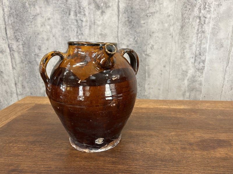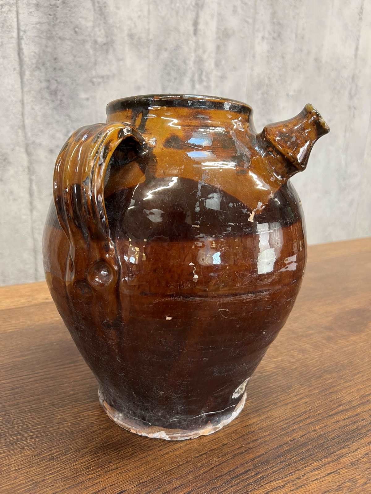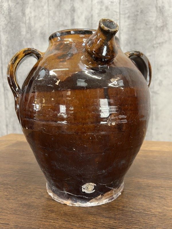 A Stunning Walnut Oil Jug that has the most beautiful gloss glaze to the exterior. In the traditional shape of 2 small handles either side of the spout. The glaze has cracked in places, please do the photographs for more details. but regardless, this is a really beautiful decorative jug that would be ideal for sue in a home or in a commercial property.