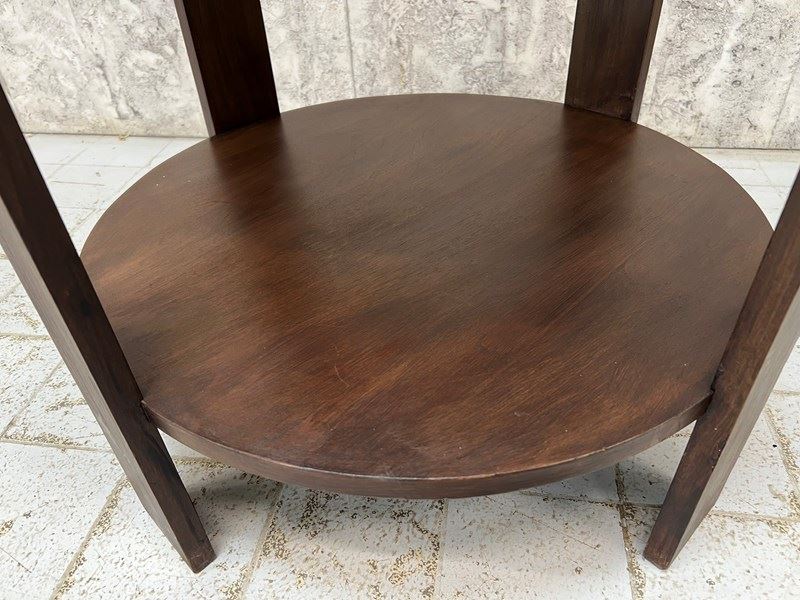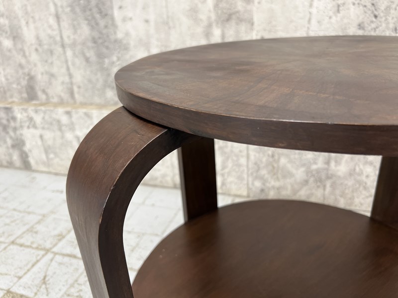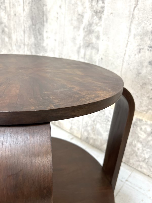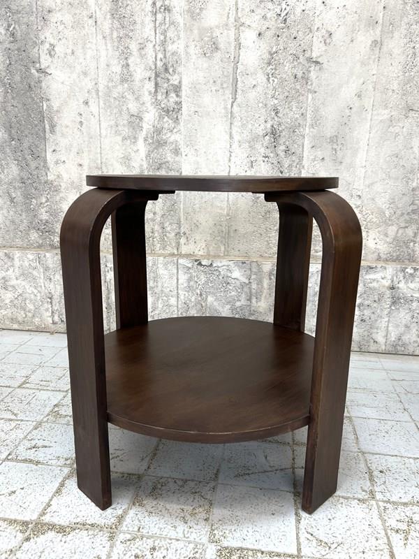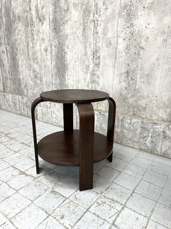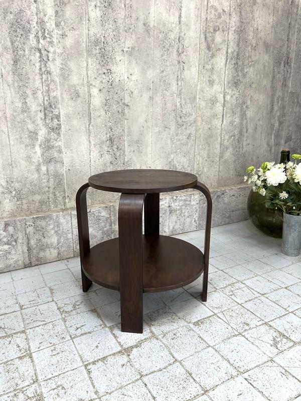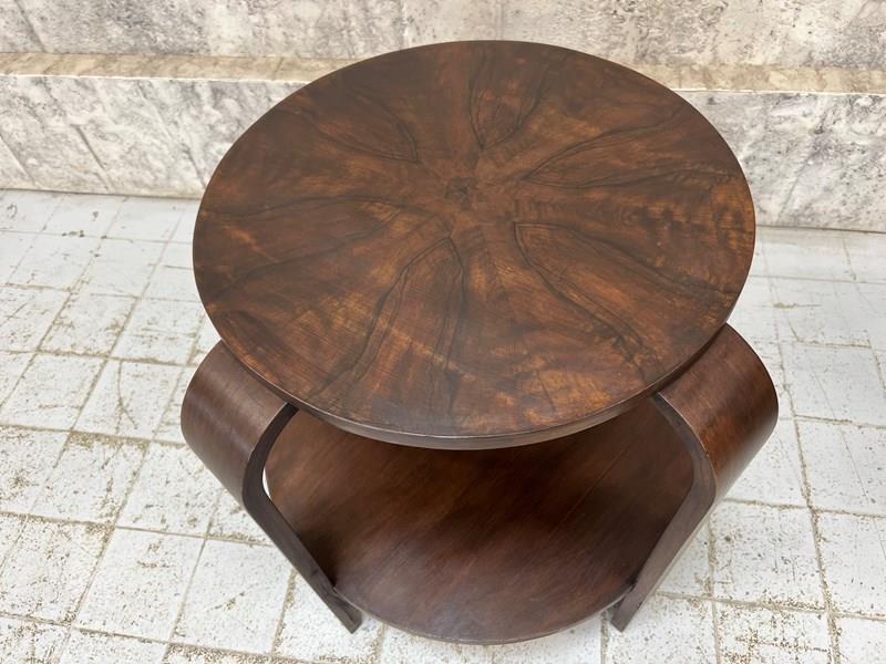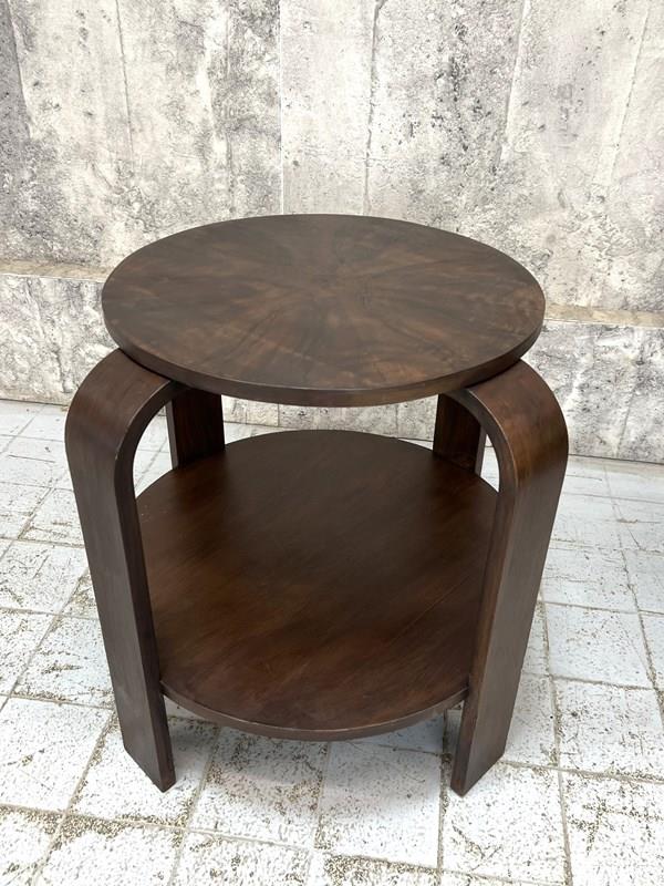 An extraordinarily beautiful art deco style side table. The simple styling of the 1930's is as relevant today in a modern home as when this piece was conceived. A dark wooden veneer with the most stunning detailed top. In good condition with bumps and scratches as you would expect w ith use and age. Marry with a setting of rich colours and a dark theme or with a fresh crisp neutral scheme. A versatile piece.