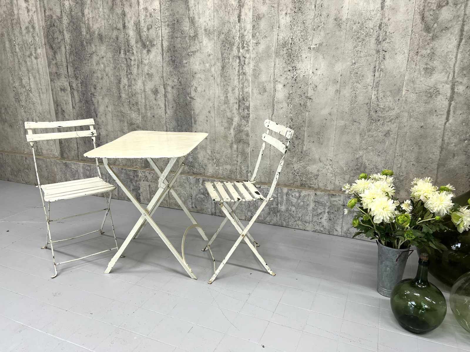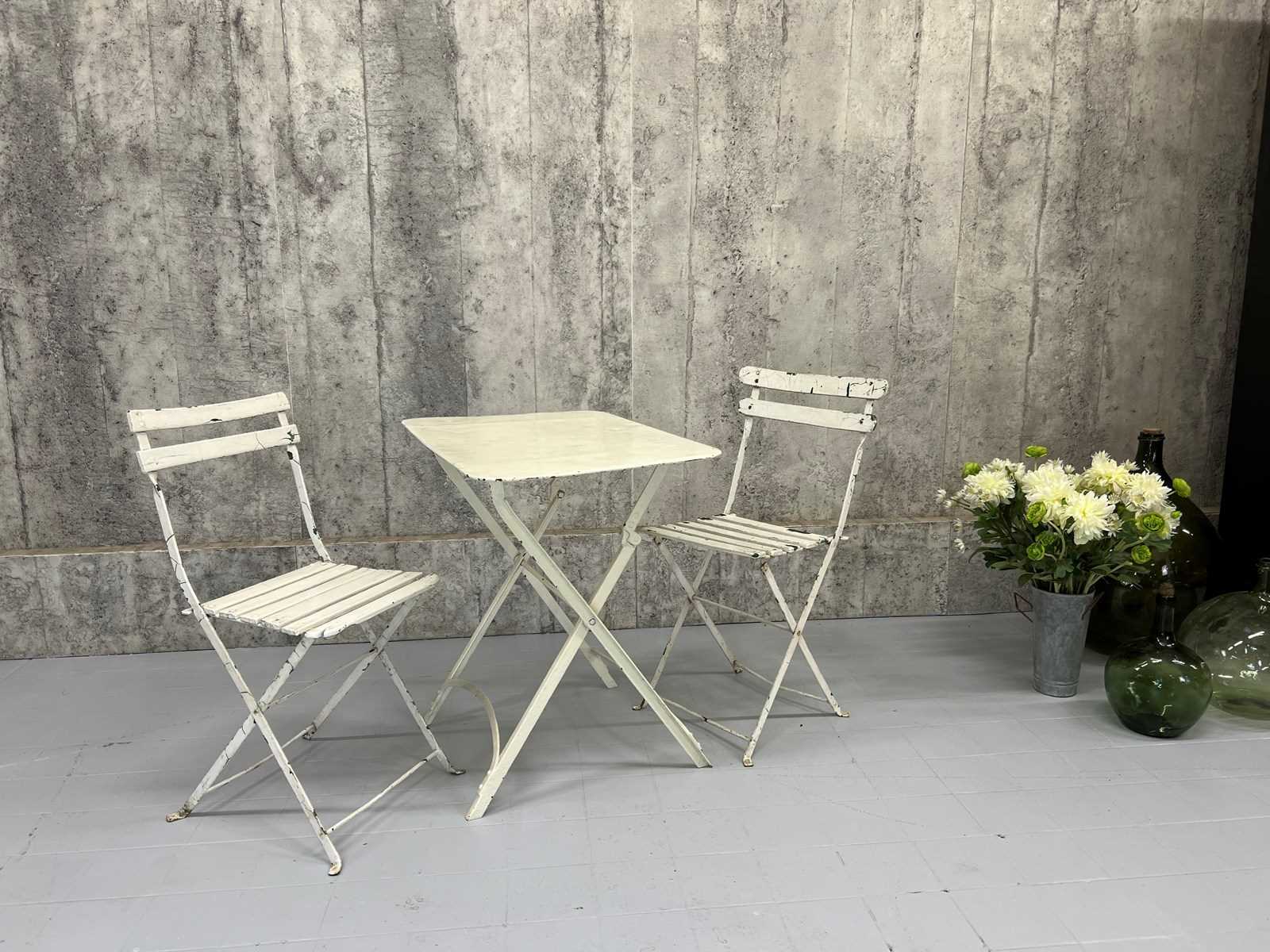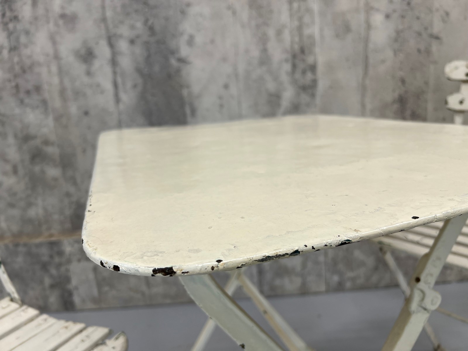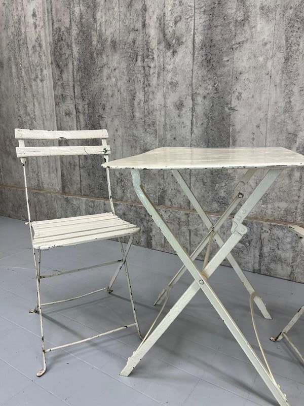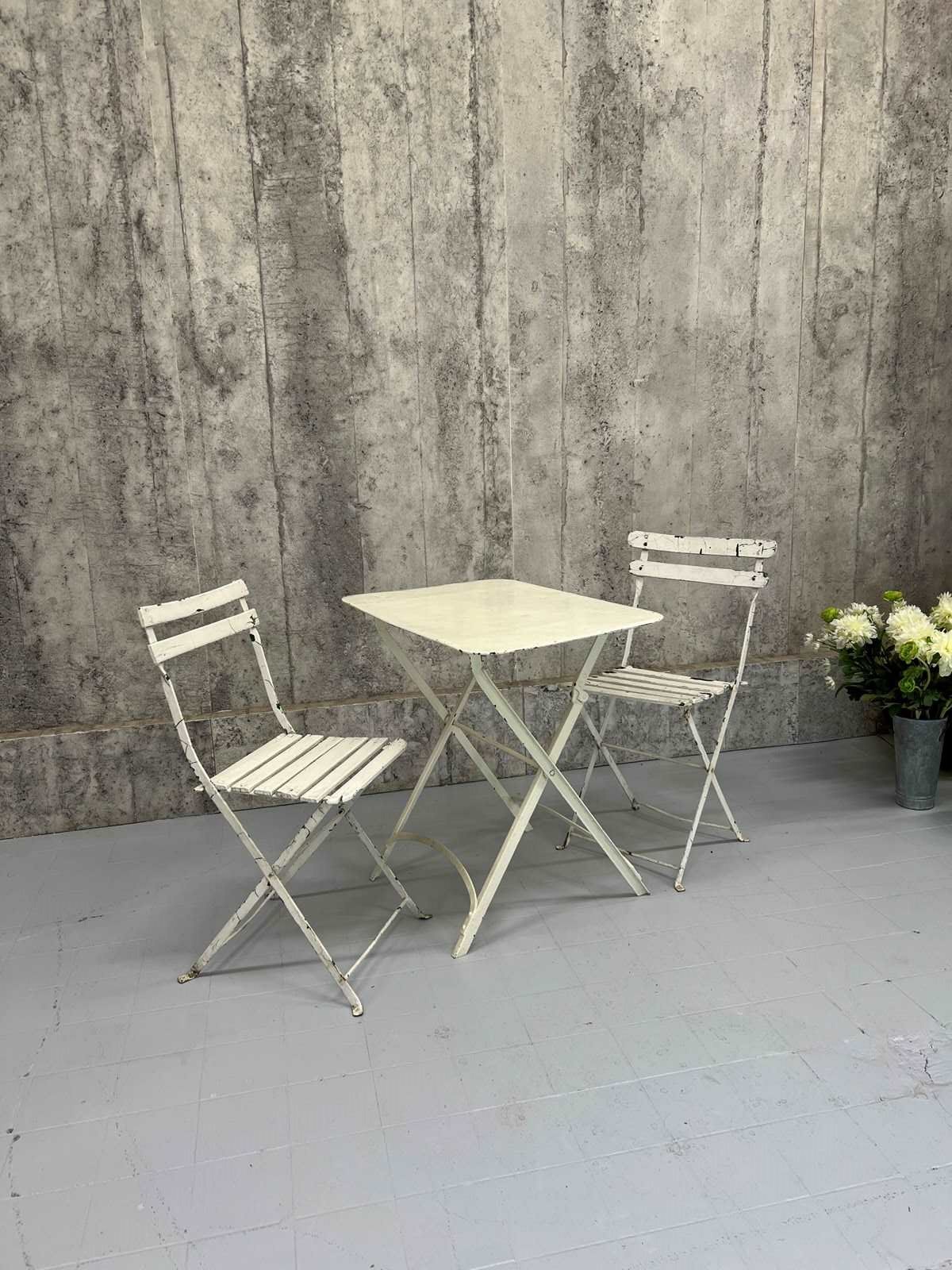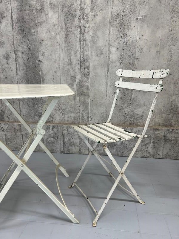 A white metal folding table and a traditional folding wood and two metal and wooden bistro chair painted over time in layers, currently in this white finish. Not a matching set, but complimentary and unique set that folds to store. In good condition and ready to use. Not perfect, but beautifully characterful. Ready to use as they are. Perfect for use on a terrace, balcony or in a garden.