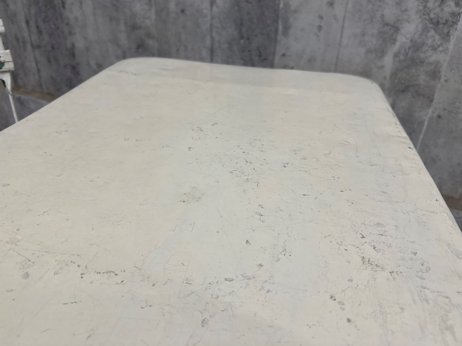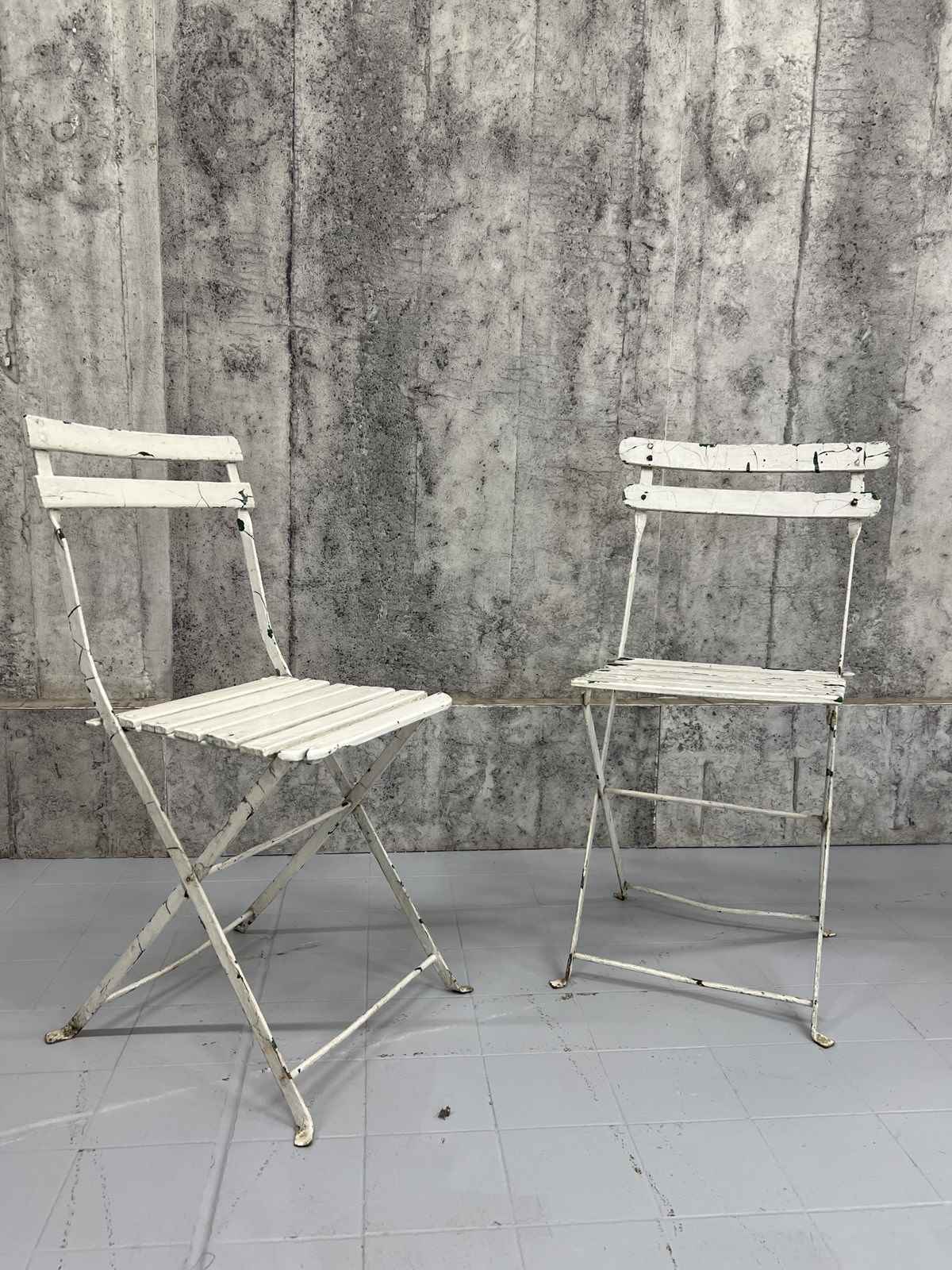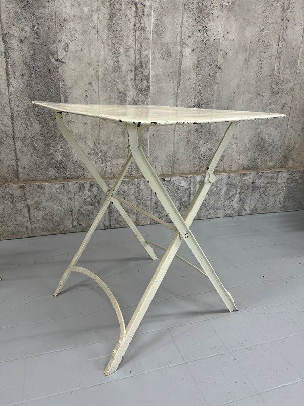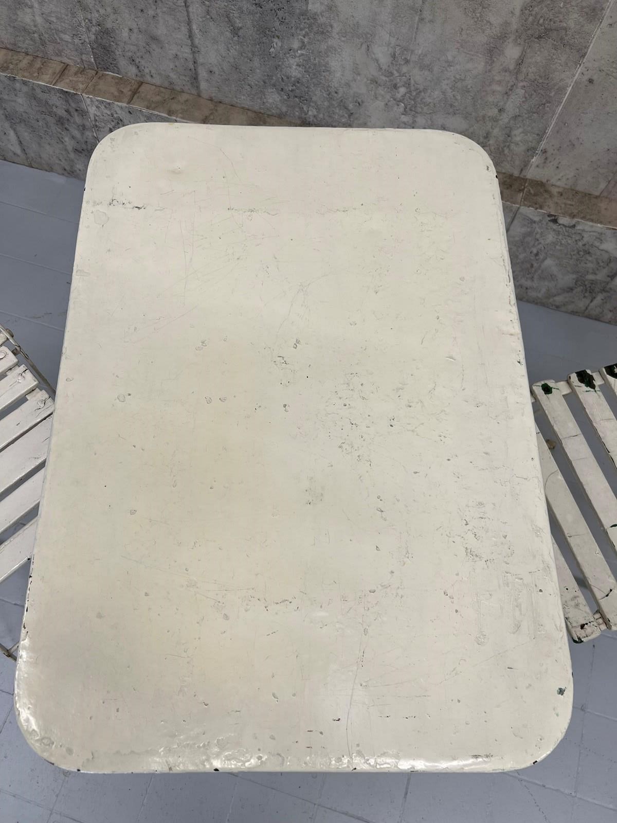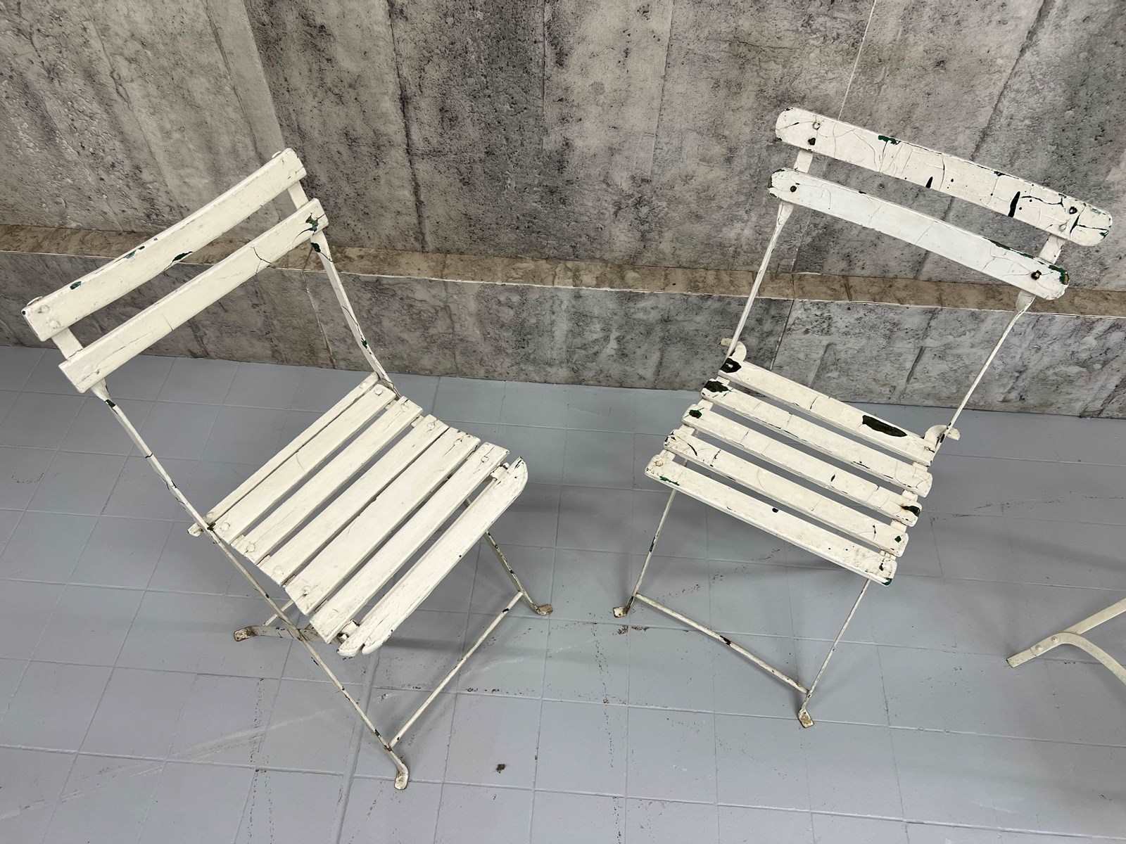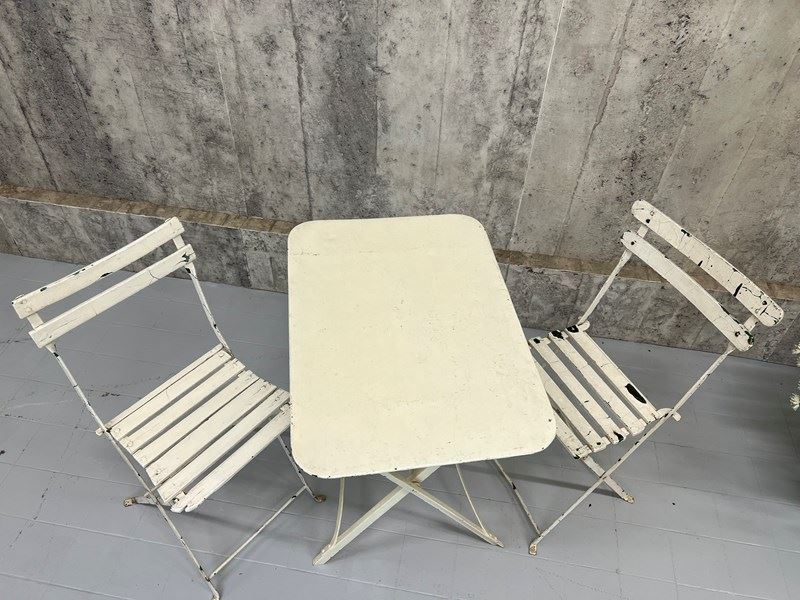 A white metal folding table and a traditional folding wood and two metal and wooden bistro chair painted over time in layers, currently in this white finish. Not a matching set, but complimentary and unique set that folds to store. In good condition and ready to use. Not perfect, but beautifully characterful. Ready to use as they are. Perfect for use on a terrace, balcony or in a garden.