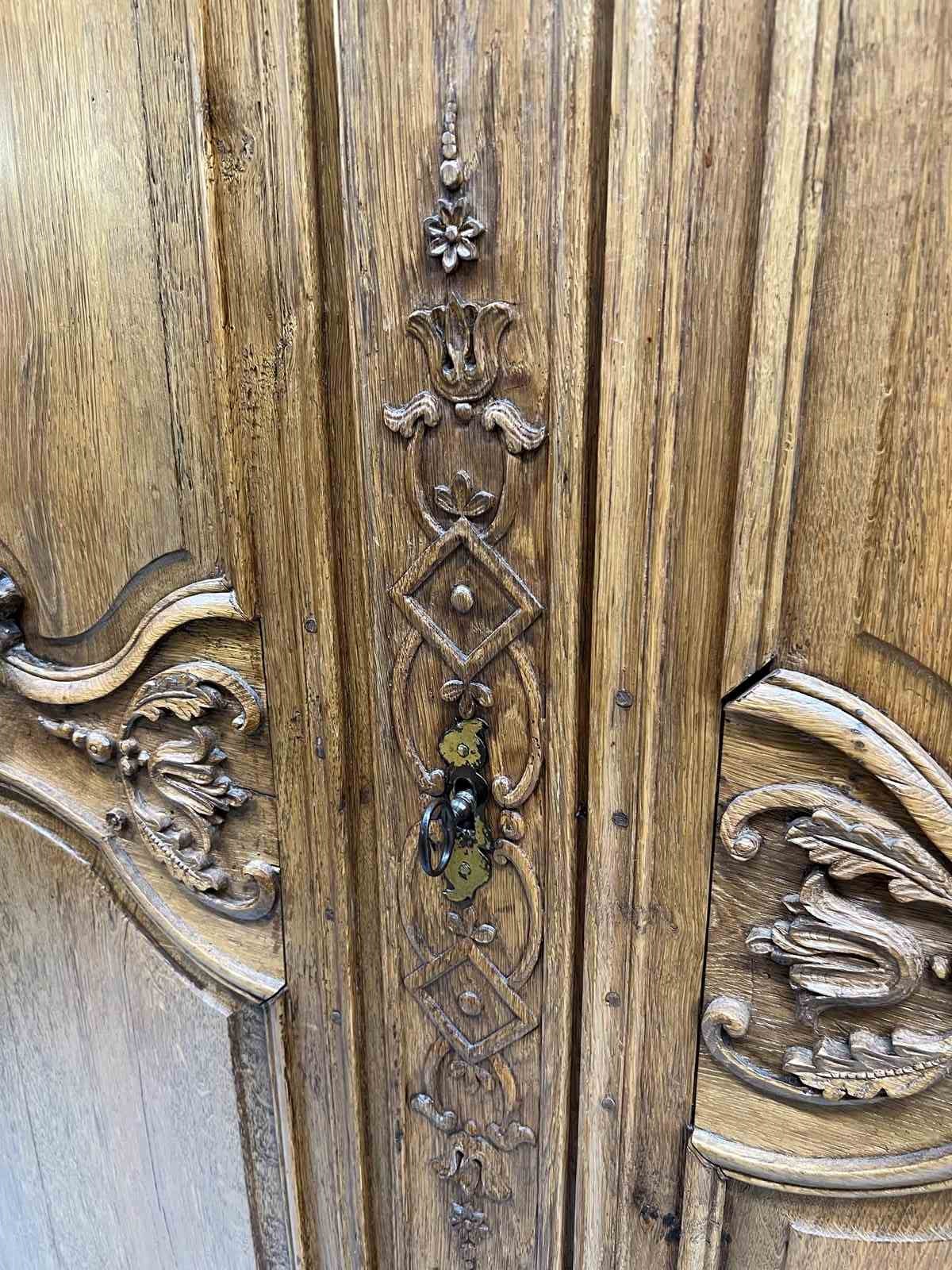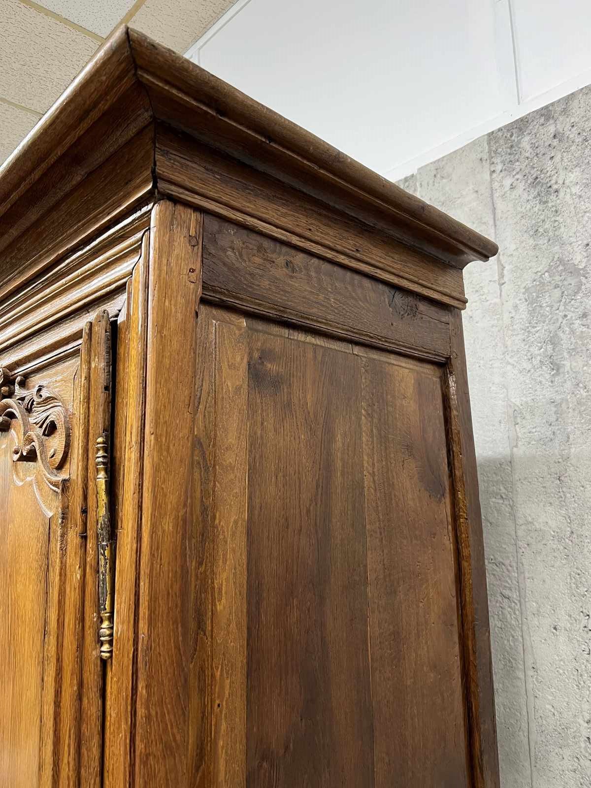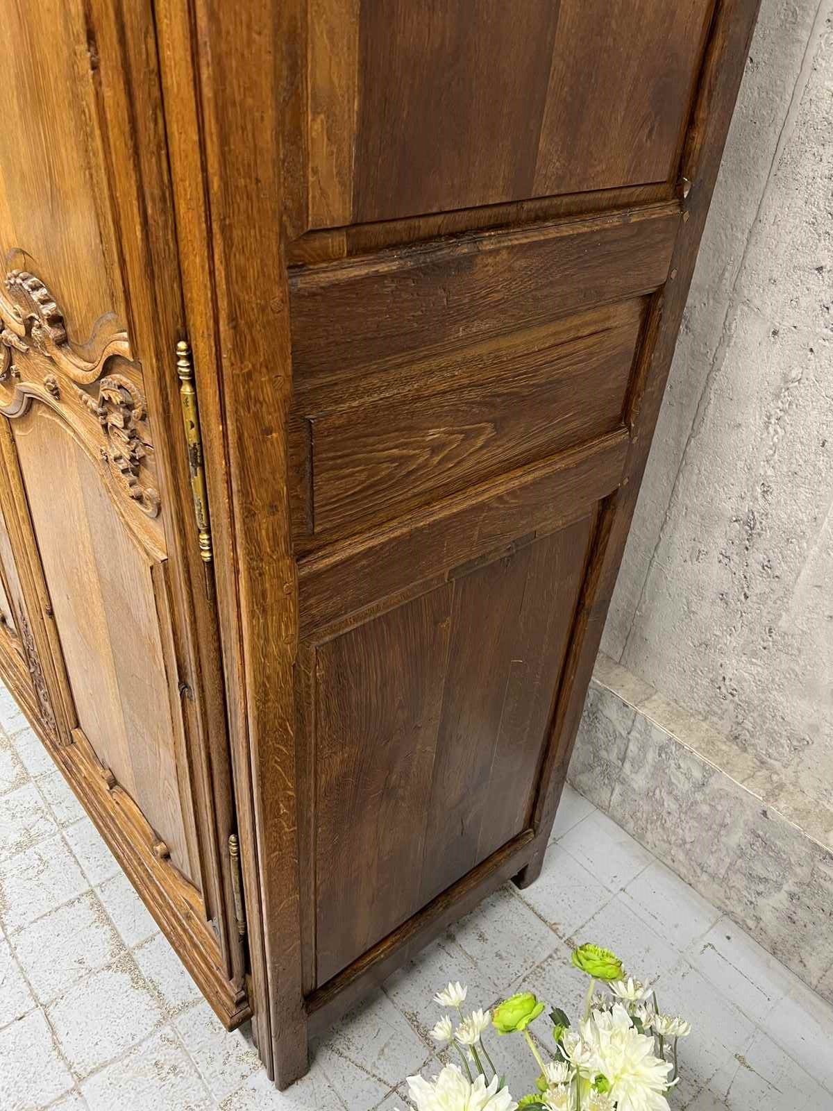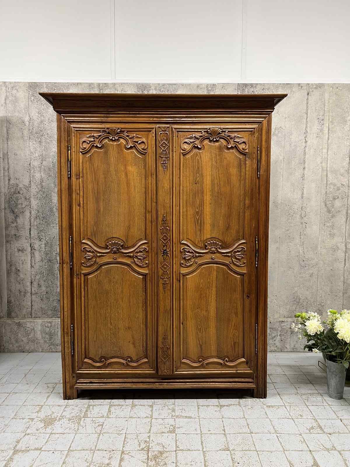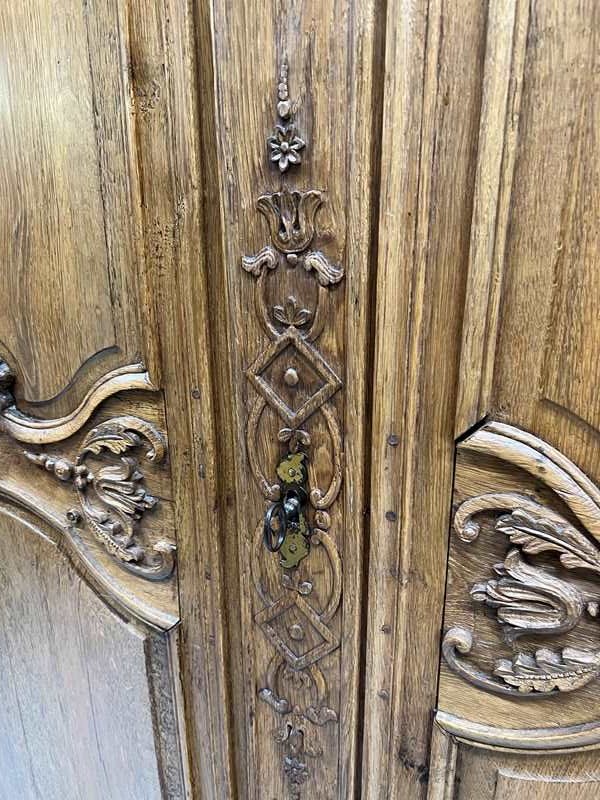 A solid and heavy French cupboard in the most beautifully mellow solid oak wood with stunning hand carved decoration in relief. All hand made and you can see the saw marks on the inside of the door. The doors open to three really usefully sized shelves. All with the original drawer furniture and keys. Ancient wood worm, bashes and bruises as you would expect but in good working order. Ready to use as it is for a larder cupboard, hallway storage, bedroom storage or anything you like.... a really fabulous piece.