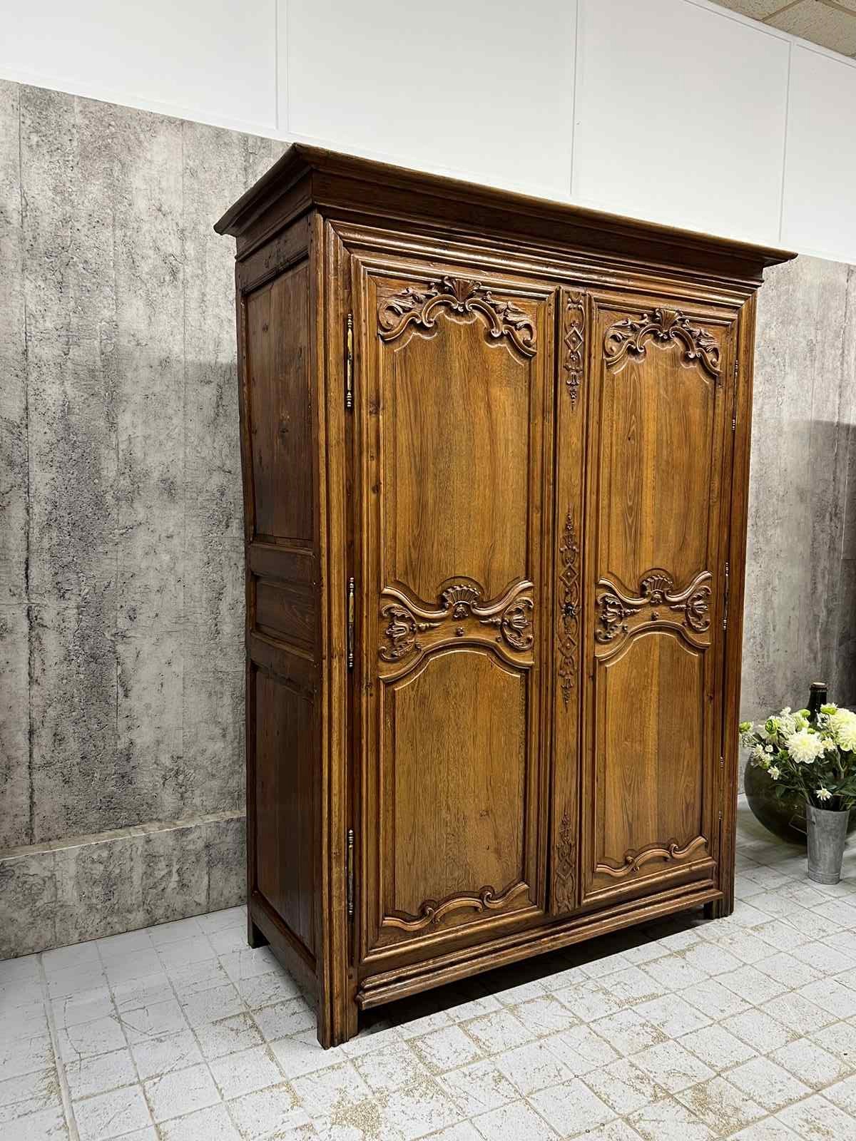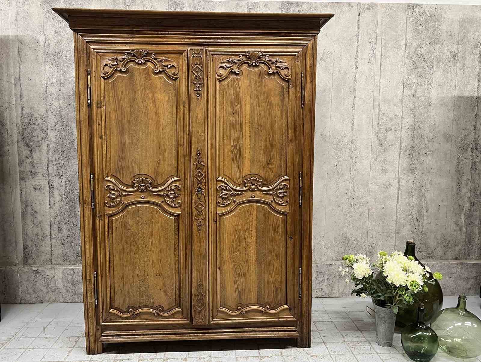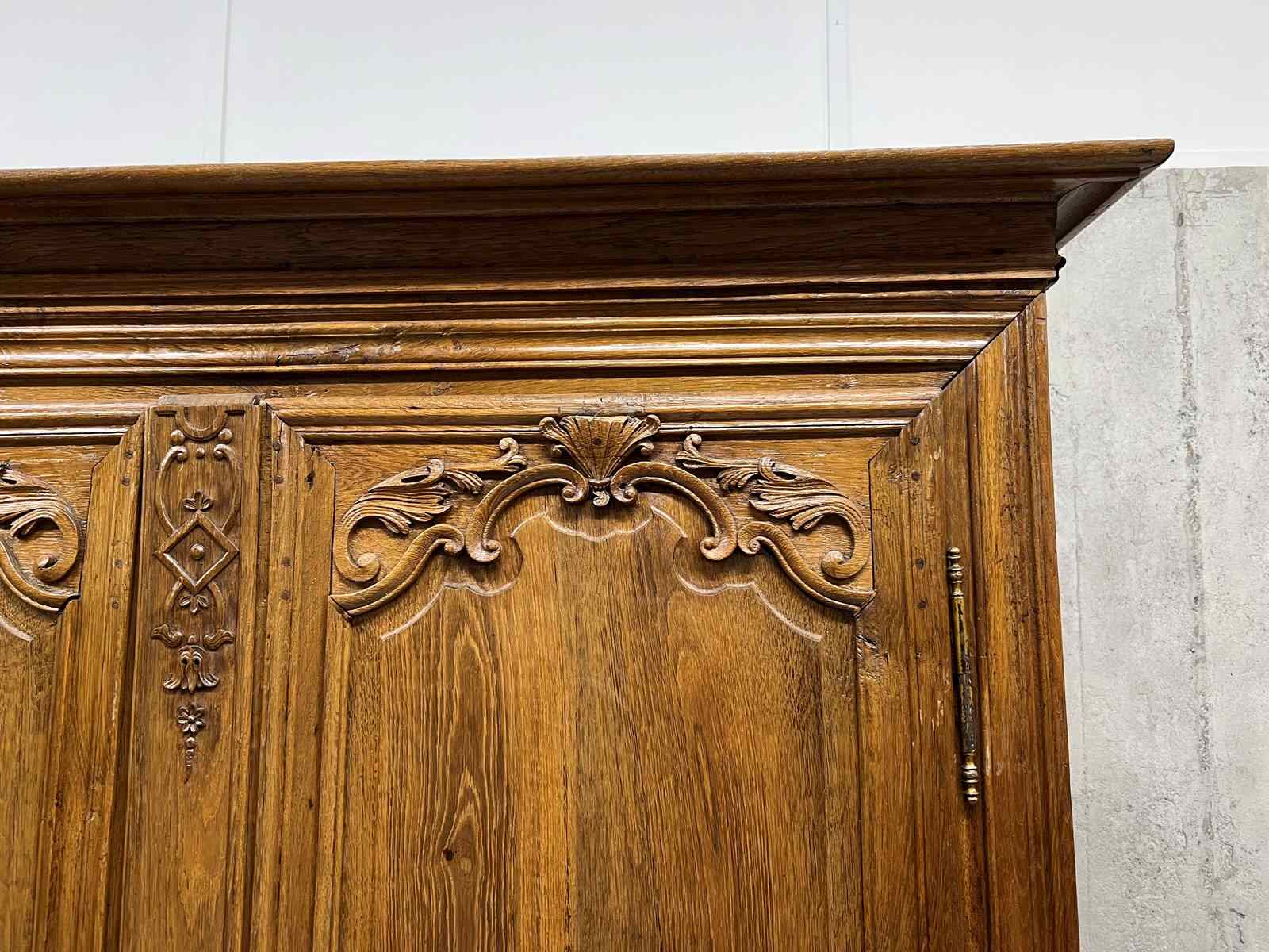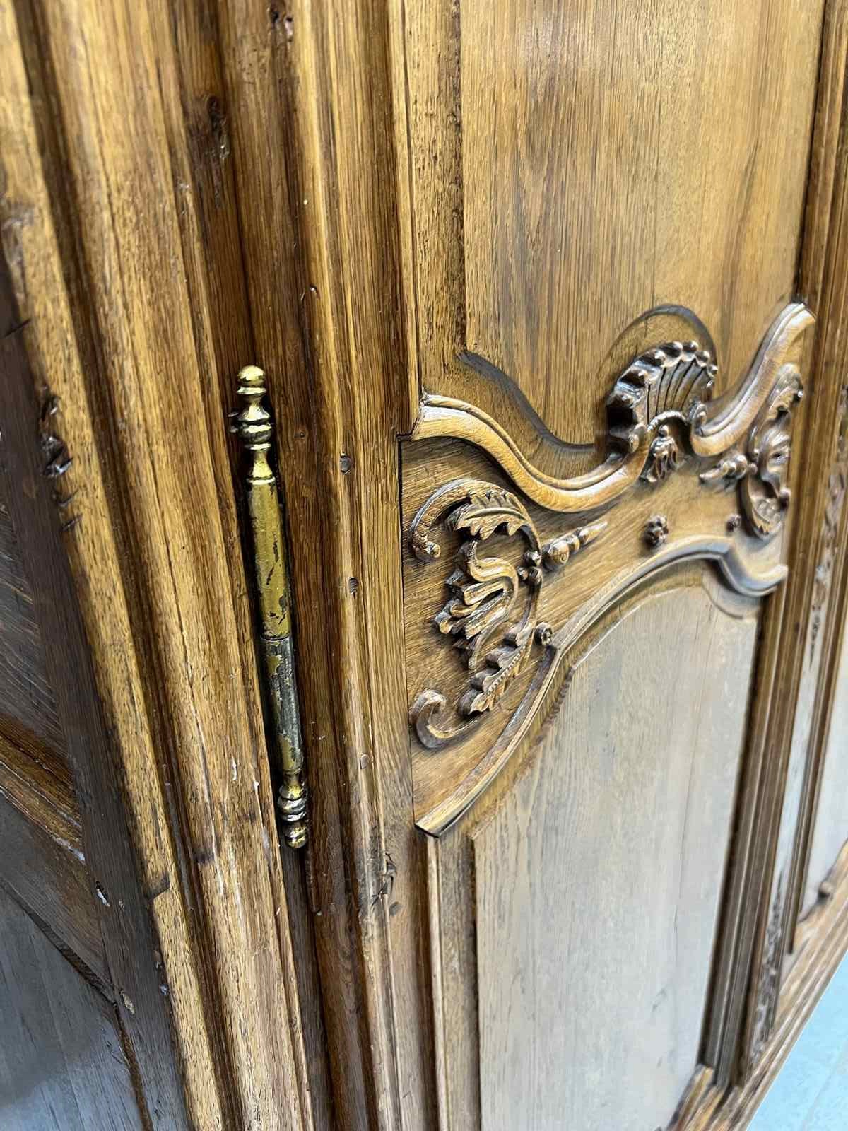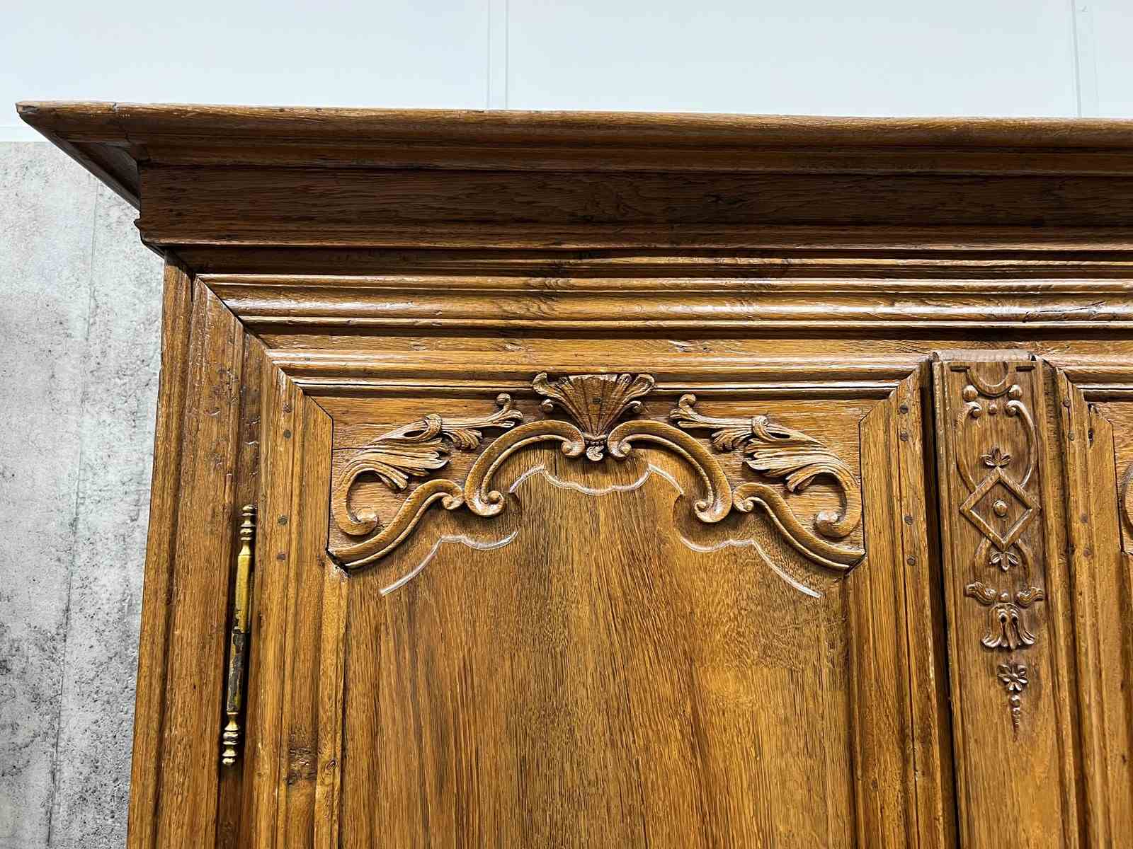 A solid and heavy French cupboard in the most beautifully mellow solid oak wood with stunning hand carved decoration in relief. All hand made and you can see the saw marks on the inside of the door. The doors open to three really usefully sized shelves. All with the original drawer furniture and keys. Ancient wood worm, bashes and bruises as you would expect but in good working order. Ready to use as it is for a larder cupboard, hallway storage, bedroom storage or anything you like.... a really fabulous piece.