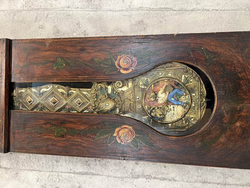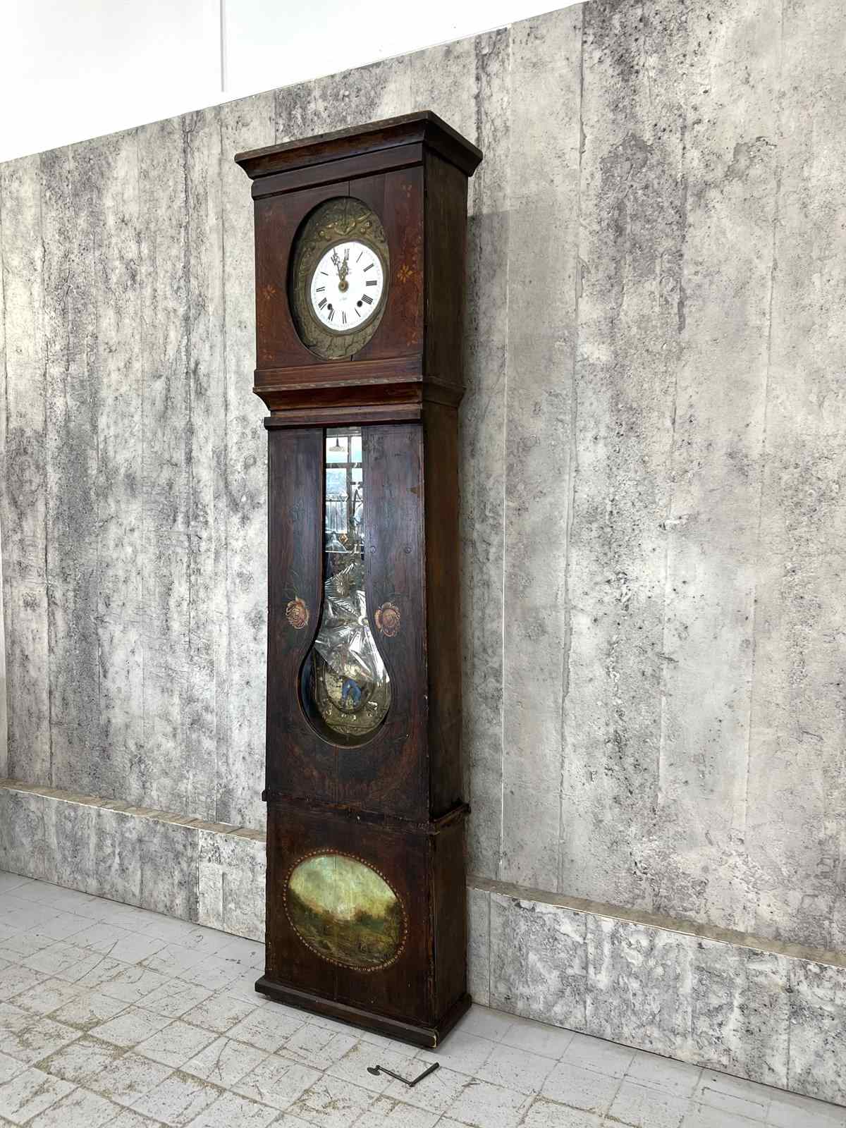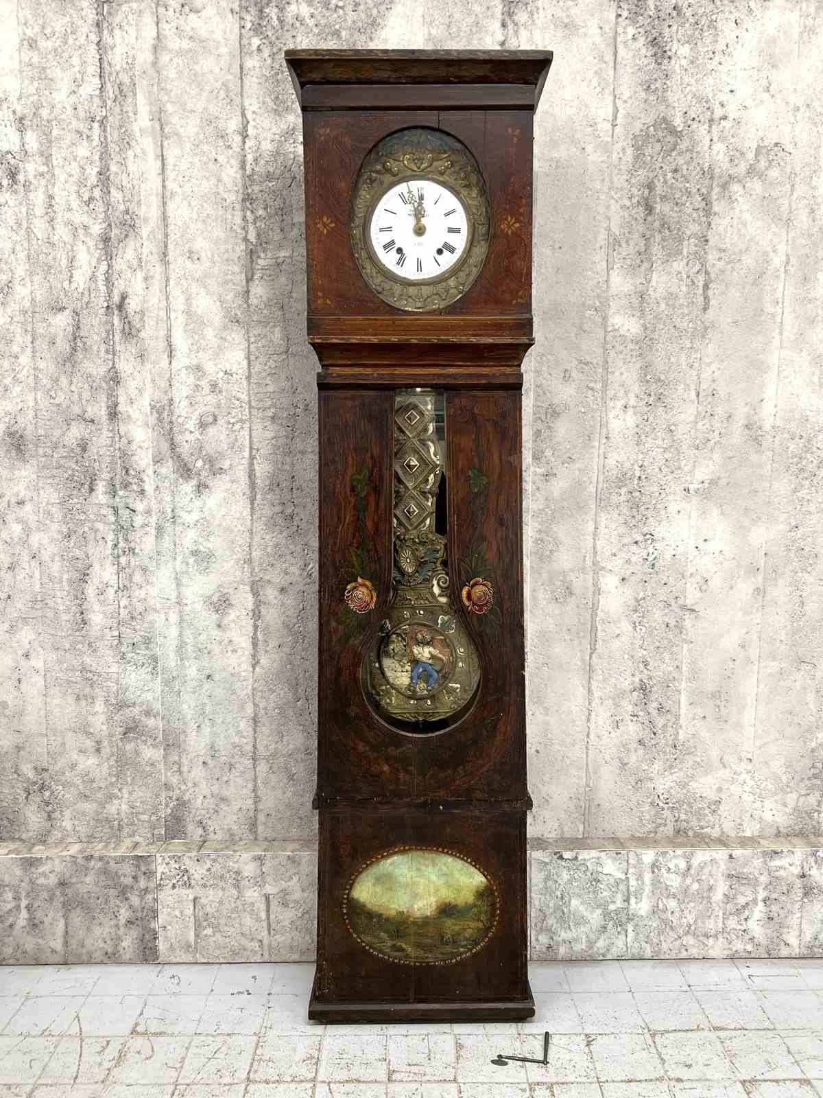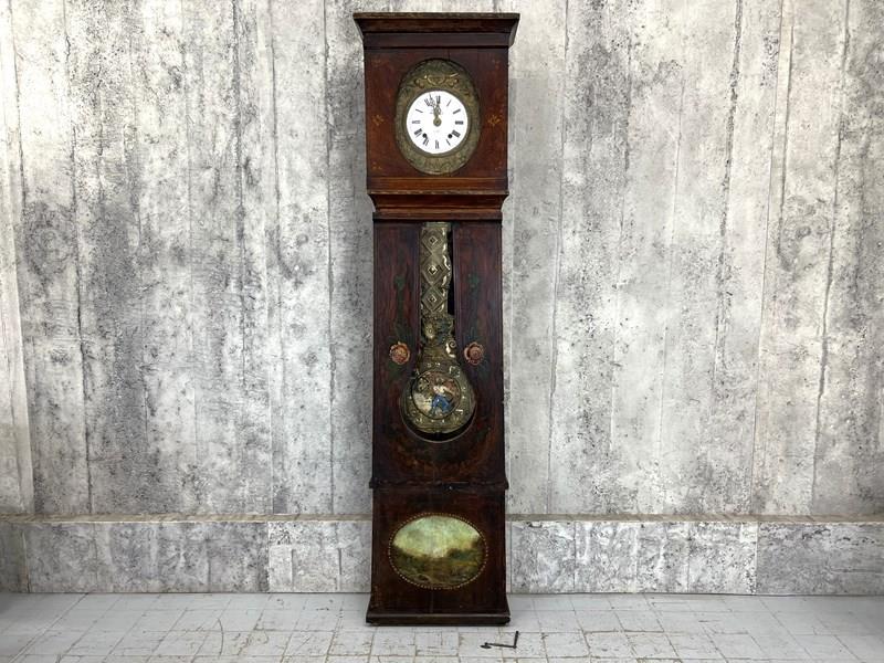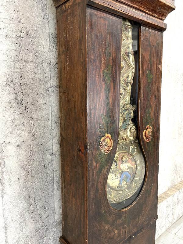An incredible clock. From the Haute Savoie region of France. Hand made, hand painted. In rustic and very well used condition, the case has signs of wood worm and wood rot, all of which has been treated over the years. The metal work of the mechanisms are in lovely condition.. all very well used and with the usual bashes as you would expect. The clock did work when in the home of the last family who owned the clock for the last 20 years, but it has been in storage for some years now, so we are selling as a decorative piece and if you want the clock to work and chime we would recommend that you have the piece renovated by a specialist.