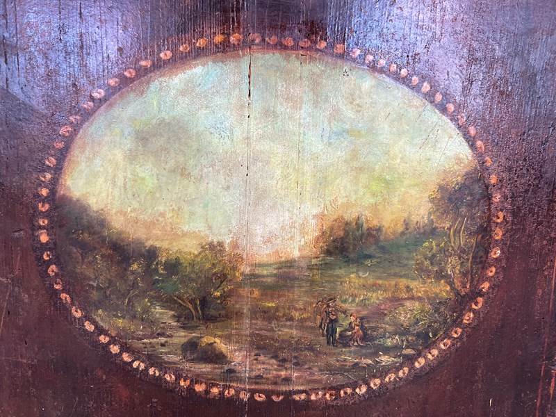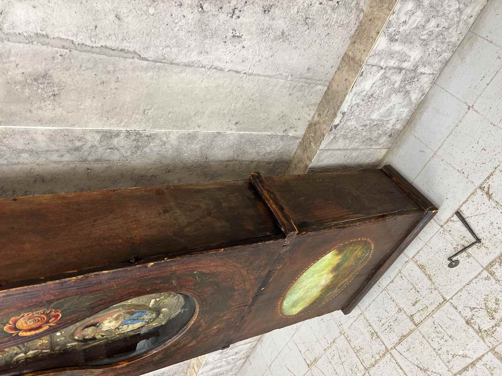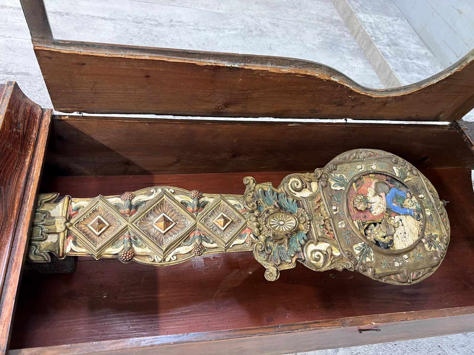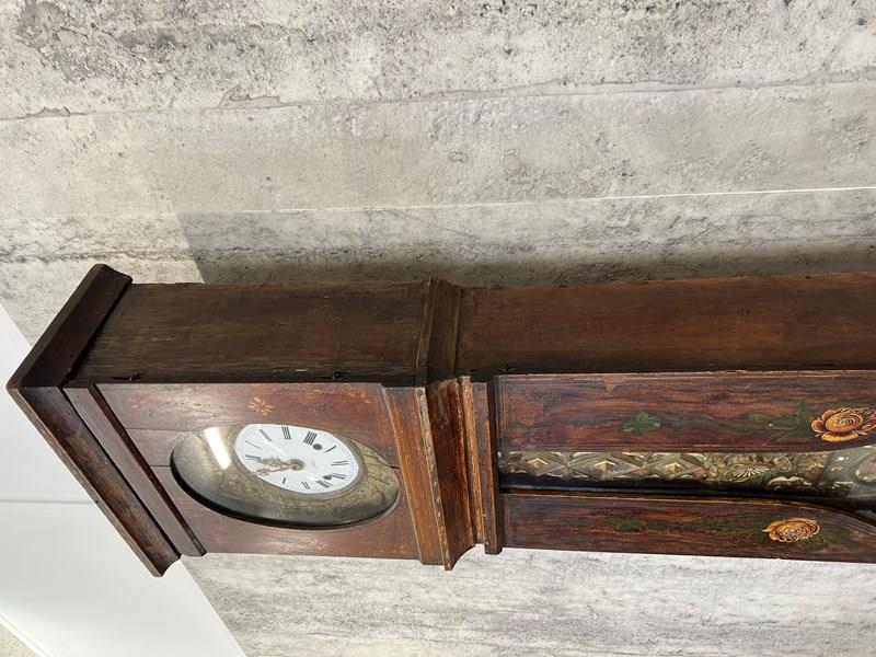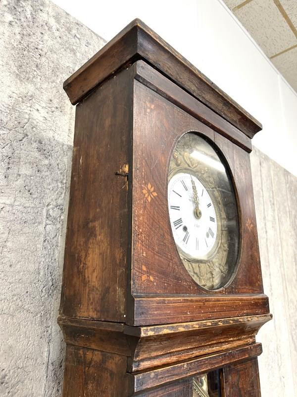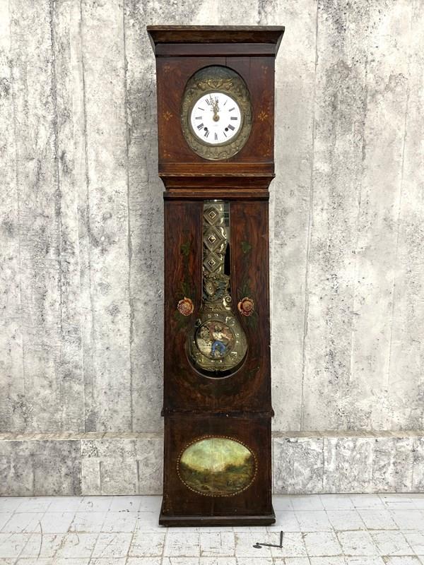 An incredible clock. From the Haute Savoie region of France. Hand made, hand painted. In rustic and very well used condition, the case has signs of wood worm and wood rot, all of which has been treated over the years. The metal work of the mechanisms are in lovely condition.. all very well used and with the usual bashes as you would expect. The clock did work when in the home of the last family who owned the clock for the last 20 years, but it has been in storage for some years now, so we are selling as a decorative piece and if you want the clock to work and chime we would recommend that you have the piece renovated by a specialist.