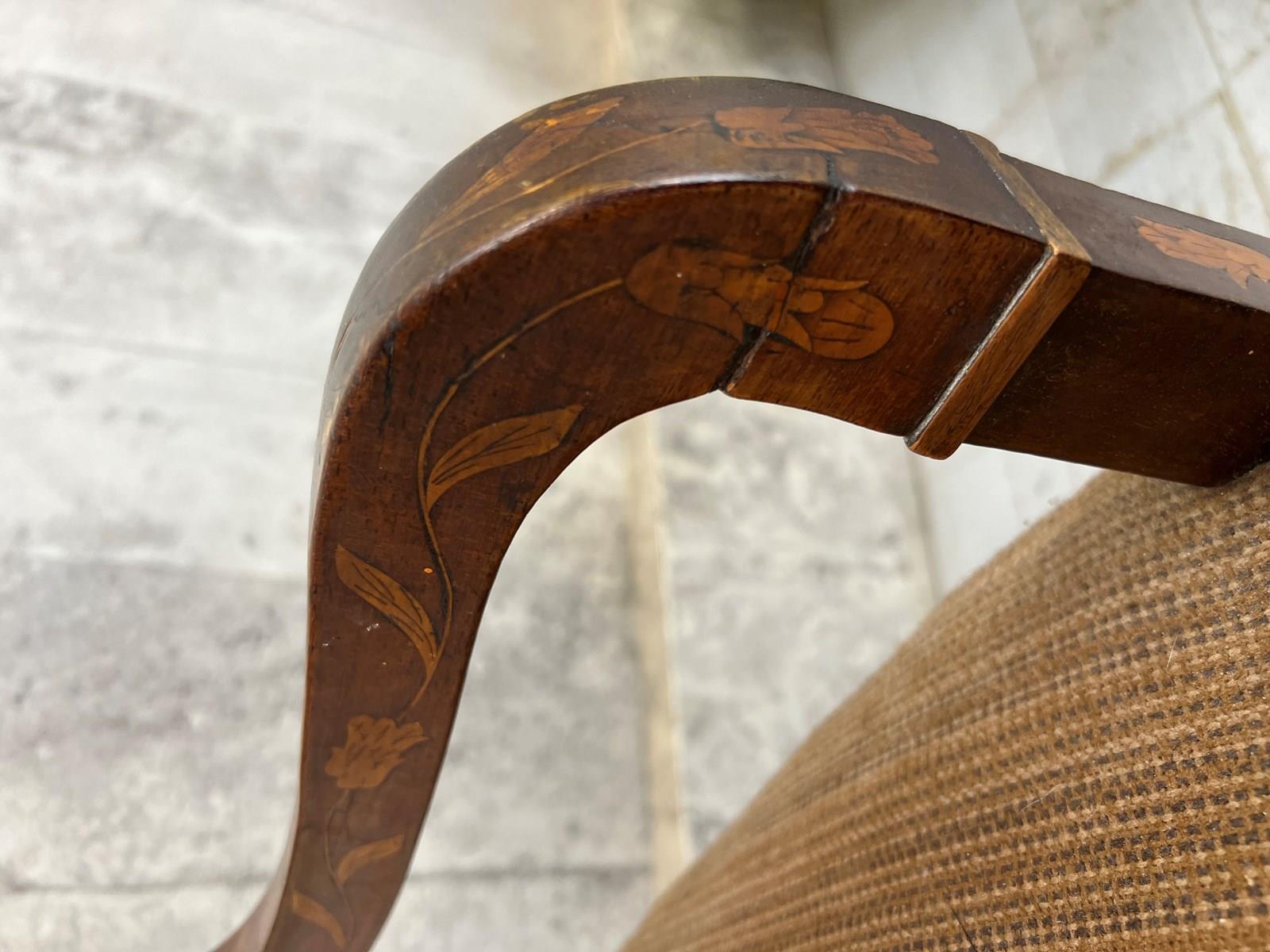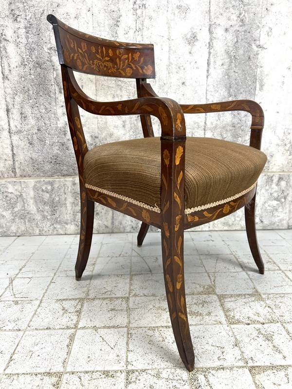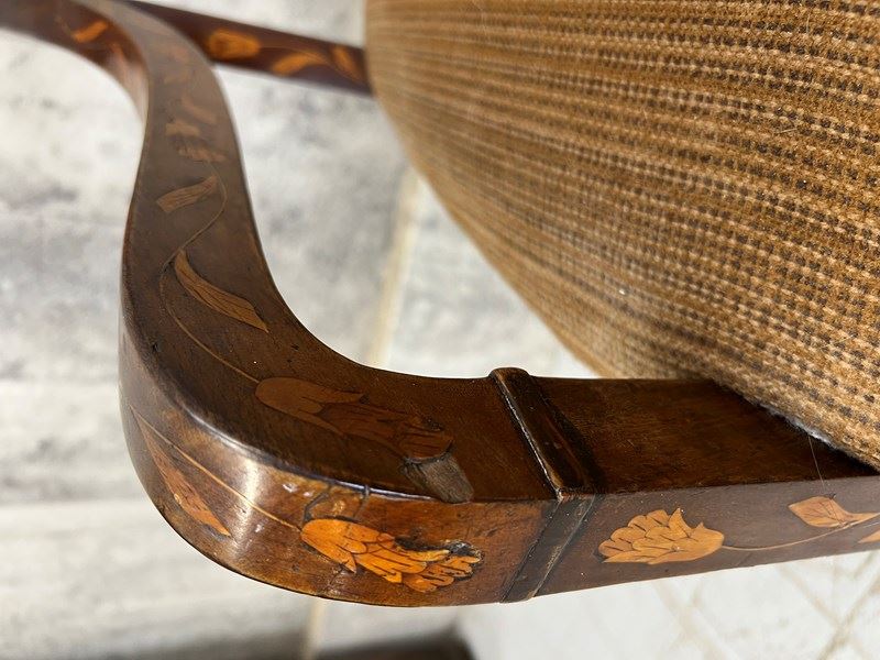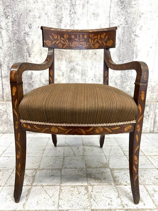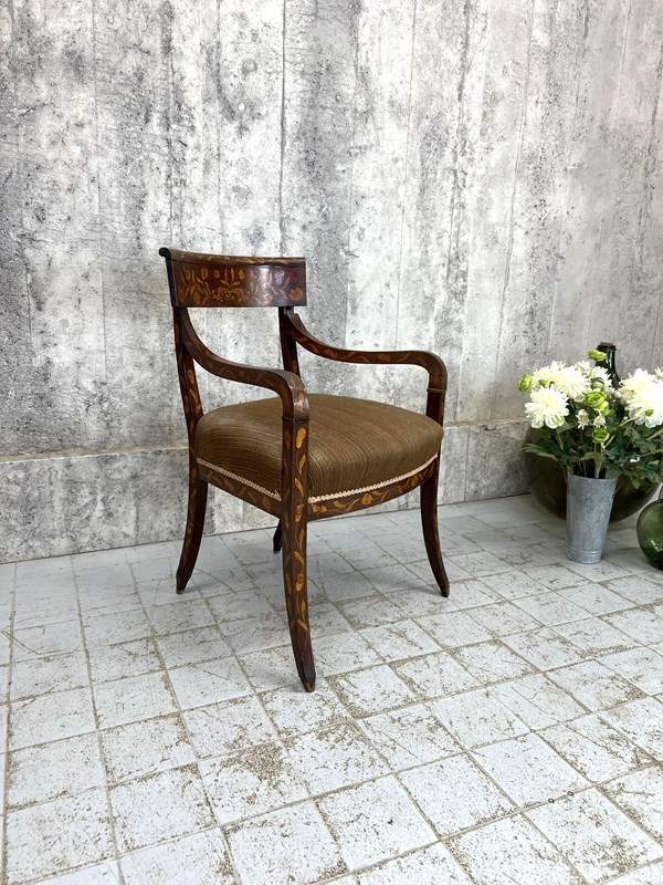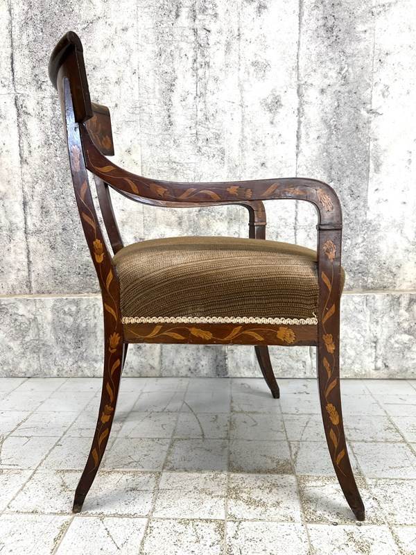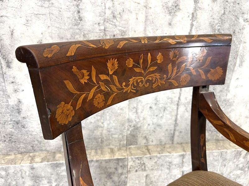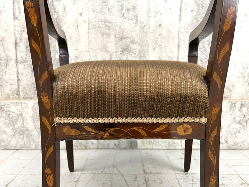 A really fabulous individual Inlaid carver, which dates from the 19th century but is a copy of an older style of chair. A upholstered sprung seat pad that would benefit from being reupholstered, this chair would be ideal on its own, dressing a corner or a room, or at a desk, or married with either black or traditional wooden bistro chairs at a dining room table. The chair has damage and parts missing, but overall is strong and sturdy and suitable to use as it is. The legs have been extended, way back in the day but very sympathetically, but you can see the join. If you are looking for perfect please do not buy this chair. It has ancient damage but to us, this adds to the character.