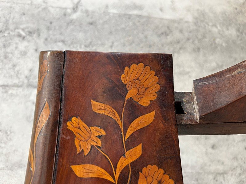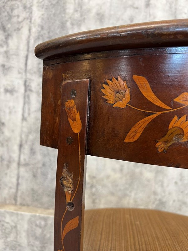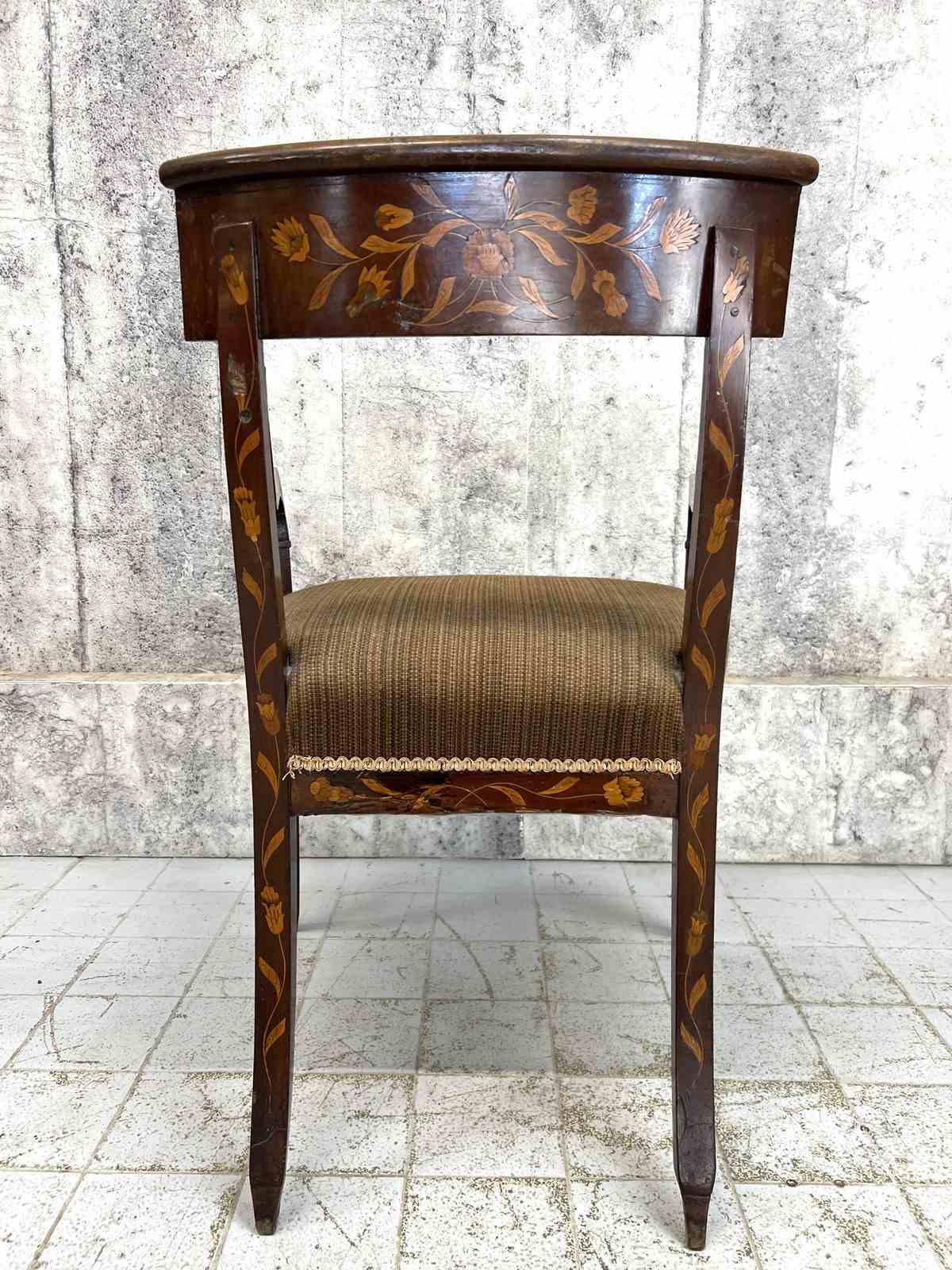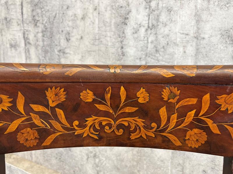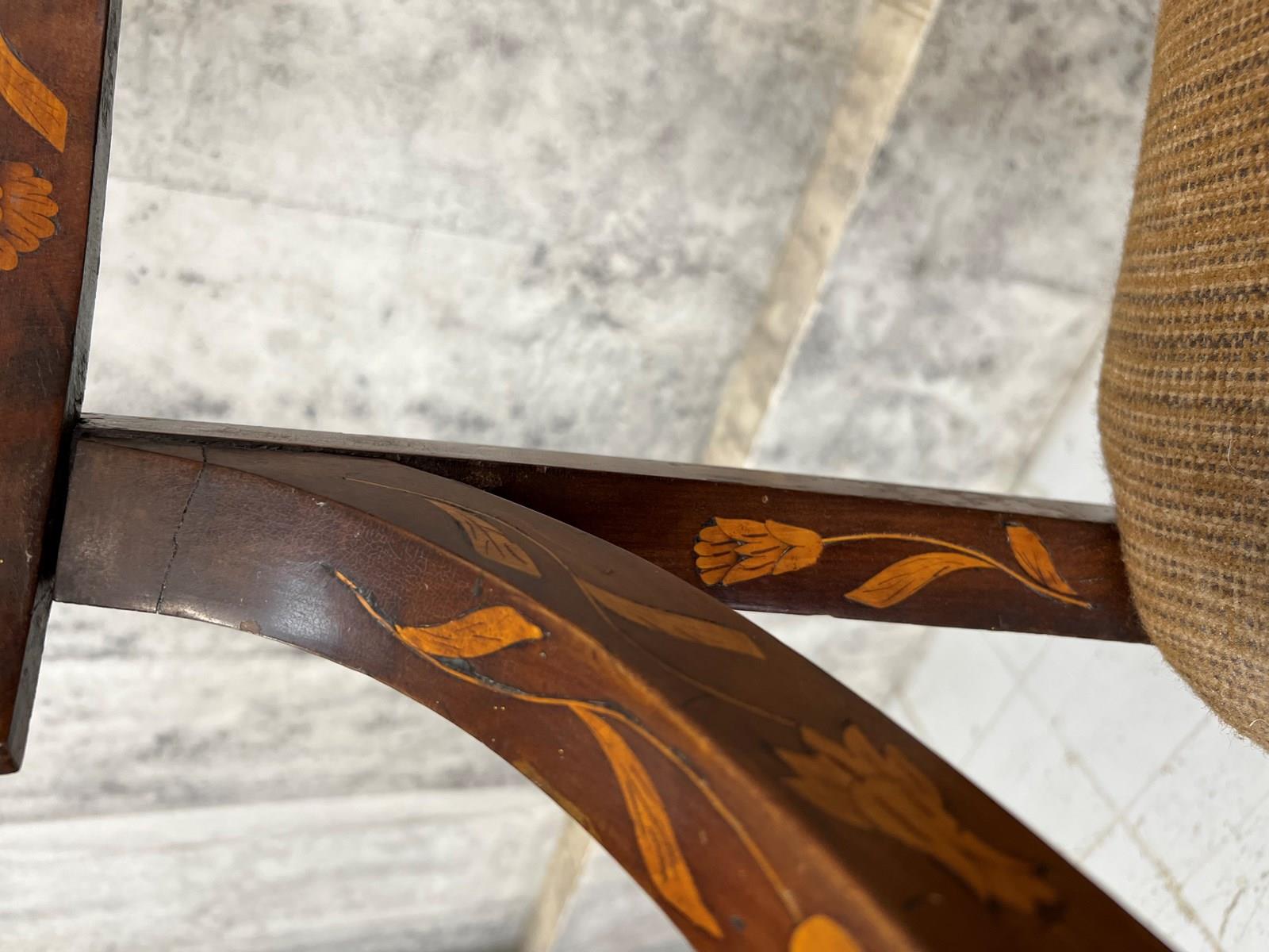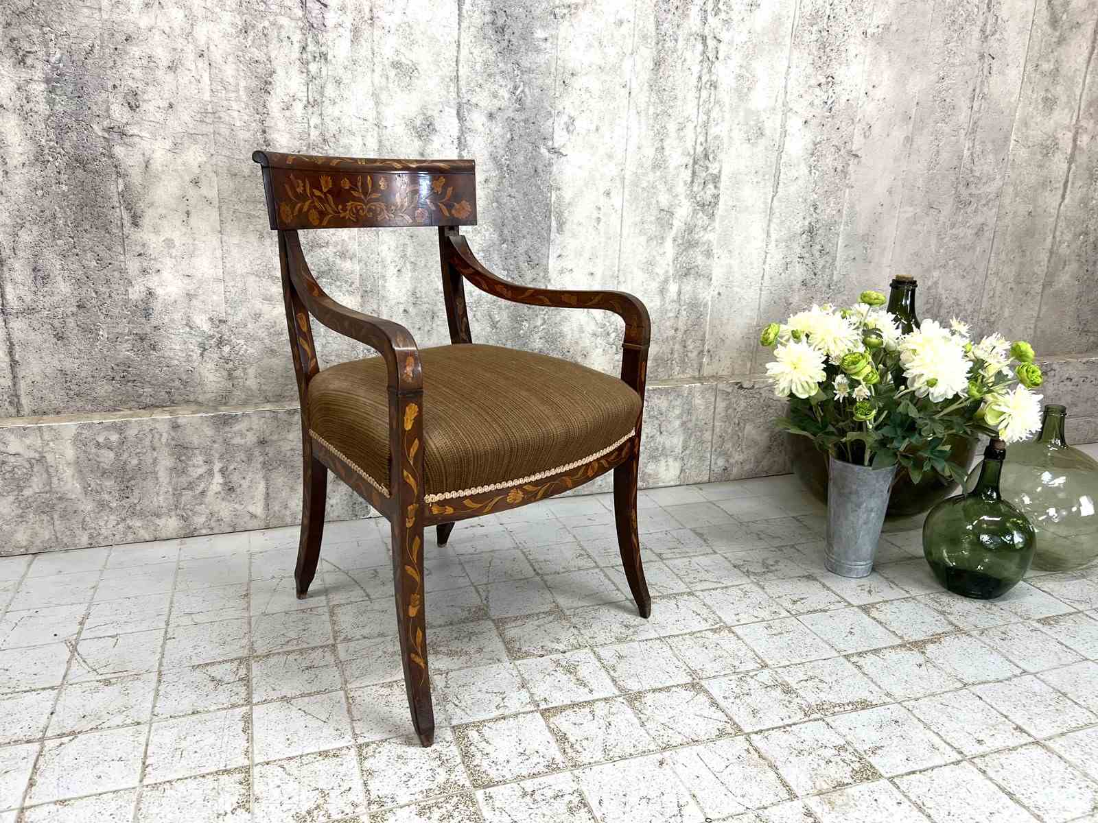 A really fabulous individual Inlaid carver, which dates from the 19th century but is a copy of an older style of chair. A upholstered sprung seat pad that would benefit from being reupholstered, this chair would be ideal on its own, dressing a corner or a room, or at a desk, or married with either black or traditional wooden bistro chairs at a dining room table. The chair has damage and parts missing, but overall is strong and sturdy and suitable to use as it is. The legs have been extended, way back in the day but very sympathetically, but you can see the join. If you are looking for perfect please do not buy this chair. It has ancient damage but to us, this adds to the character.