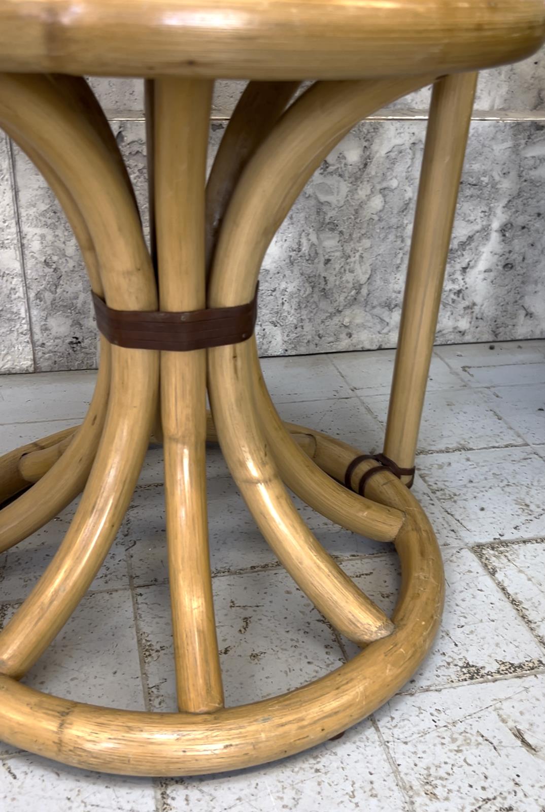 An incredible and unique mid century leather bound leather chair. More throne than chair. The bamboo is wound with leather, is in excellent condition and apart from the fabric on the seat pad which needs recovering, this chair is ready to use. Ideal in the corner of any room, adding height and character... also superb in an orangery, conservatory or garden room. Unique and quite the talking point.