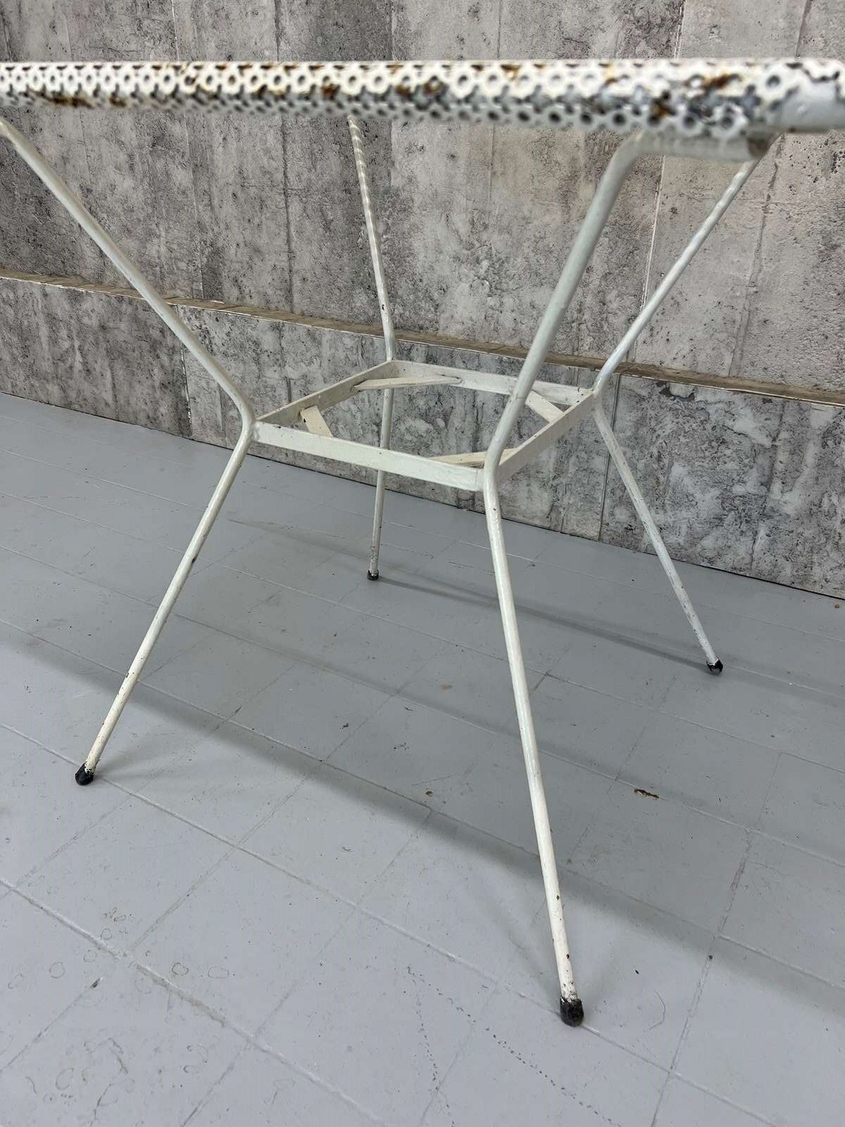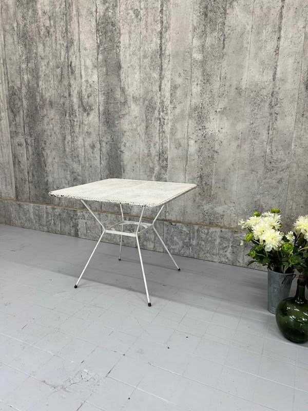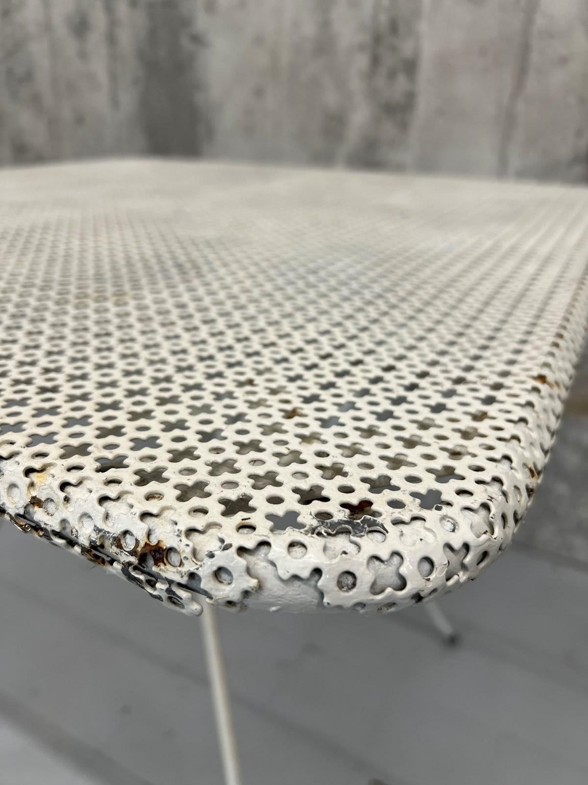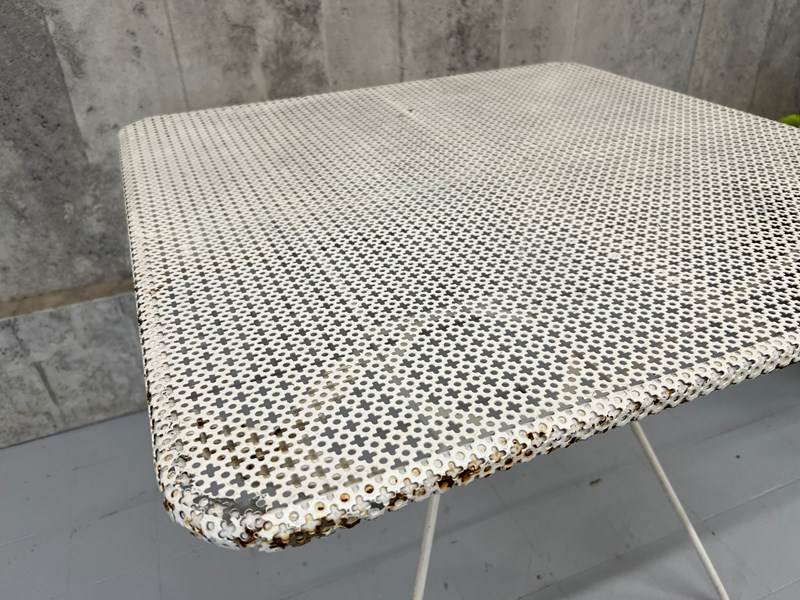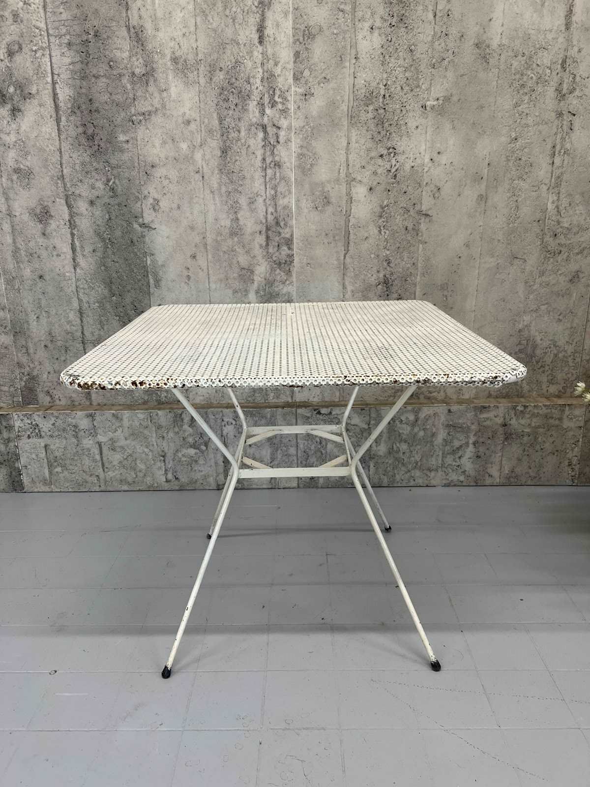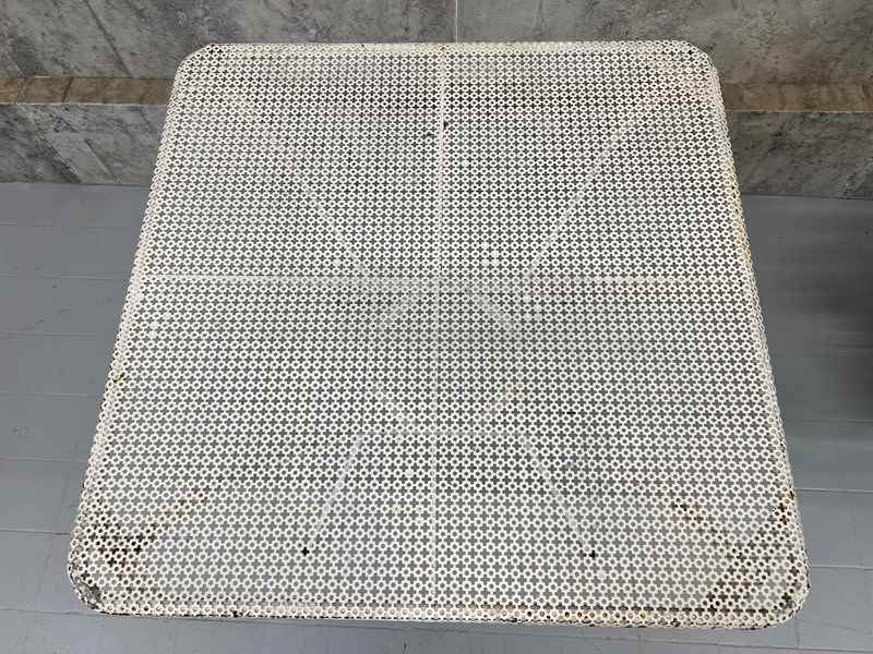 A fabulous painted white garden table with this perforated table top which makes it ideal for the 'British Summer' Marry with traditional chairs or even modern wooden chairs. In very good condition. The paint has flaked off in places and there are areas of light rust, but none that affect the structural integrity. This table is ready to use as it is.