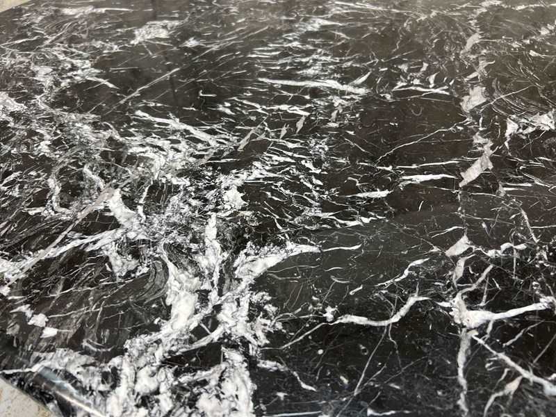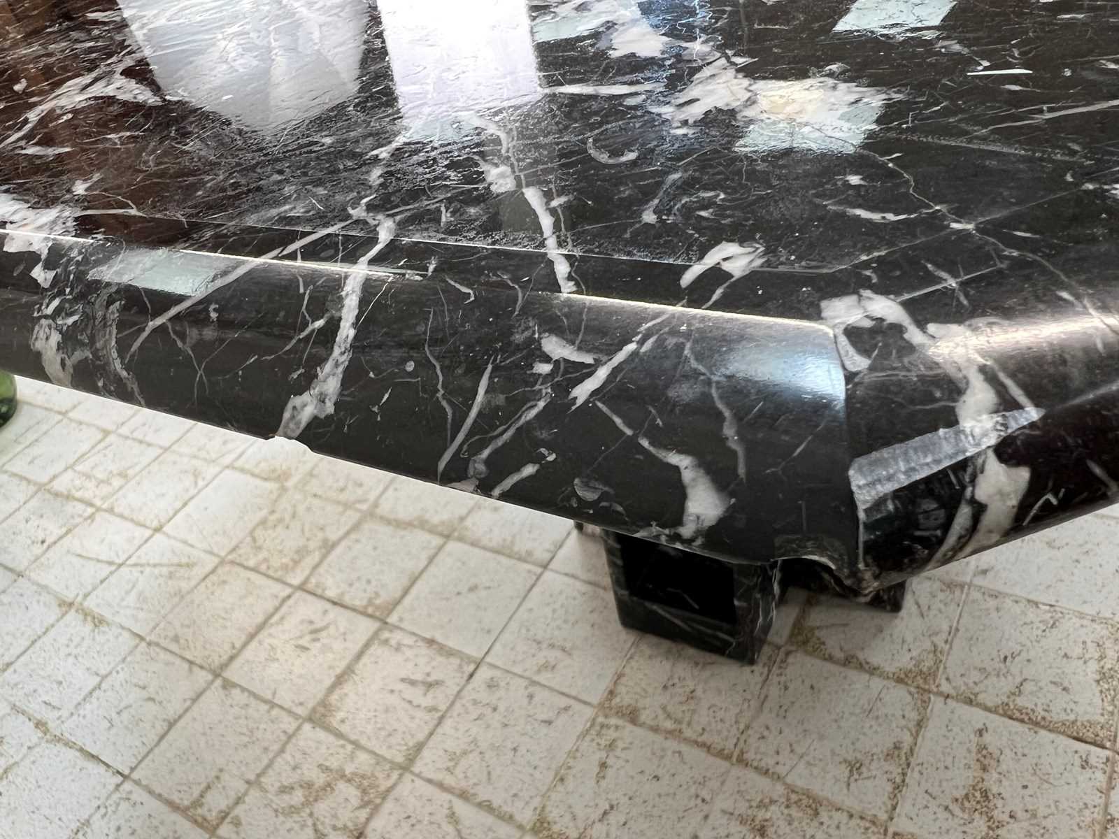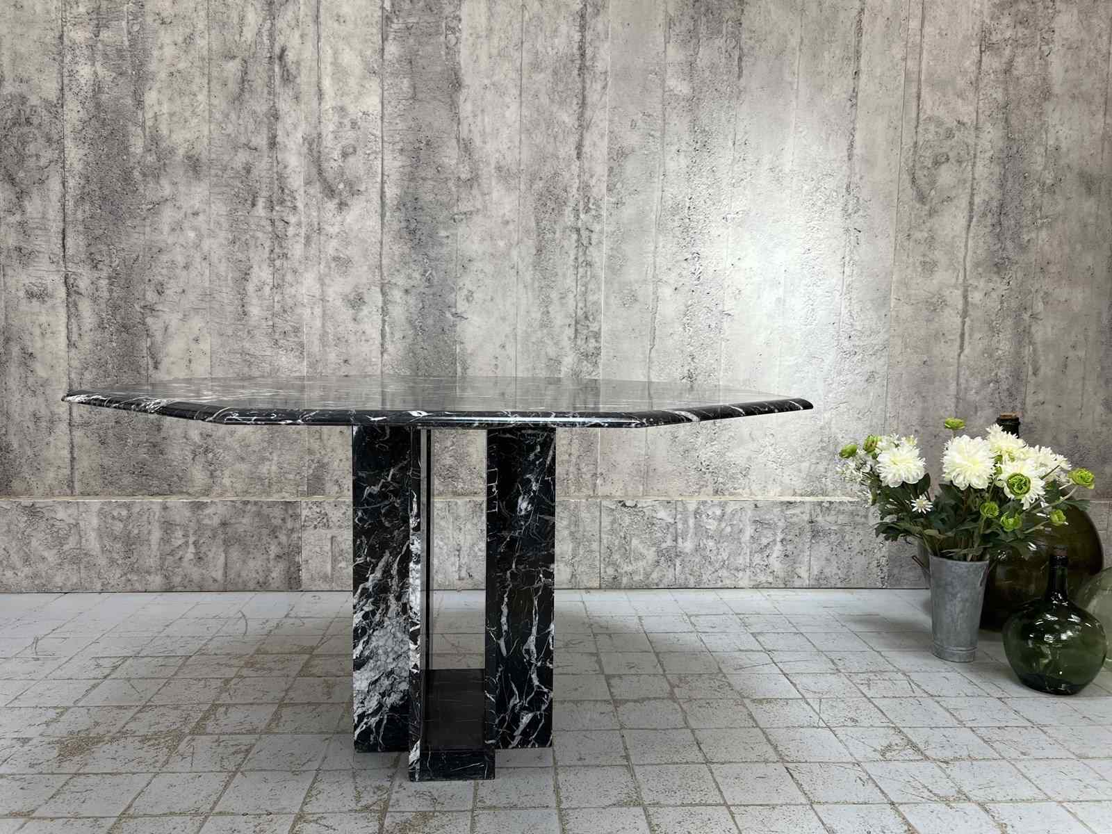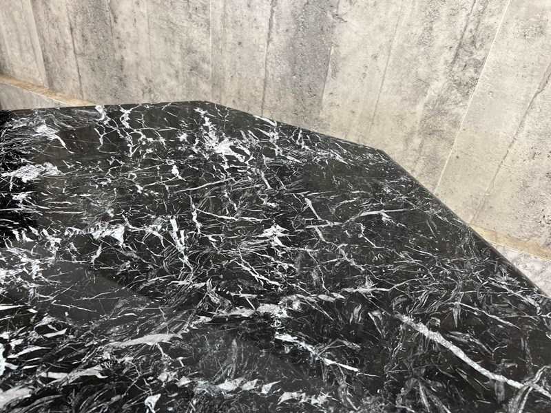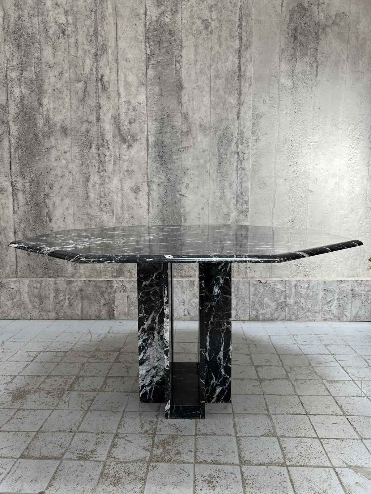 This exquisite table. A mid century Italian Hexagonal black marble with these beautiful white veins. An exceptional table in great useable condition. The marble is in excellent condition, with small signs of wear.. there are a few nicks out of the sides of the table top, but mostly to the underside.. I have photographed each on that I was able to find, but due to the colour, they are very discreet. see photo. The table is very heavy. The marble top is detachable from the base so it is easier to move about. Ideal to use as a central table in a hallway or as a dining table.. each of the sides will comfortably seat one person. 8 in total.
