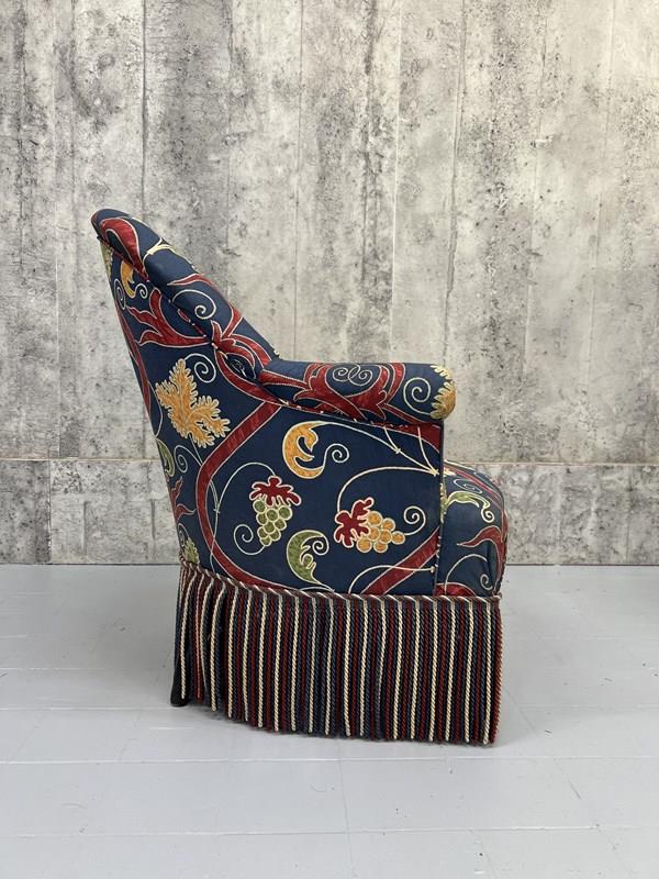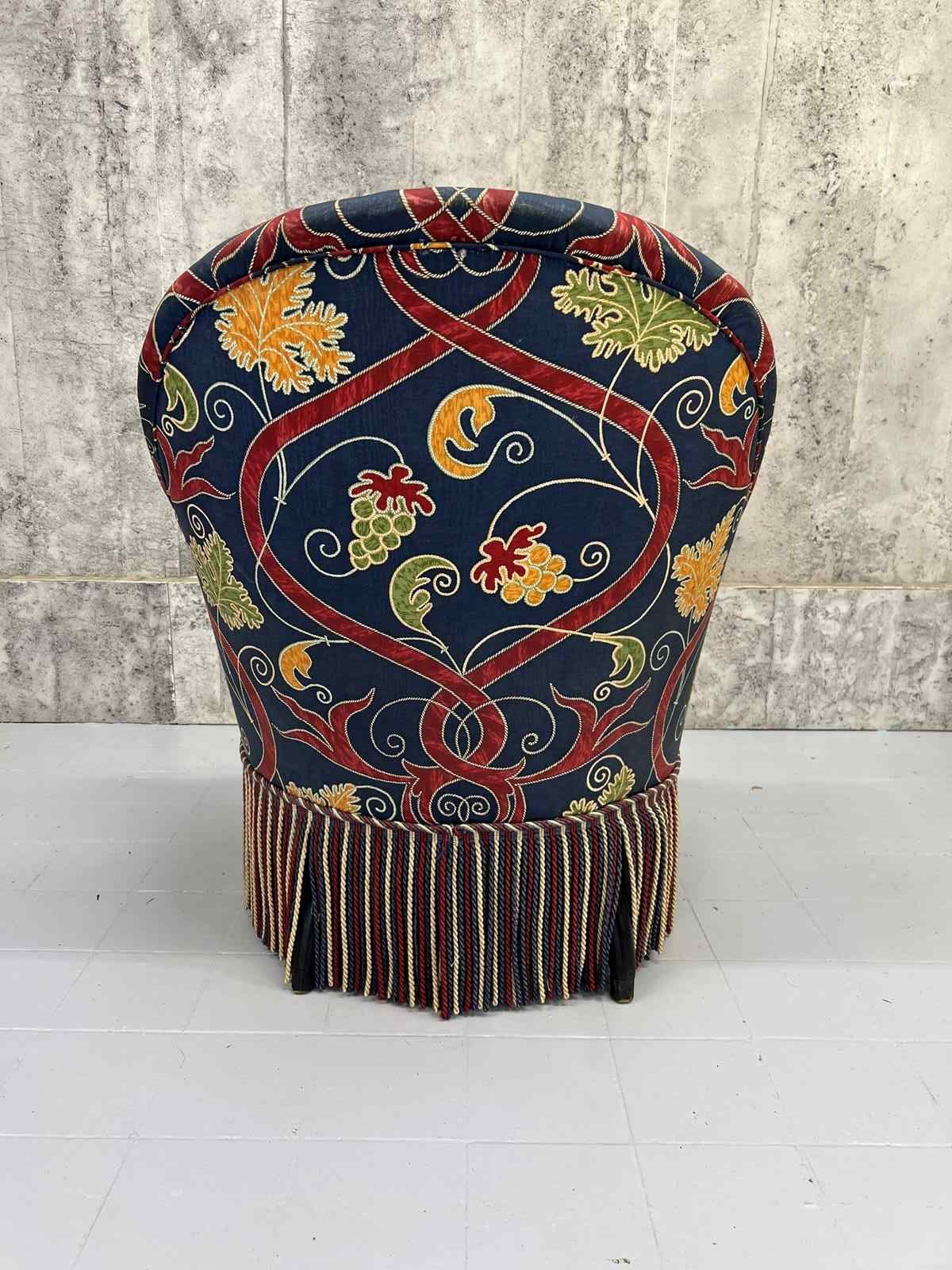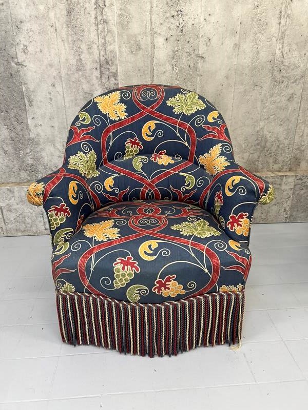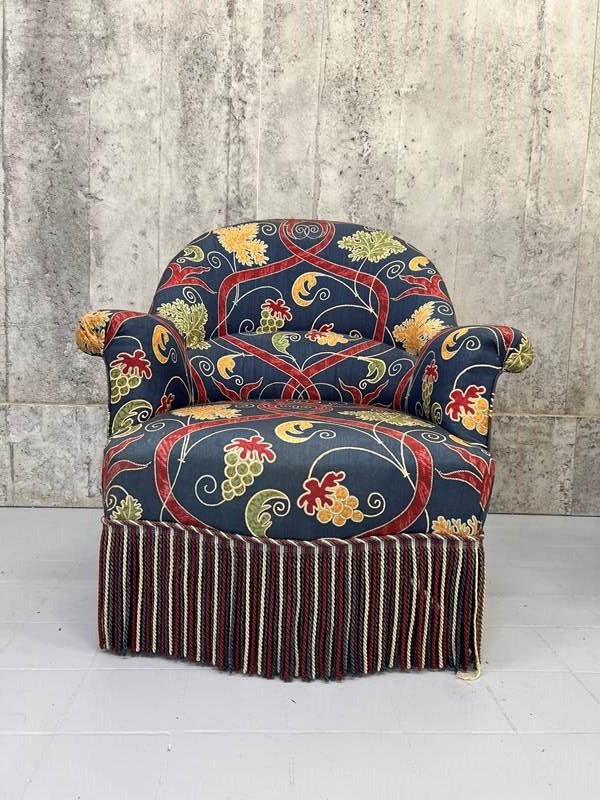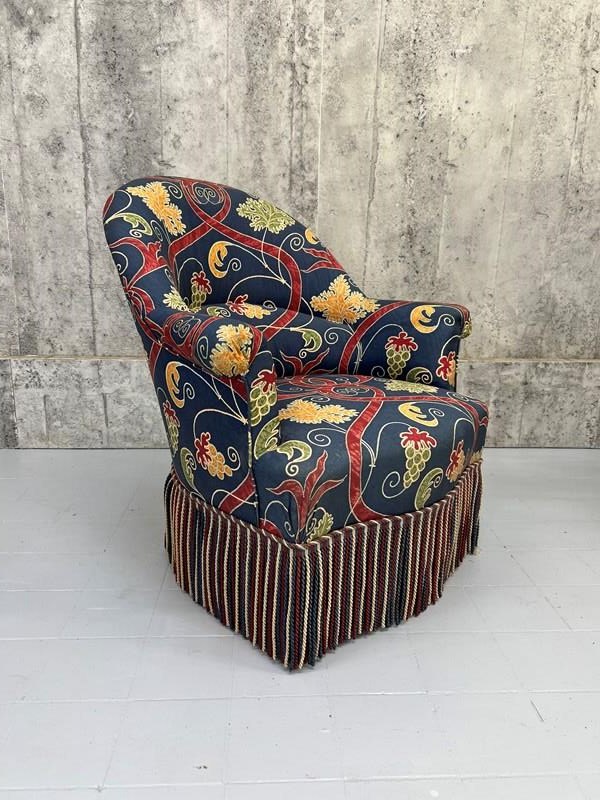 A fabulous example of the Crapaud style tub chair, a classic French seat shape. With carved ebonsied legs, this example is in good condition. The fabric is a 1980's cotton, which we recommend would be replaced, so we have priced accordingly.